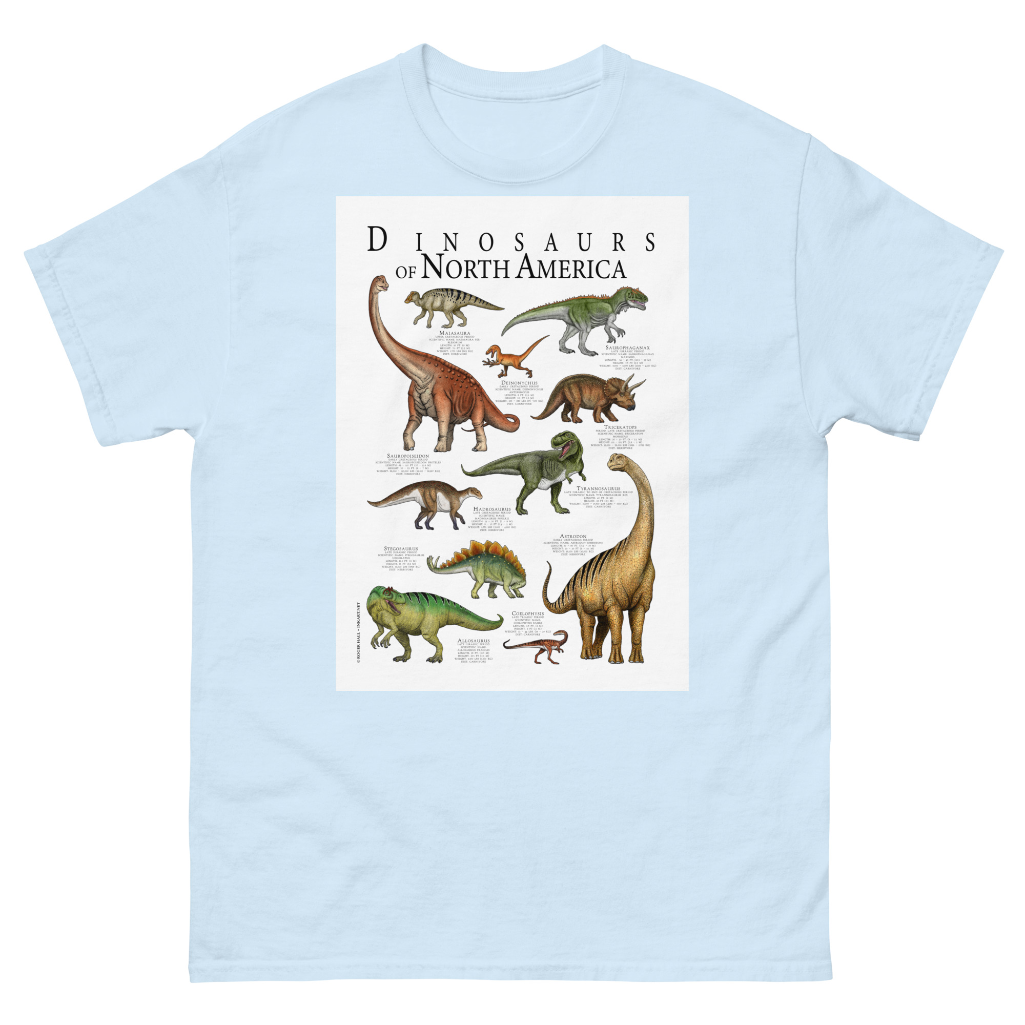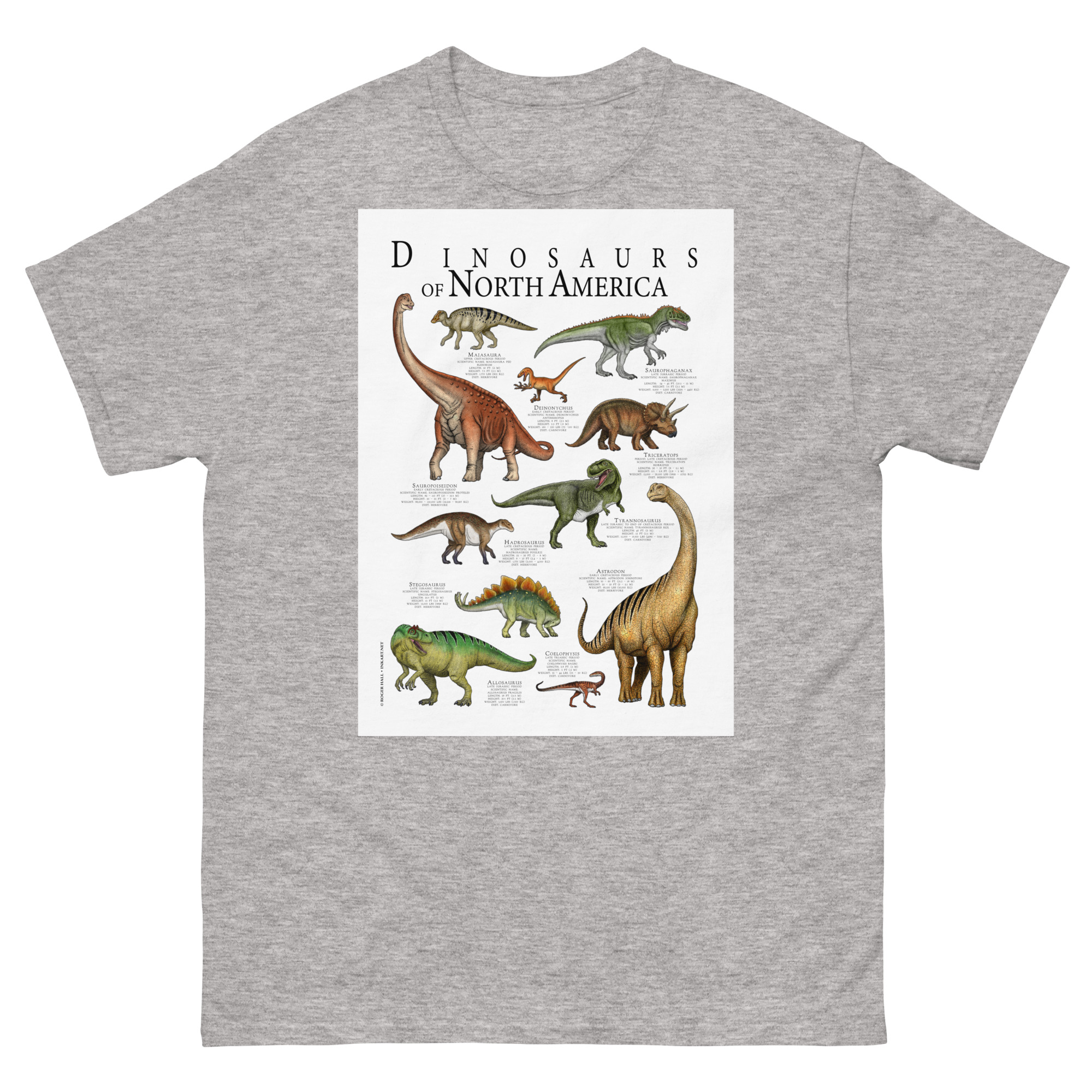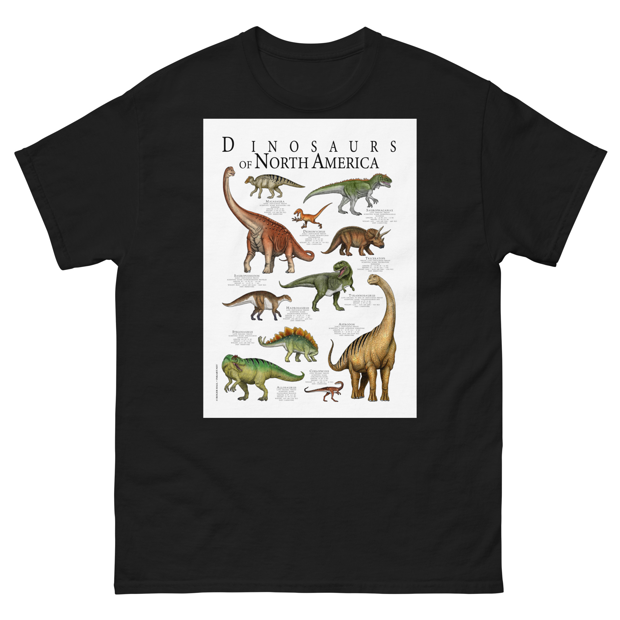 Fine art poster art featuring various species of dinosaur that were native to what is today North America printed on a high-quality 100% men’s cotton t-shirt.