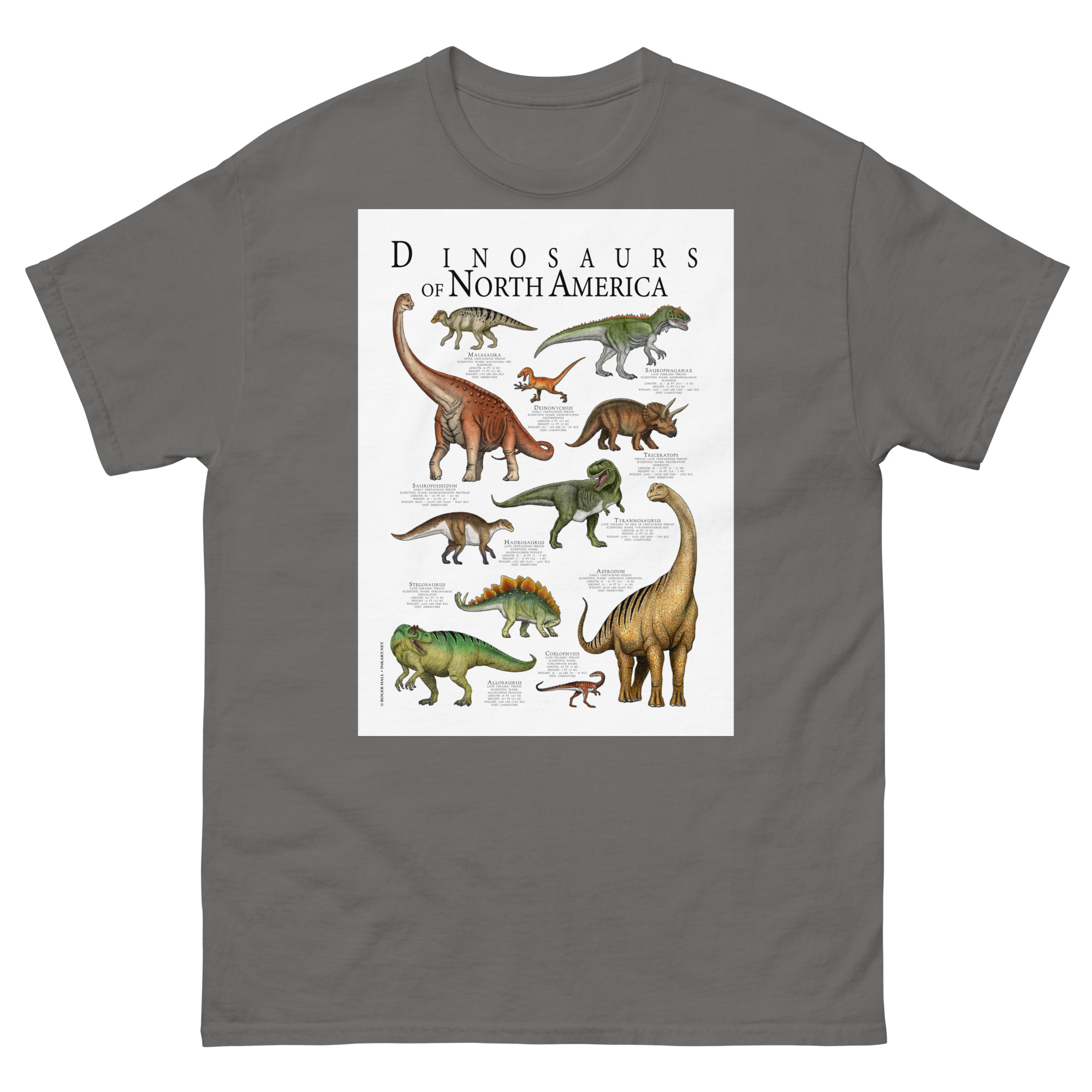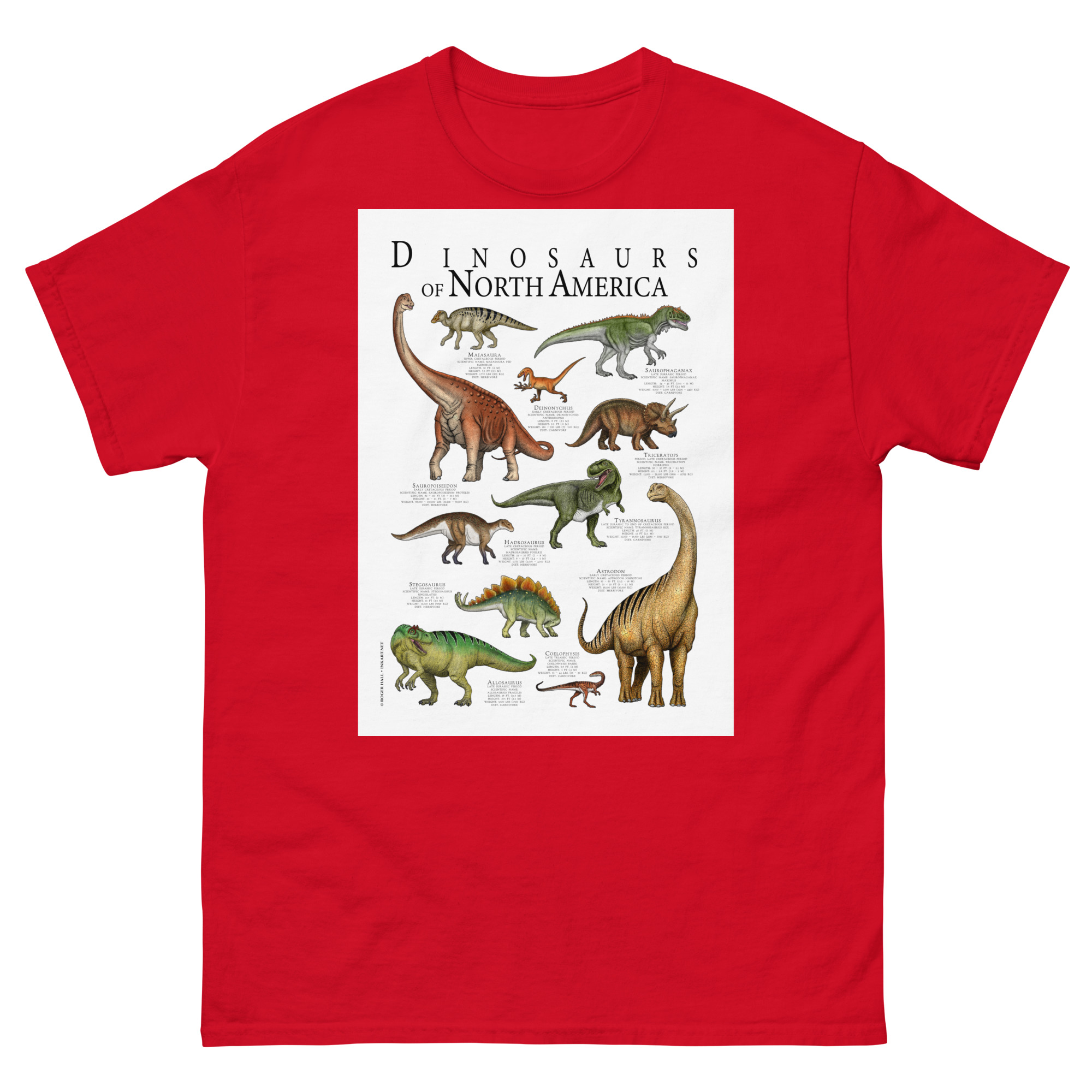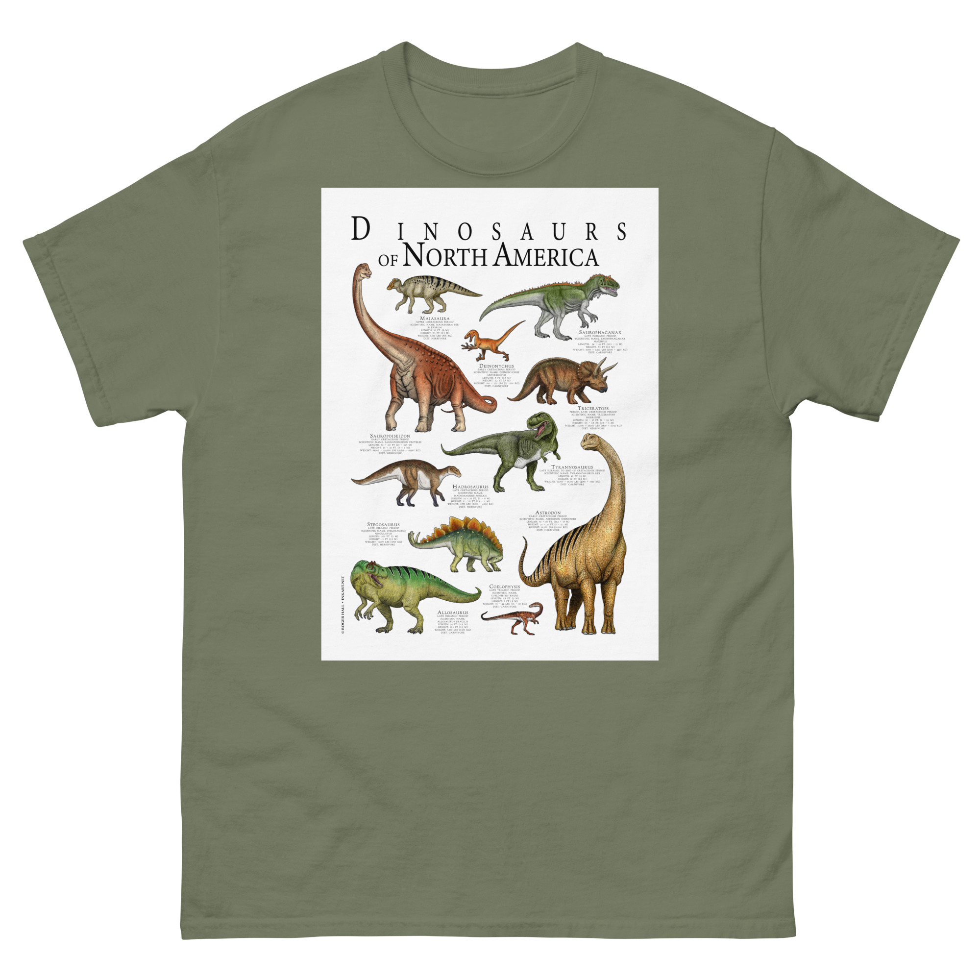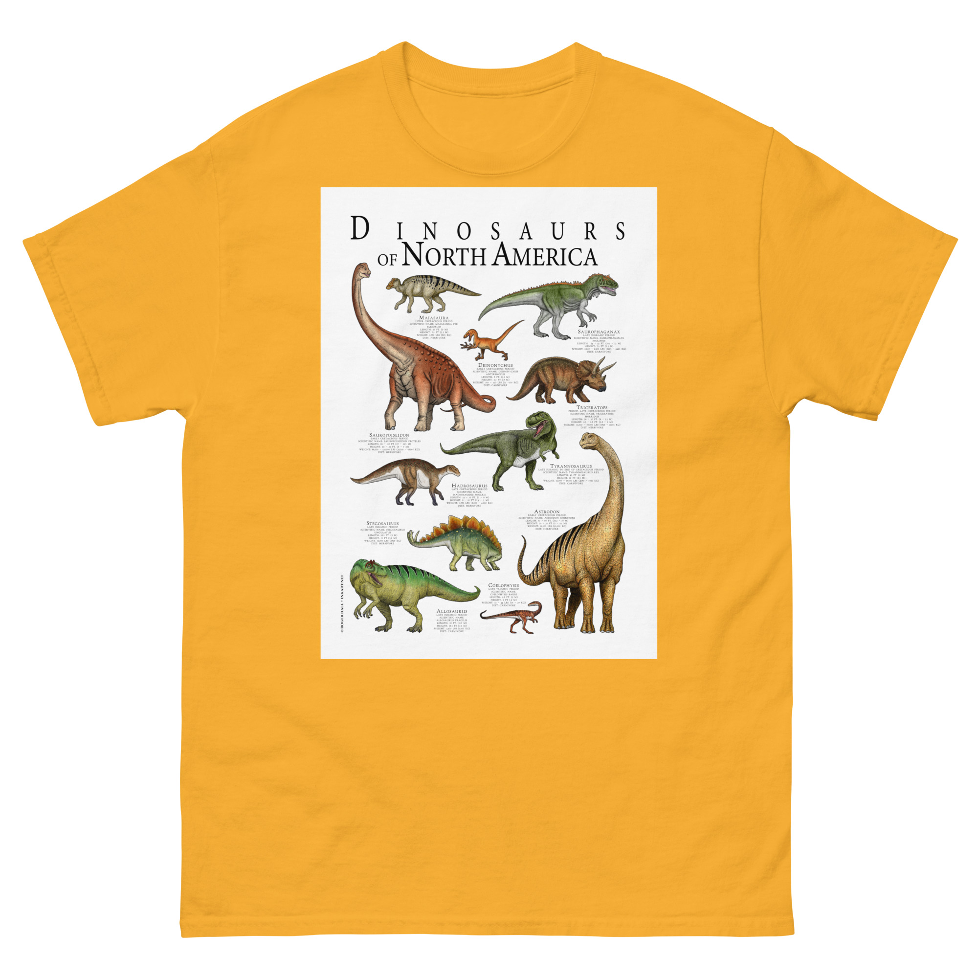 Fine art poster art featuring various species of dinosaur that were native to what is today North America printed on a high-quality 100% men’s cotton t-shirt.