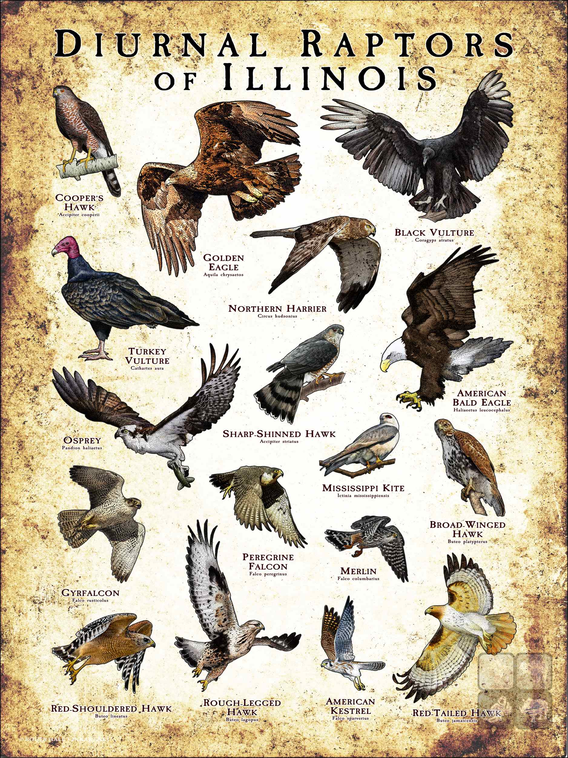 The US state of Illinois has several different native species of diurnal (active during the daytime) raptors. Here are all native species printed on a colorful, high quality poster. All images are drawn beautifully and with amazing scientific accuracy.