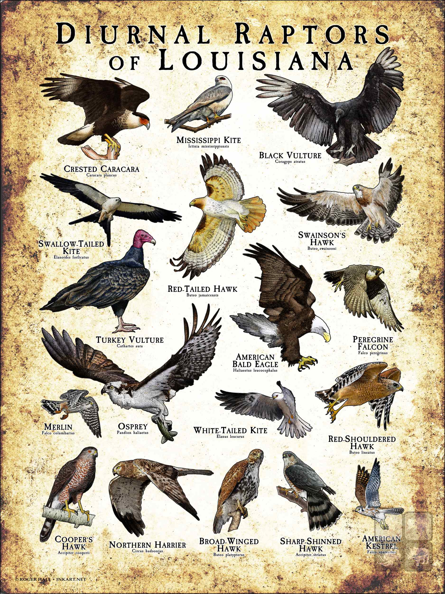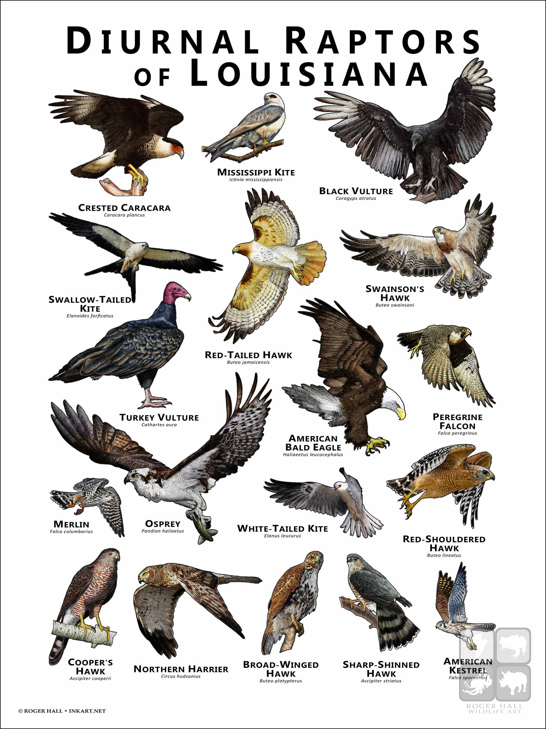 The US state of Louisiana has several different native species of diurnal (active during the daytime) raptors. Here are all native species printed on a colorful, high quality poster. All images are drawn beautifully and with amazing scientific accuracy.
