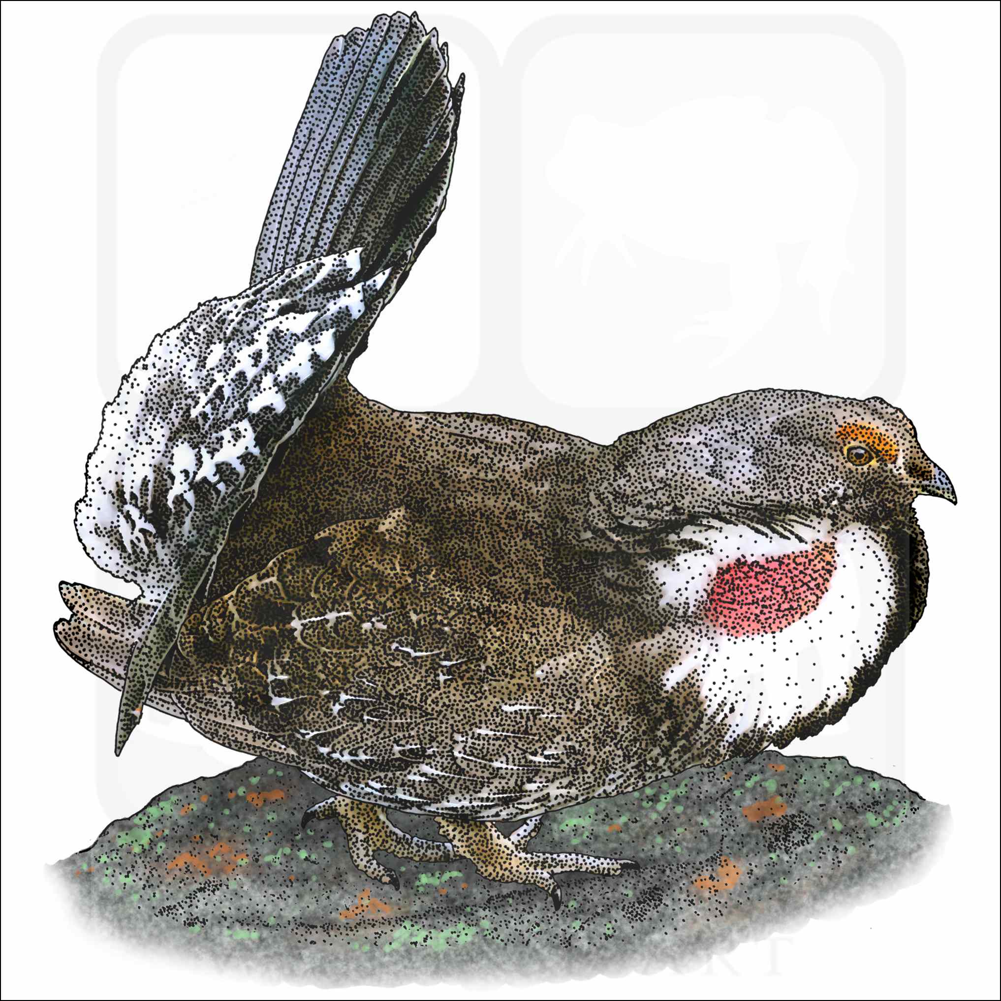 Fine art illustration of a Dusky Grouse (Dendragapus obscurus.) The illustration is available in black and white or color.
