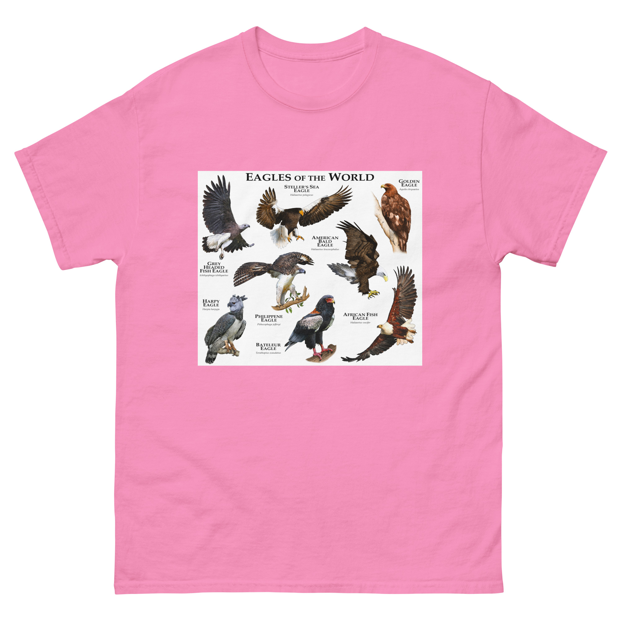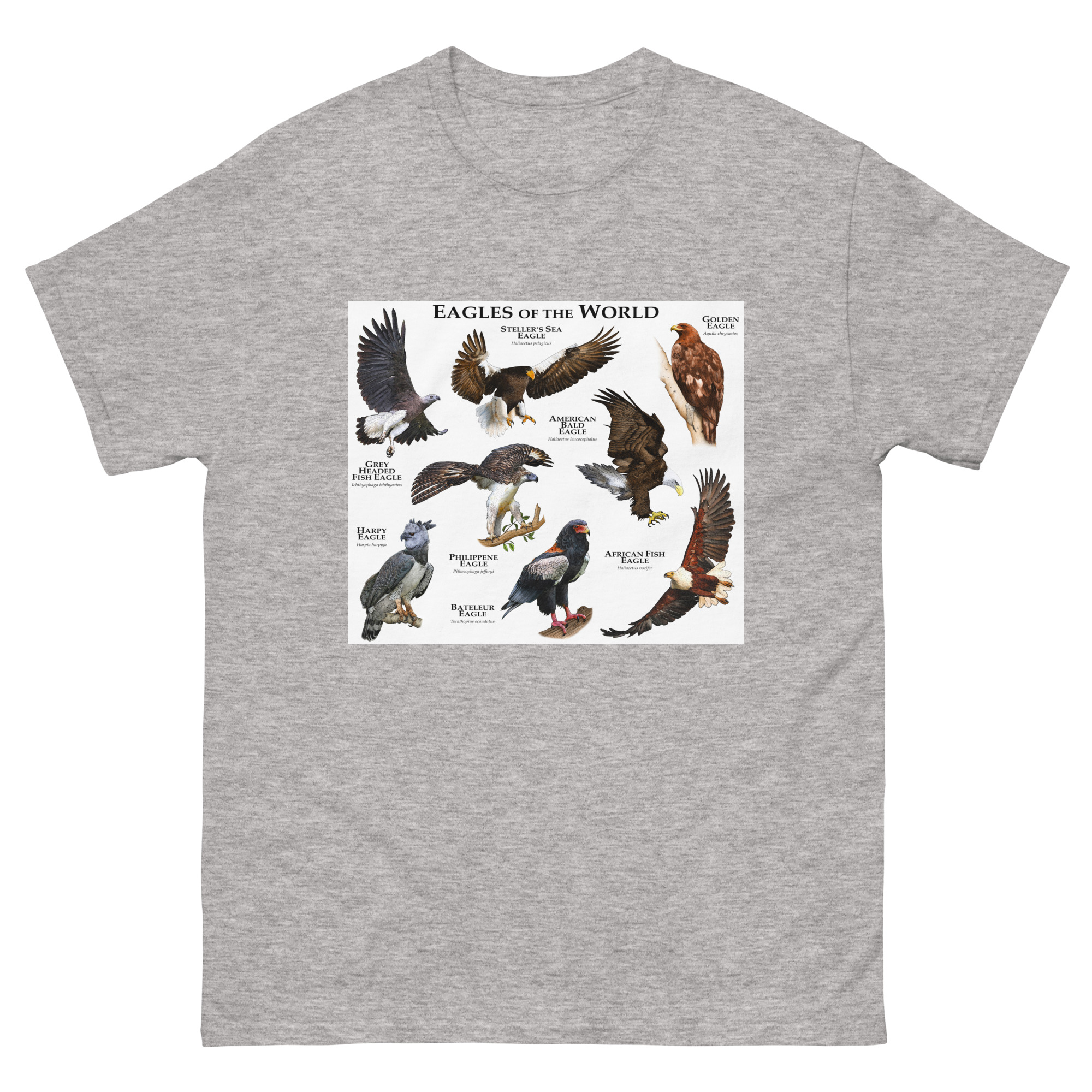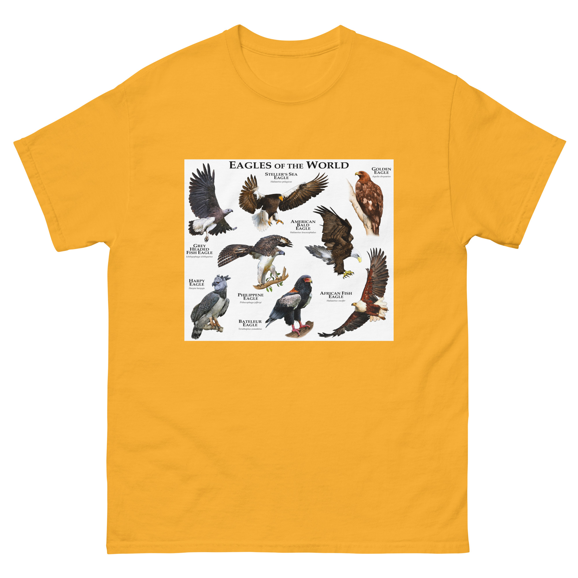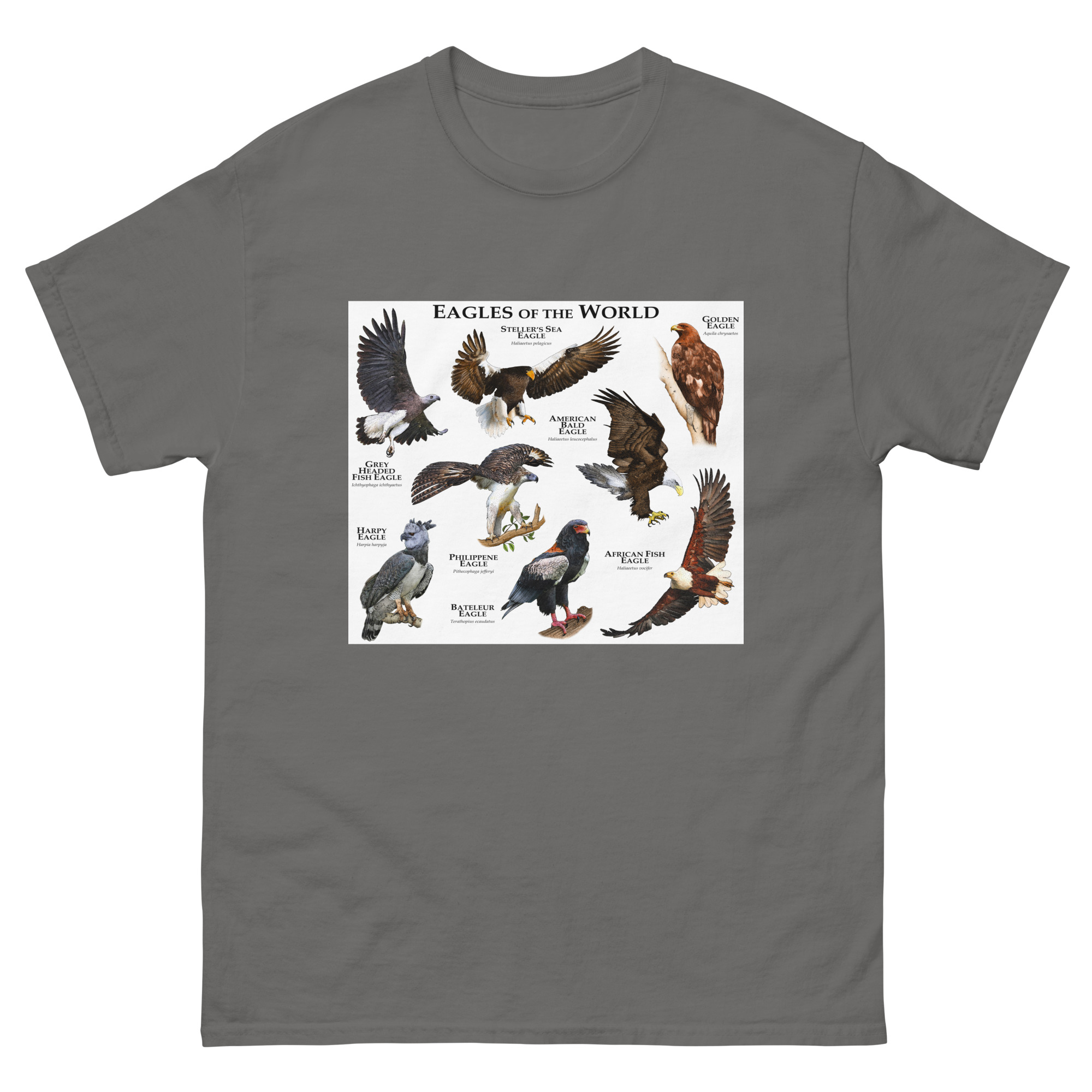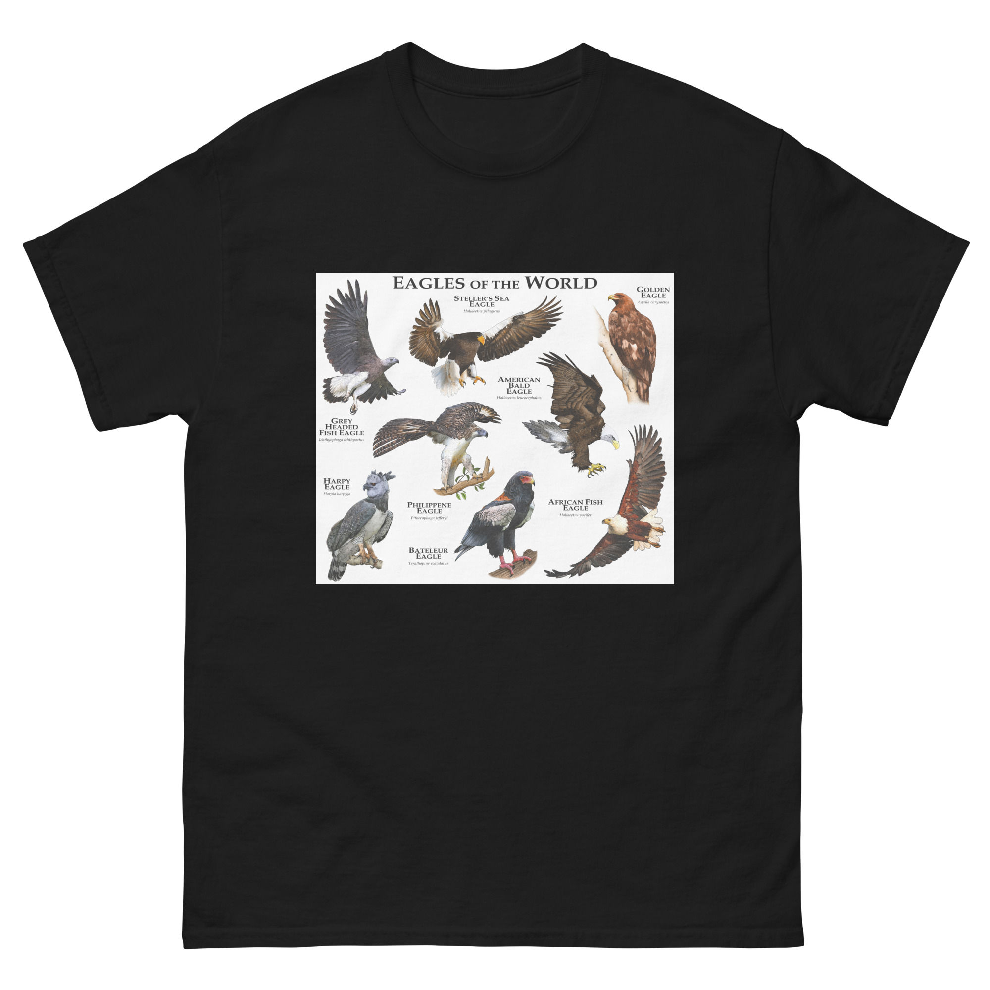 There are about 60 species of eagles in the world. Most of these live in Eurasia and Africa. The largest eagles are the Steller’s Sea Eagle and the Harpy Eagle. This image features fine art illustrations of various species of eagles printed on a high=quality 100% cotton men’s t-shirt
