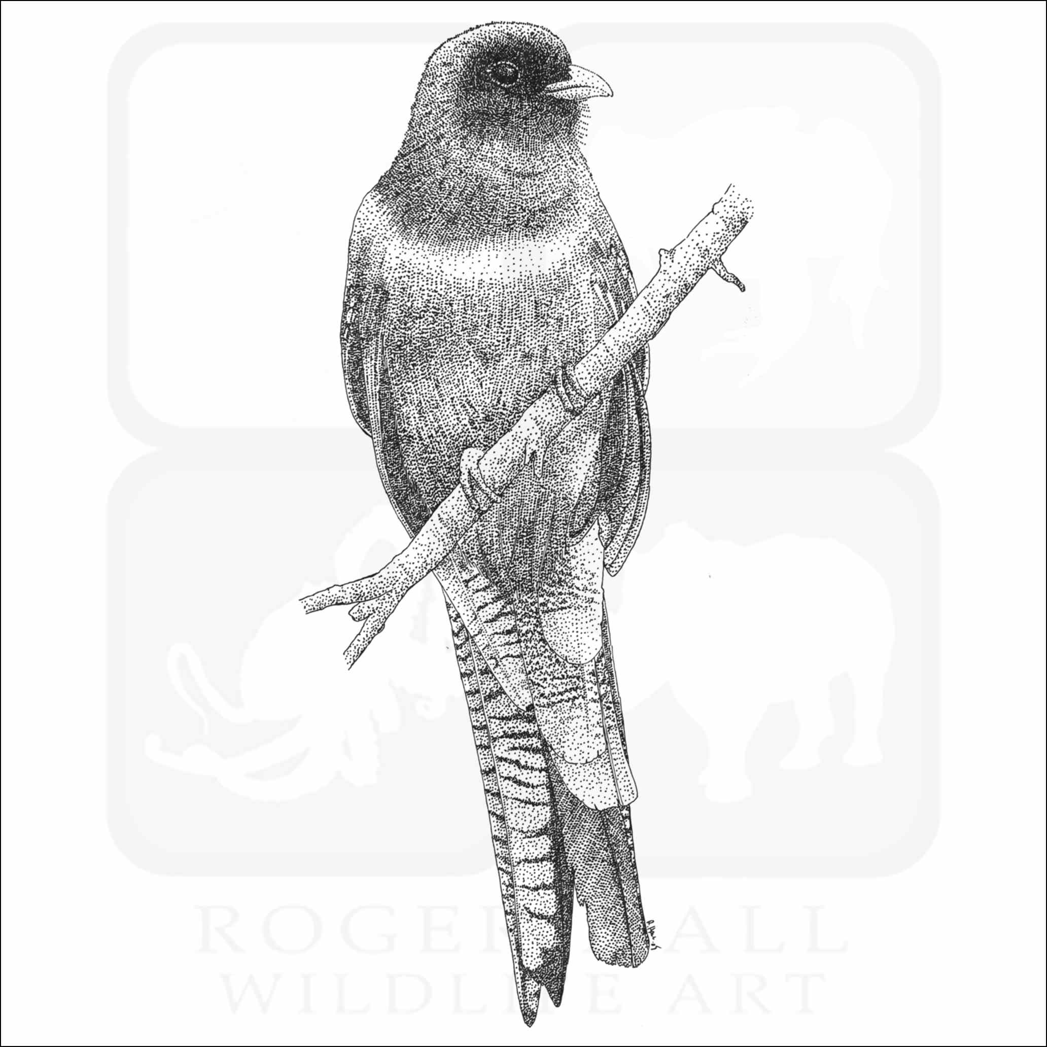 Fine art illustration of an Elegant Trogon (Trogon elegans.) The illustration is available in black and white or color.