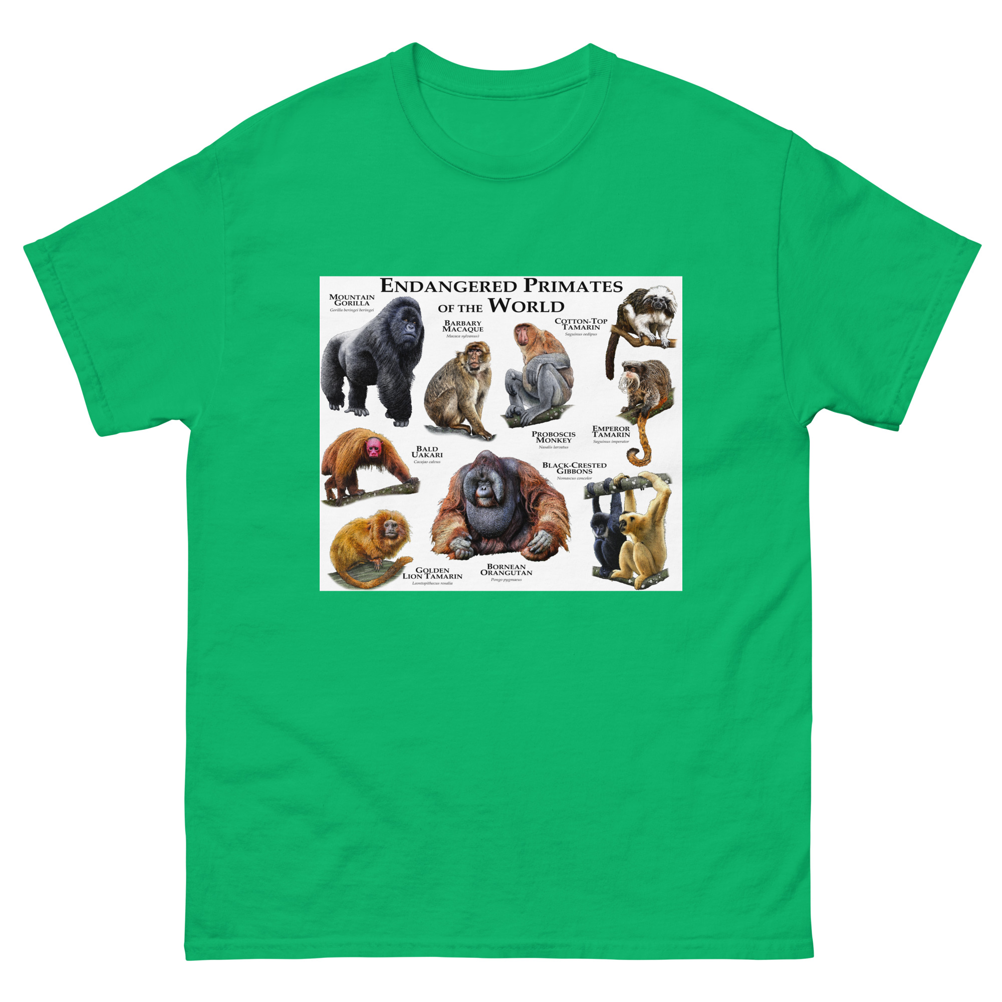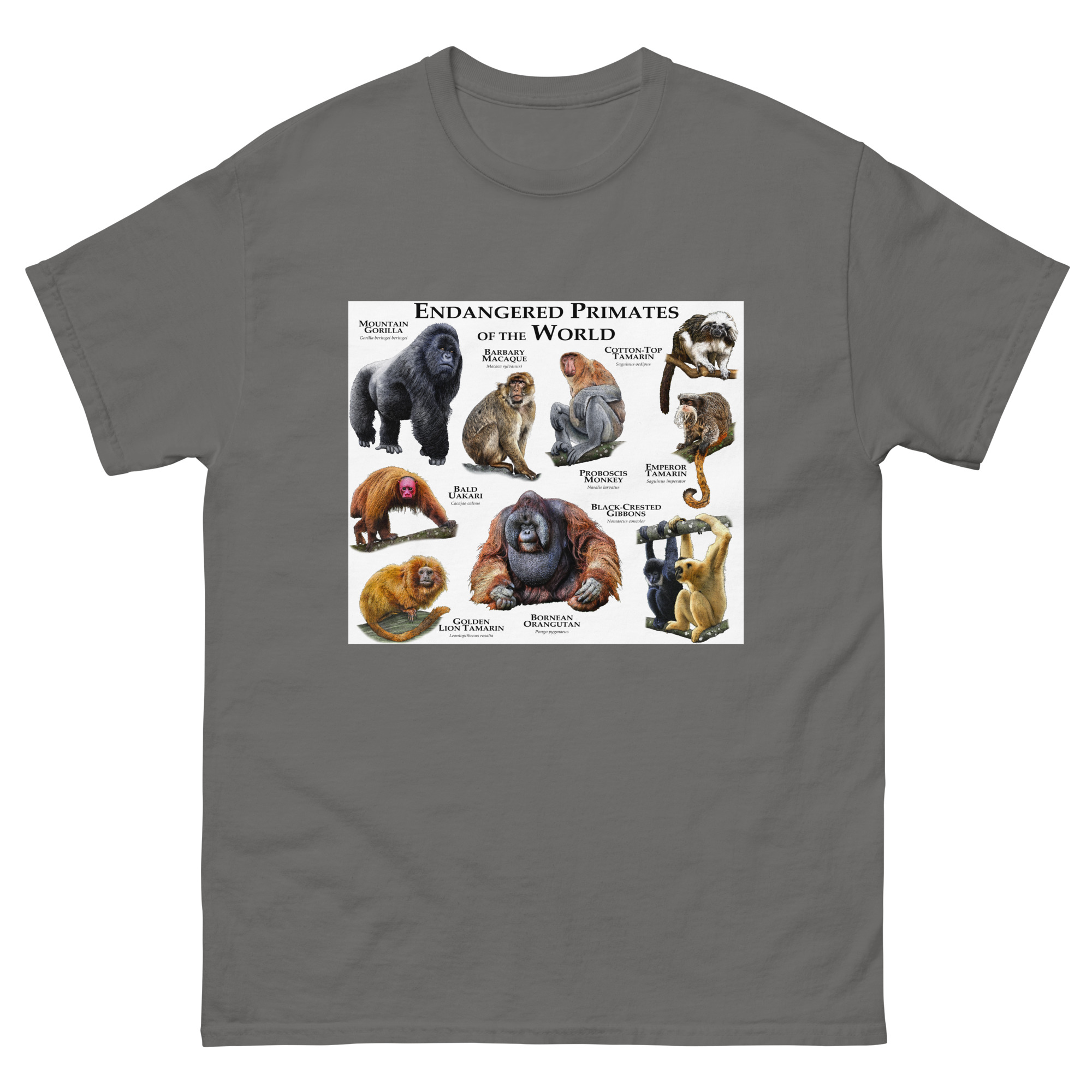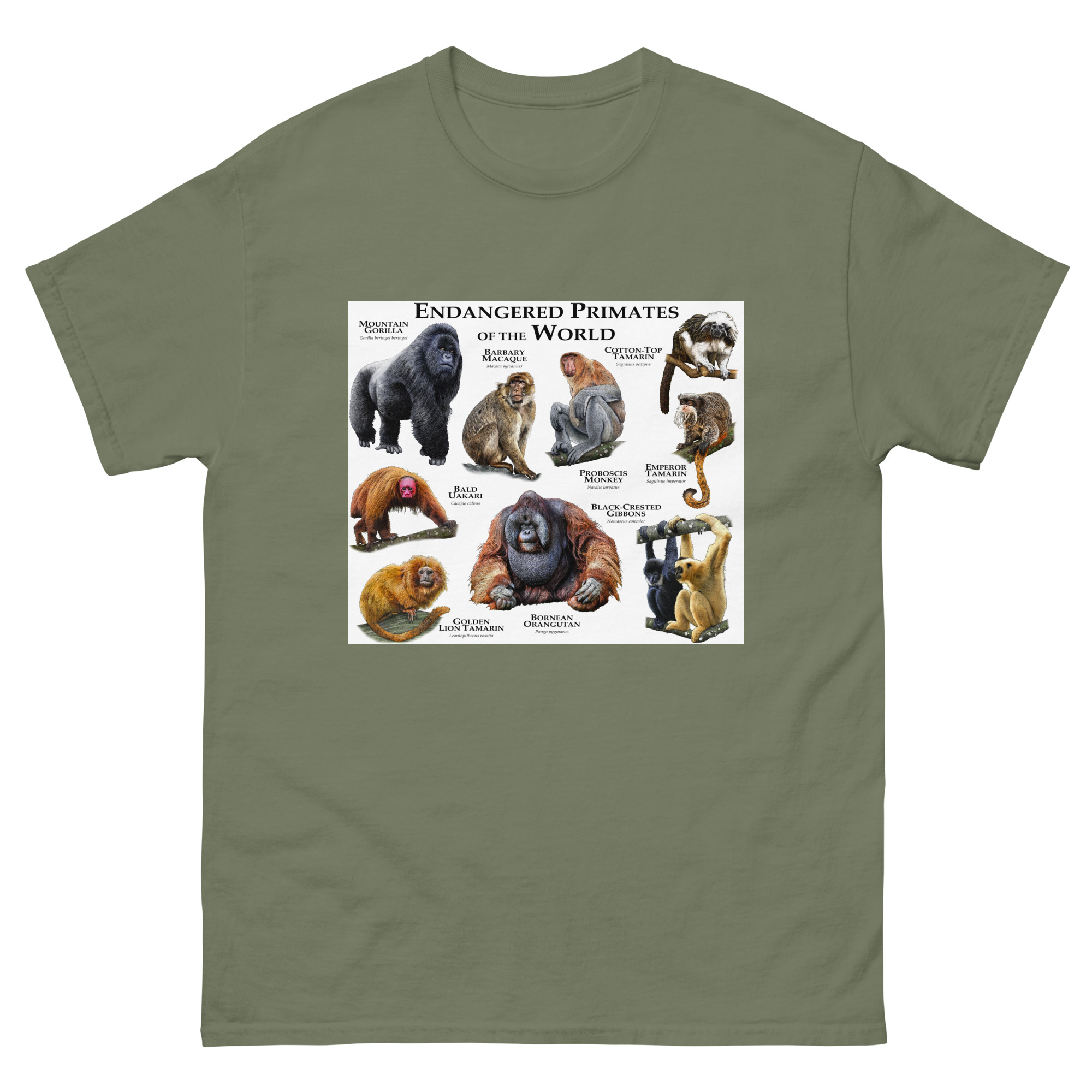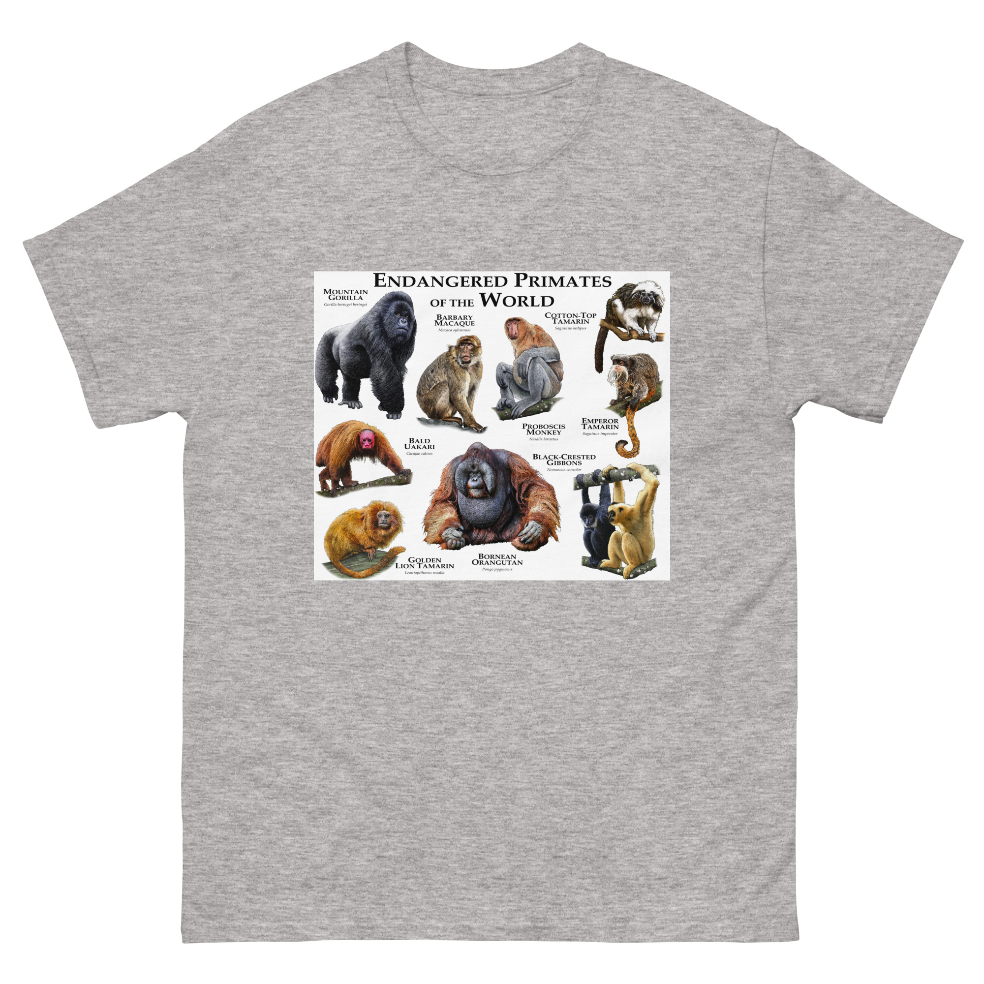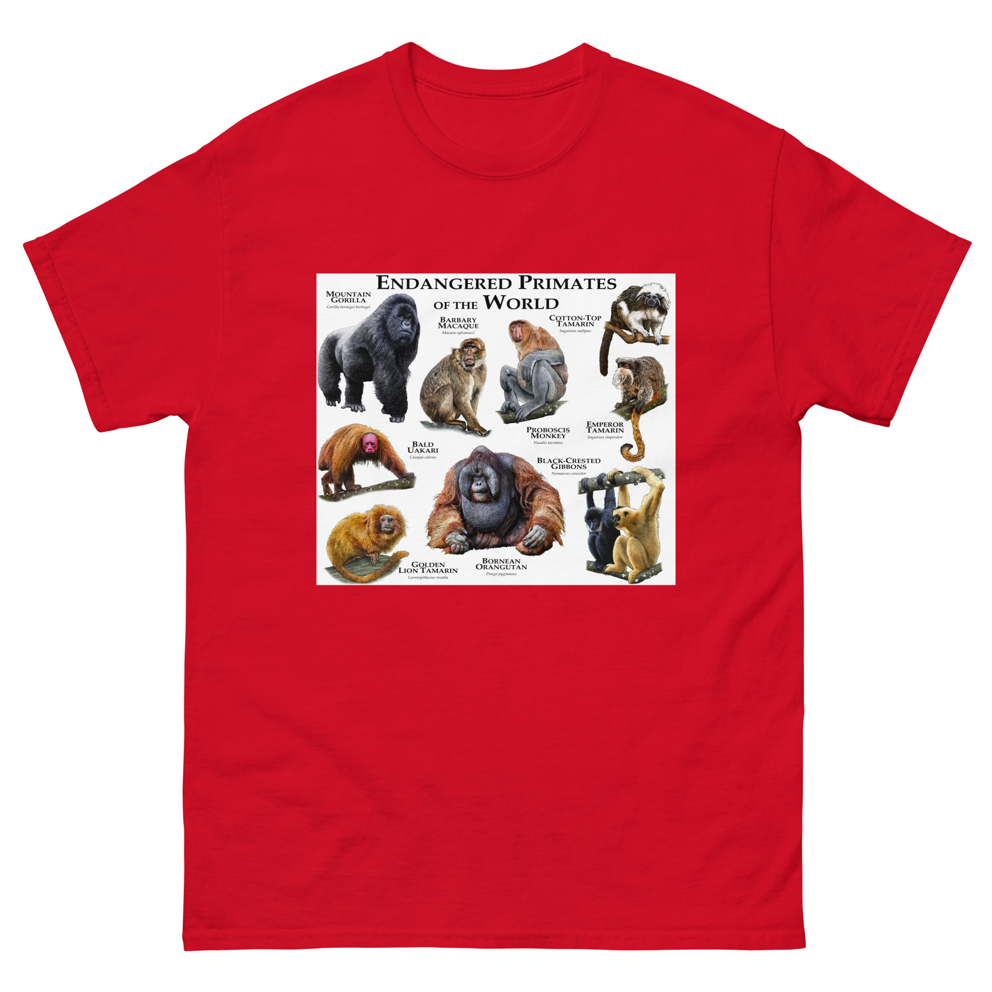 Fine art illustration of some of the world’s highly endangered primates printed on a high-quality 100% cotton men’s t-shirt