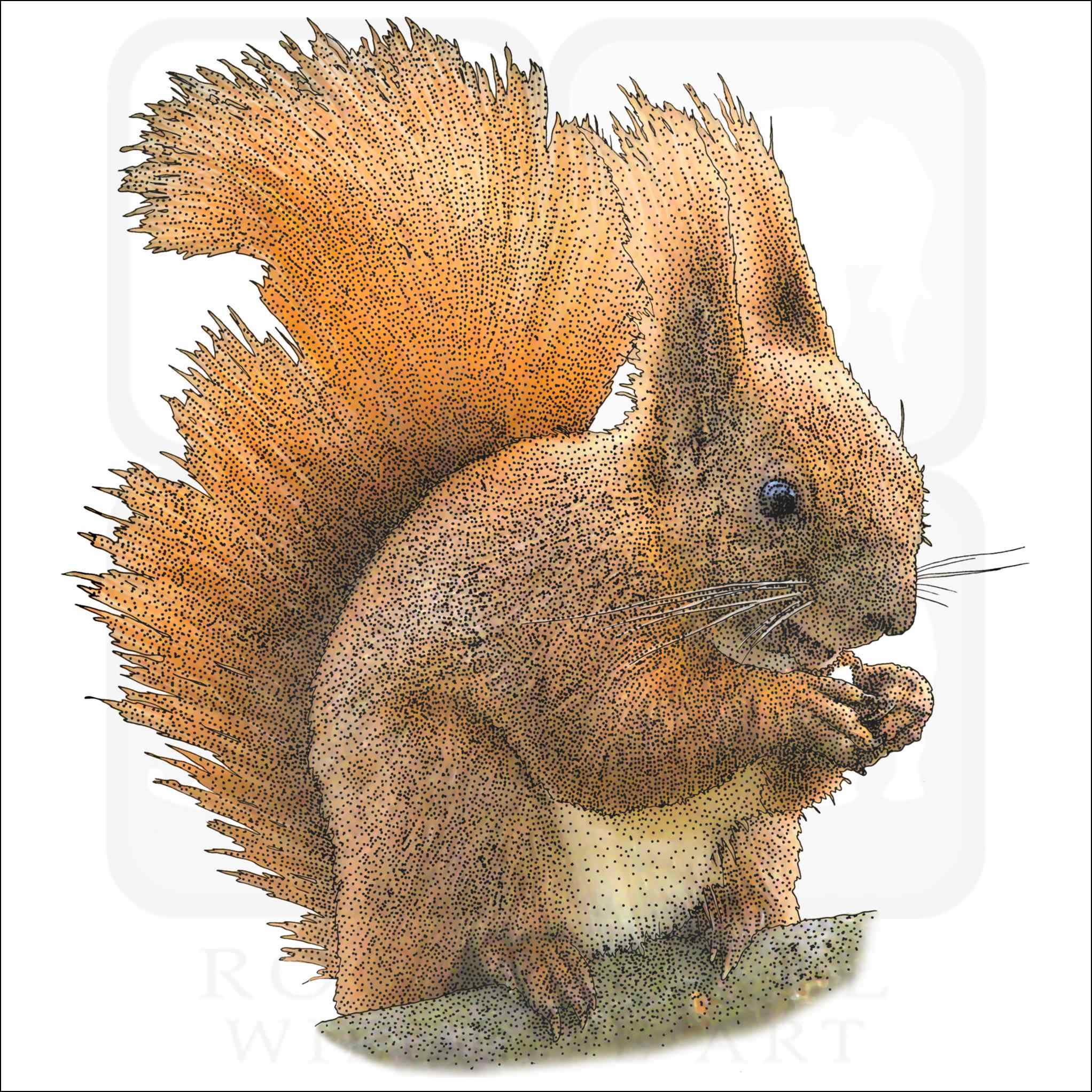Fine art illustration of a Eurasian Red Squirrel (Sciurus vulgaris.) The illustration is available in black and white or color.
