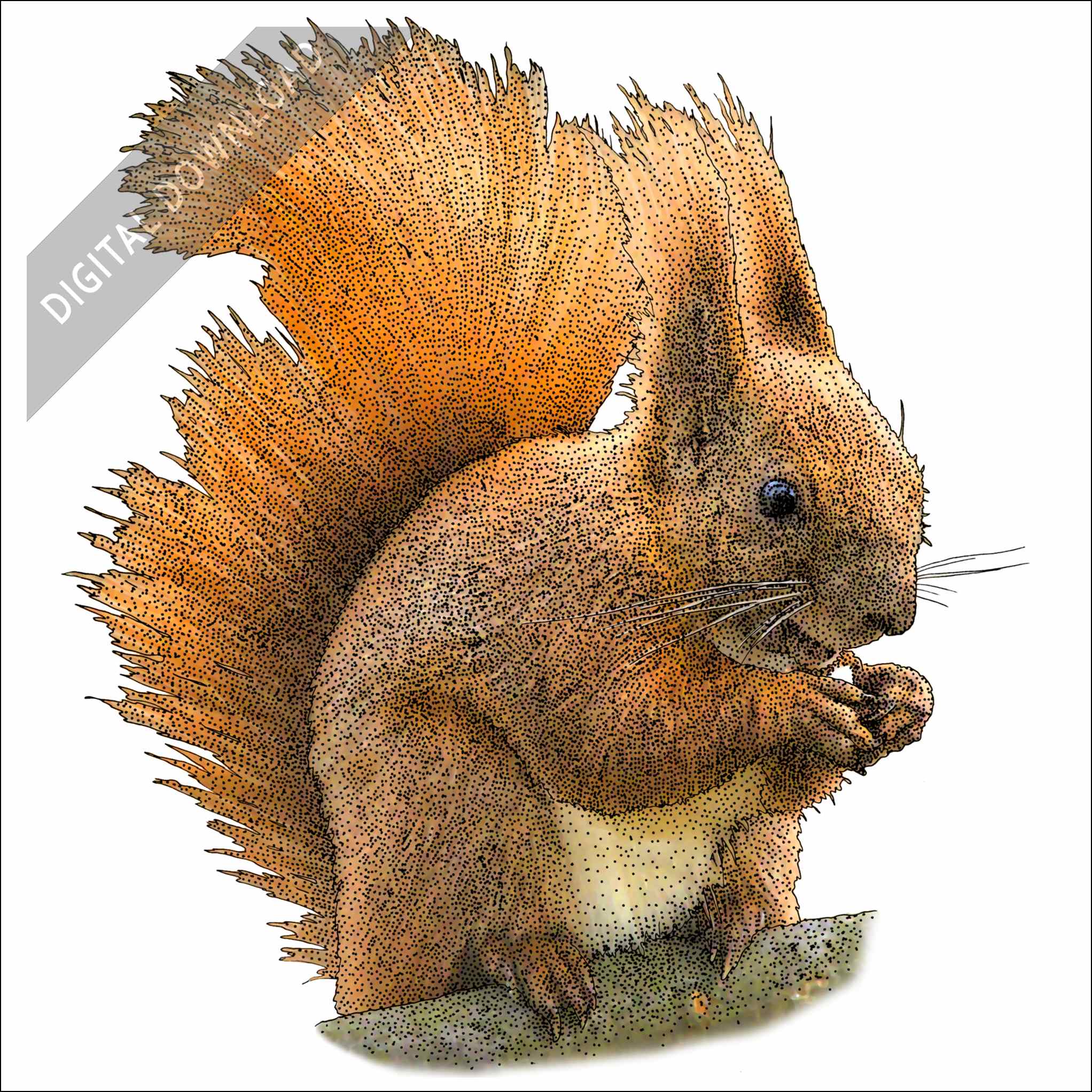 Stock art illustration of a Eurasian Red Squirrel (Sciurus vulgaris.)Â The illustration is available in black and white or color for immediate download.
