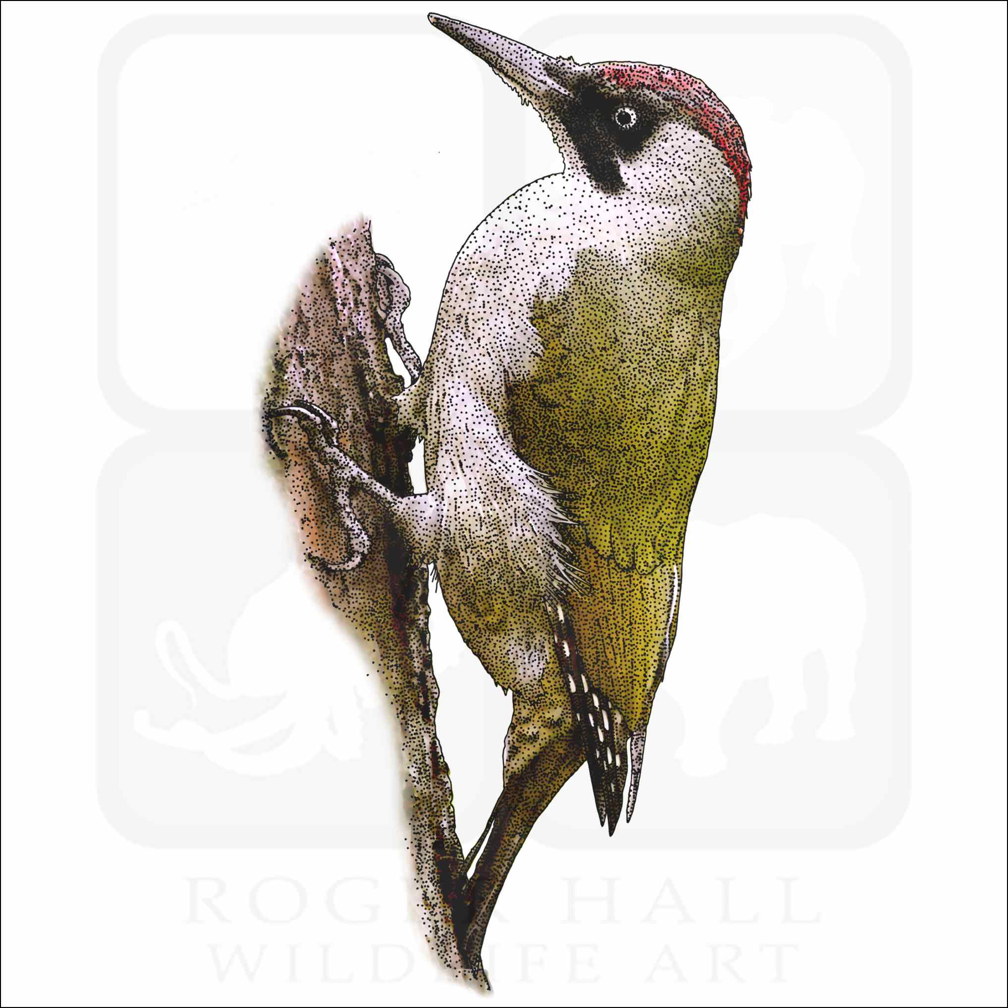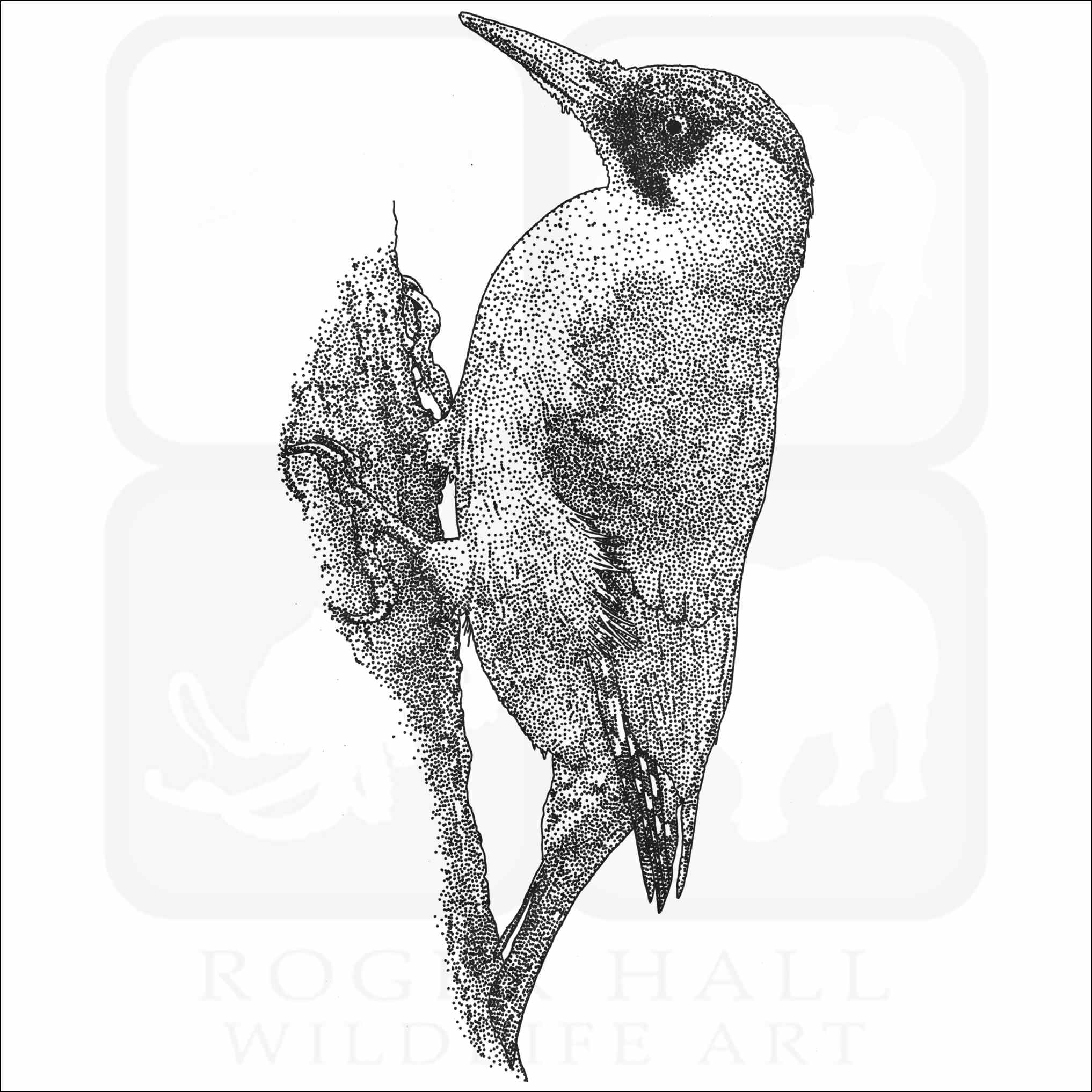 Fine art illustration of a European Green Woodpecker (Picus viridis.) The illustration is available in black and white or color.