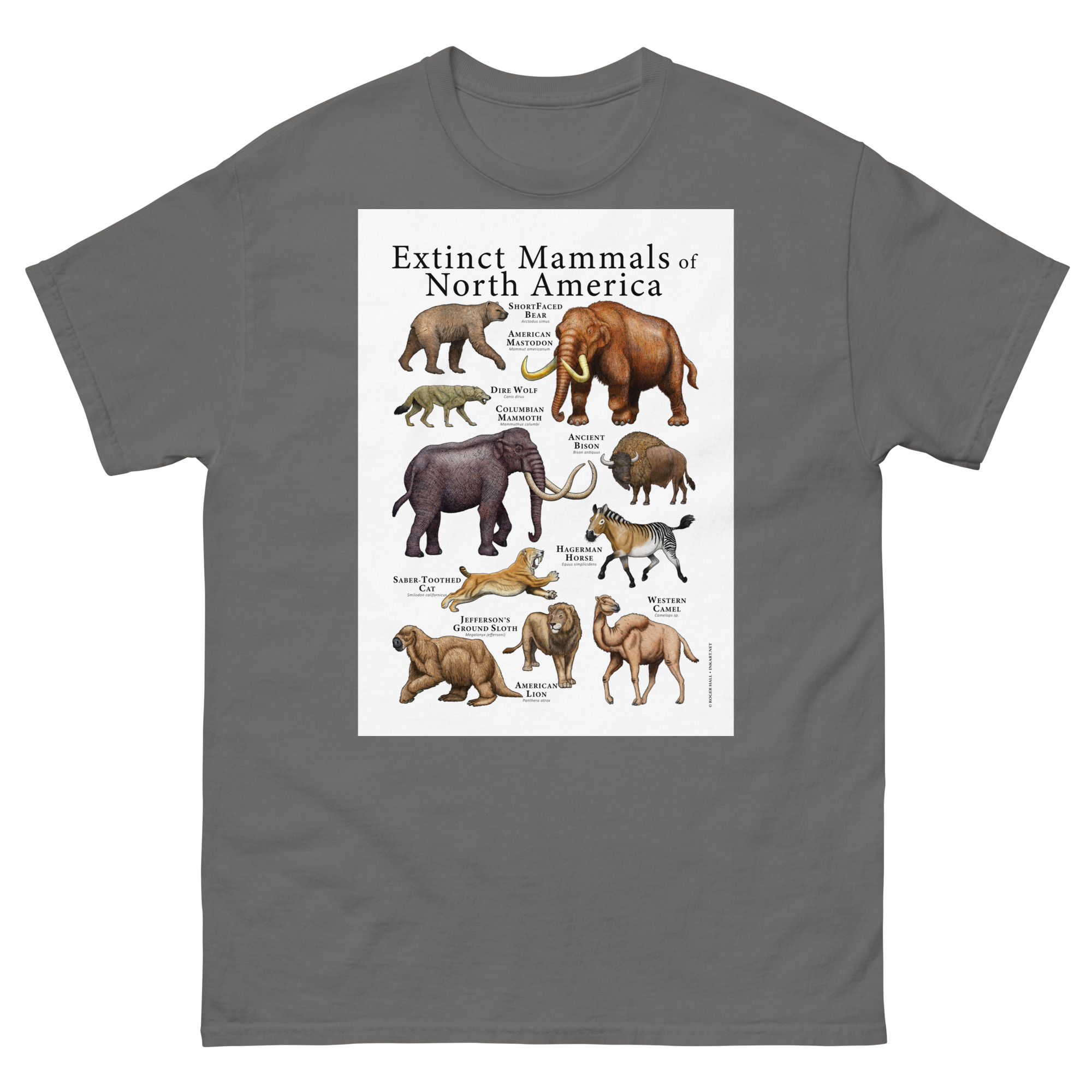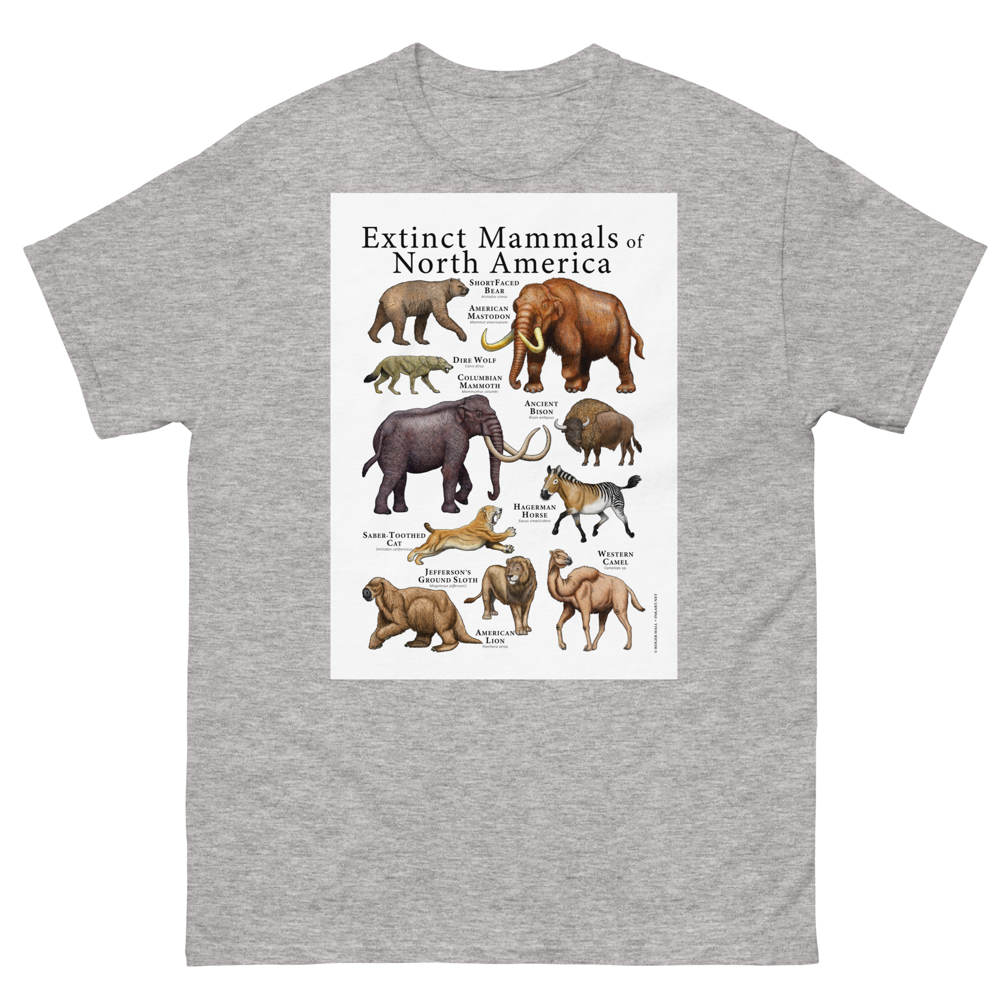 Up until roughly 8,000-10,000 years ago, many large land mammals roamed all over North America. To this day we are unsure as to exactly why these animals – sometimes called “Megafauna” – died out when they did. Poster print featuring various species of extinct mammals that were native to North America printed on a high-quality 100% men’s cotton t-shirt.