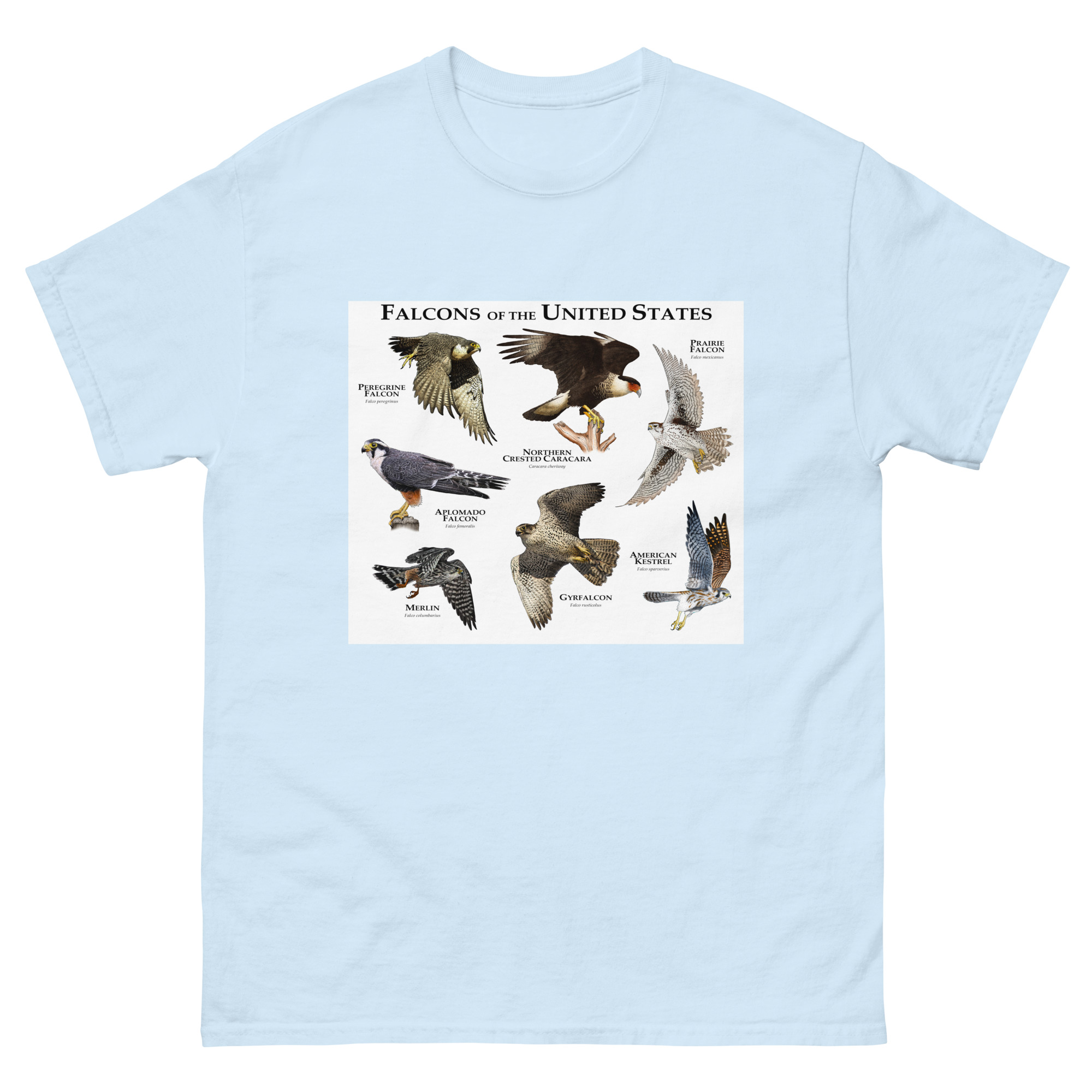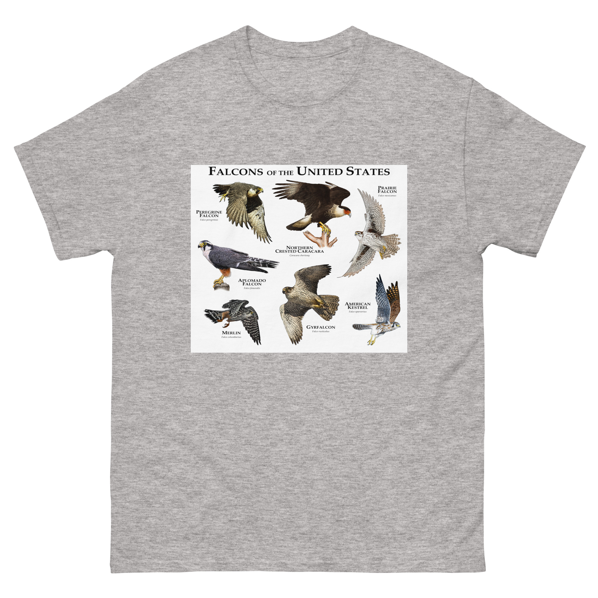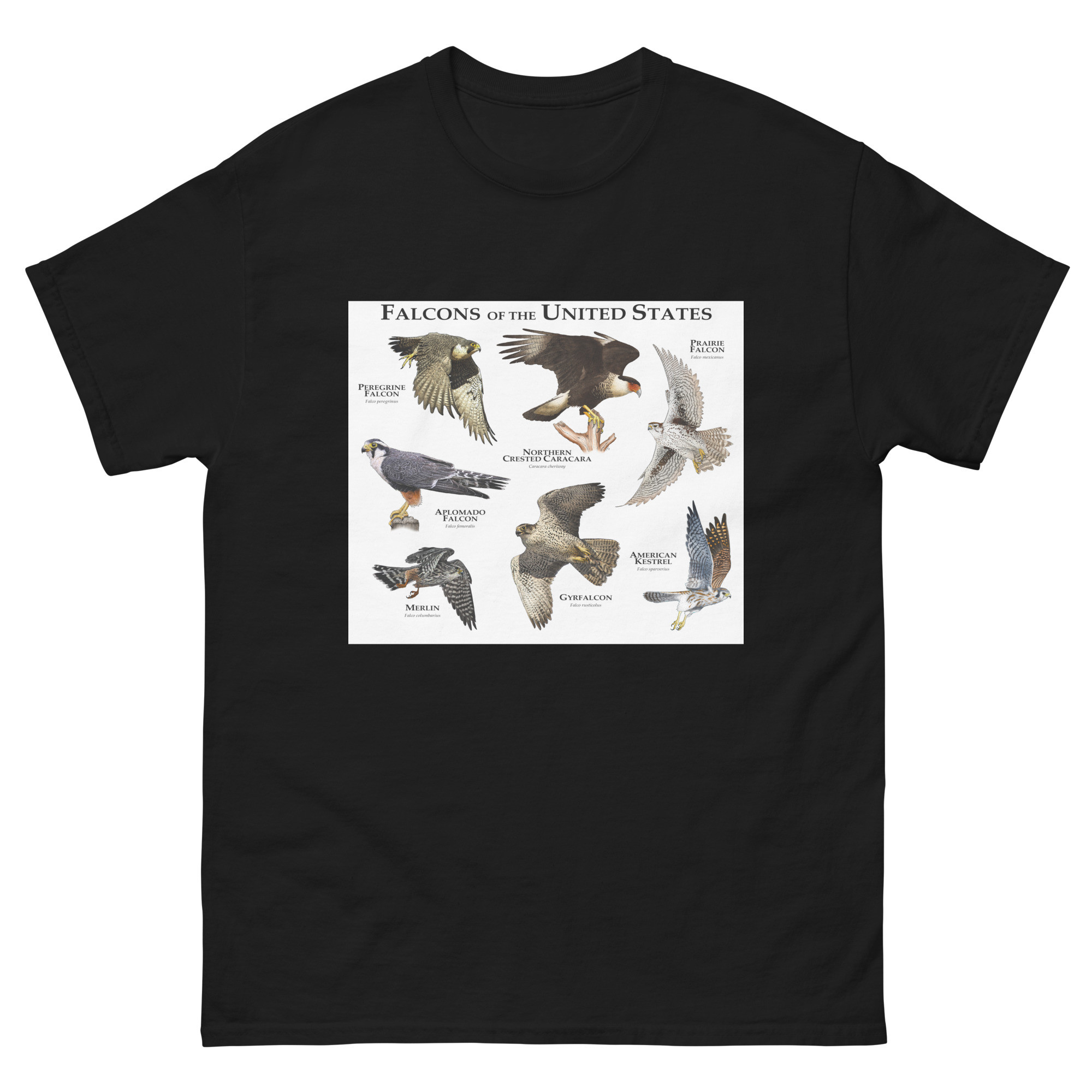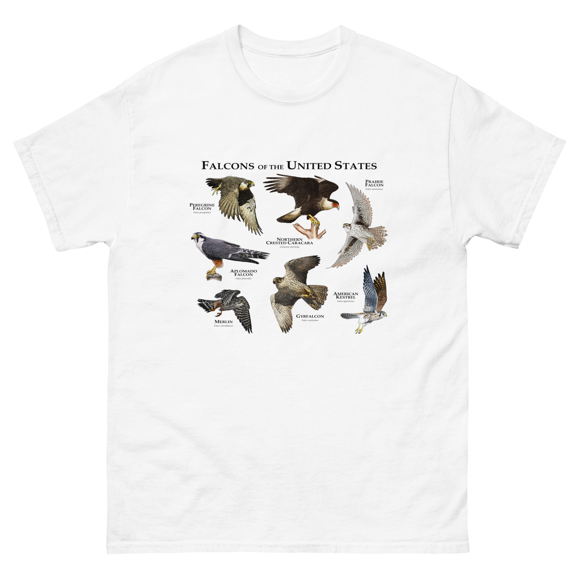 There are seven species of falcons found in the US. The American Kestrel has the widest range, covering nearly the entire country, whereas the Northern Crested Caracara is only found in the southern area Texas and occasionally in Arizona. The group of birds includes the Peregrine Falcon, which is considered the fastest animal on planet earth, with a diving speed that can exceed 240 MPH (386 KPH.) Fine art illustration of all extant species of falcon (Falconidae) native to the United States printed on a high-quality men’s cotton t-shirt