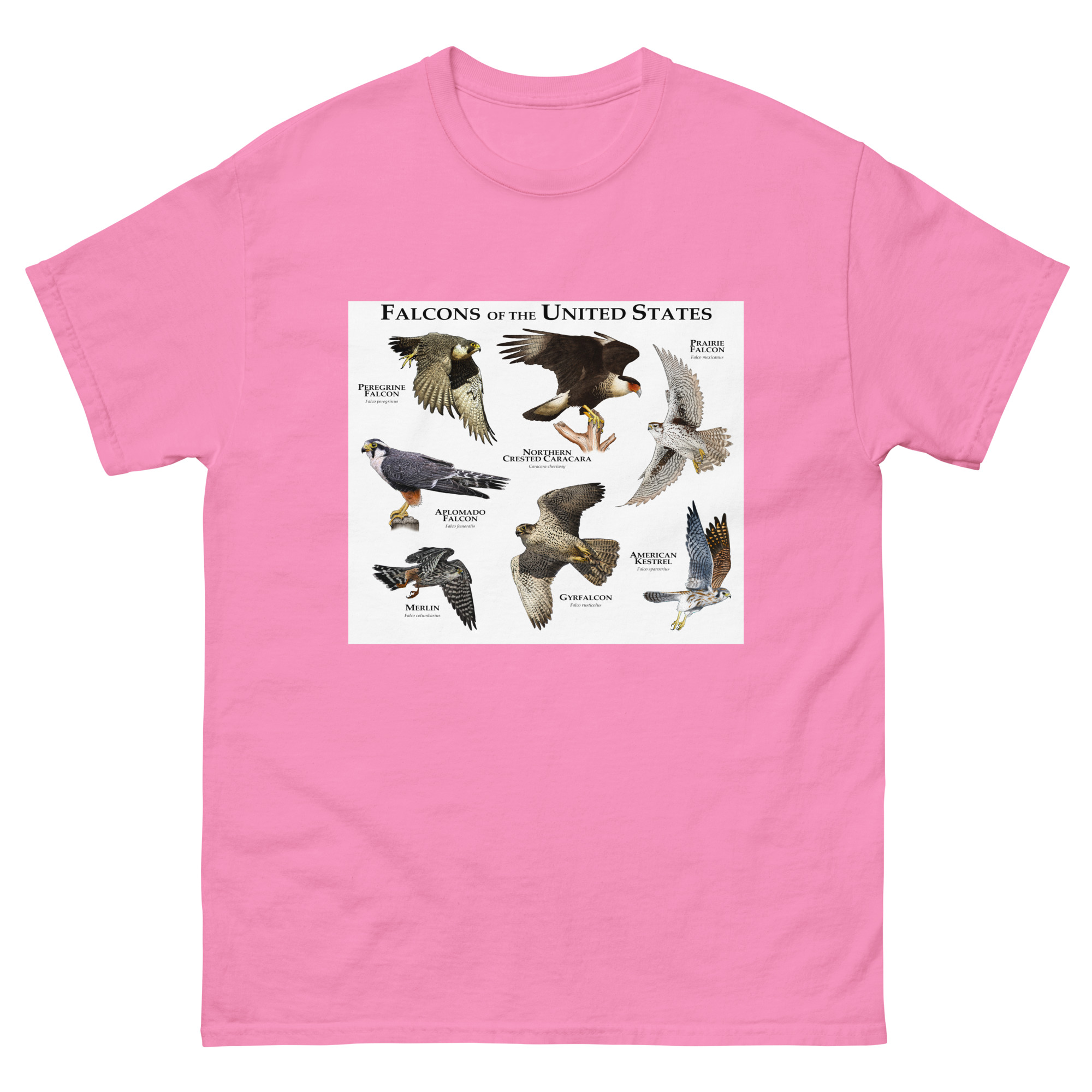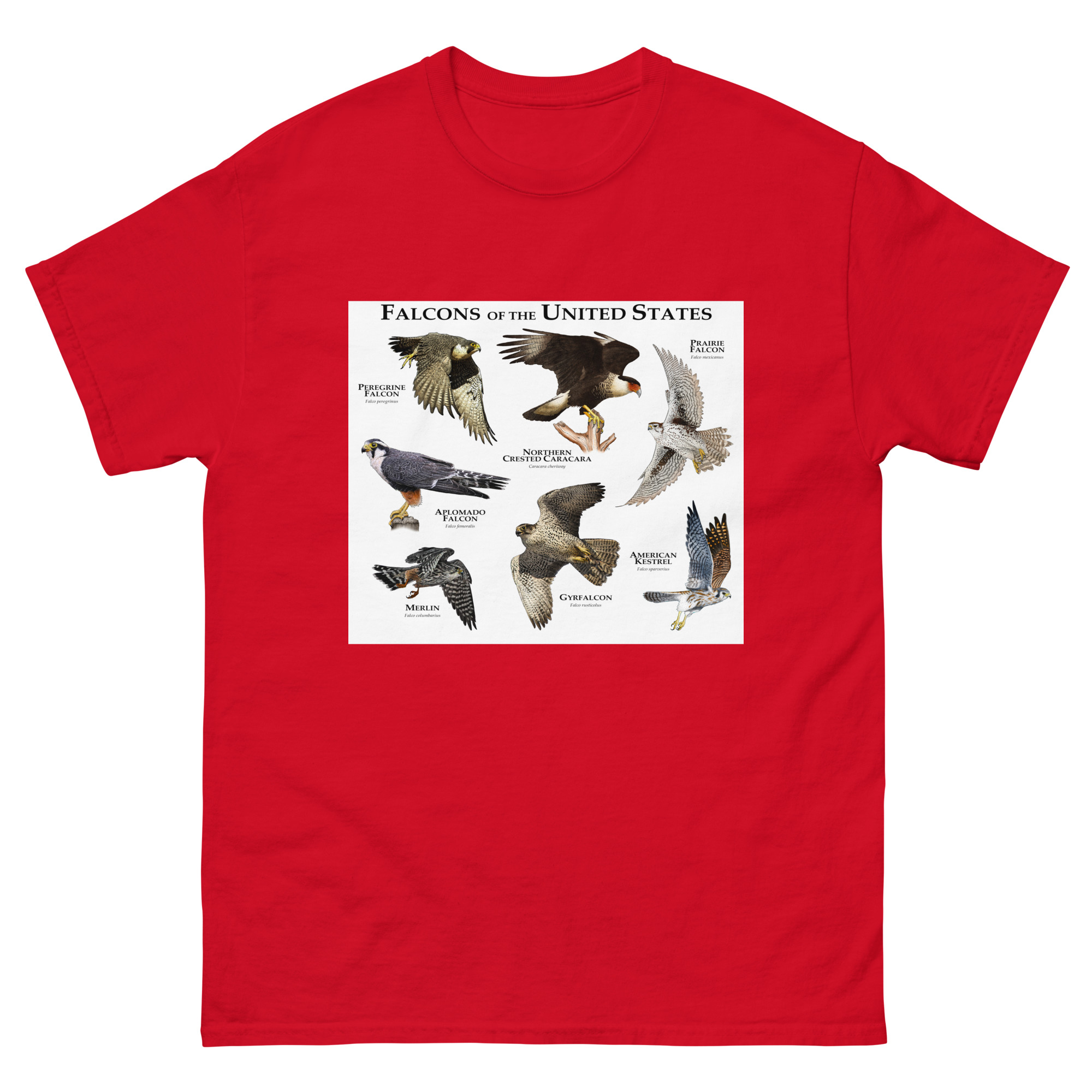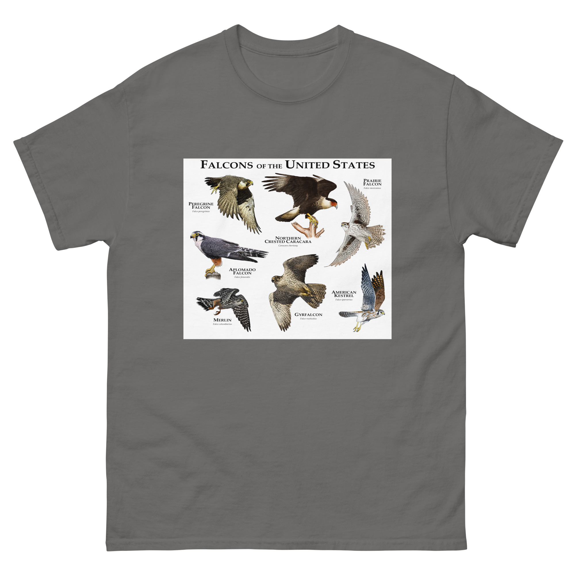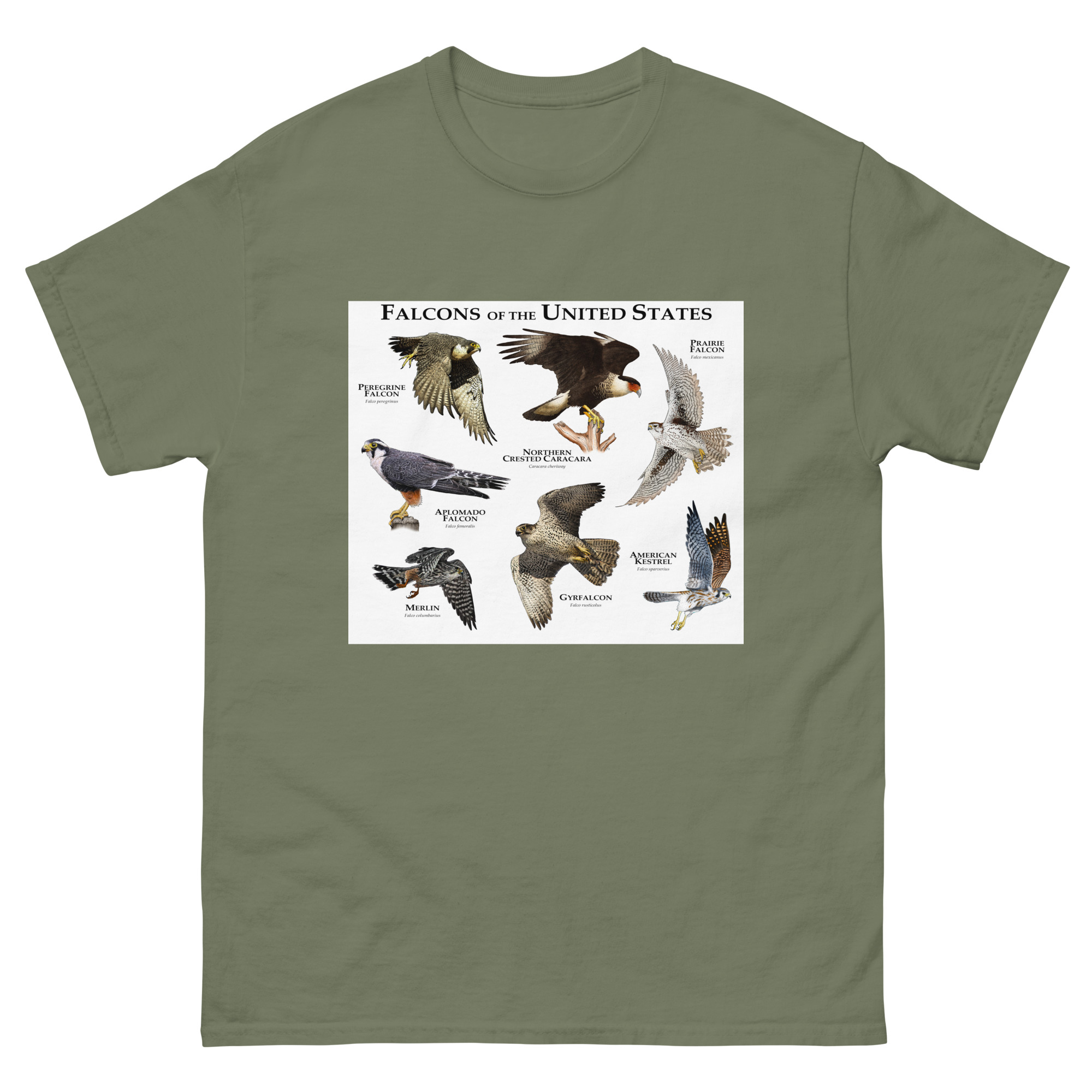 There are seven species of falcons found in the US. The American Kestrel has the widest range, covering nearly the entire country, whereas the Northern Crested Caracara is only found in the southern area Texas and occasionally in Arizona. The group of birds includes the Peregrine Falcon, which is considered the fastest animal on planet earth, with a diving speed that can exceed 240 MPH (386 KPH.) Fine art illustration of all extant species of falcon (Falconidae) native to the United States printed on a high-quality men’s cotton t-shirt