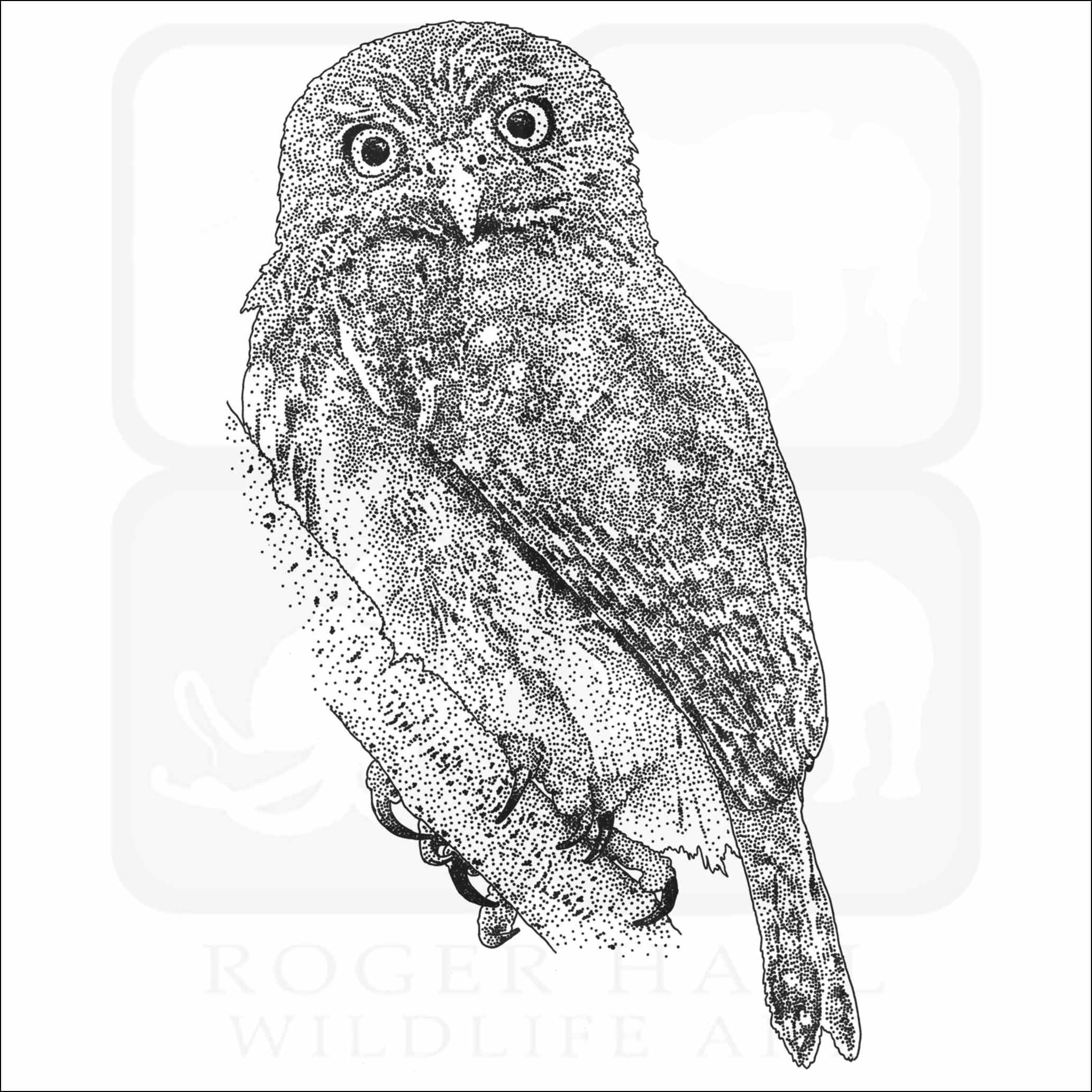 Fine art illustration of a Ferruginous Pygmy Owl (Glaucidium brasilianum.) The illustration is available in black and white or color.