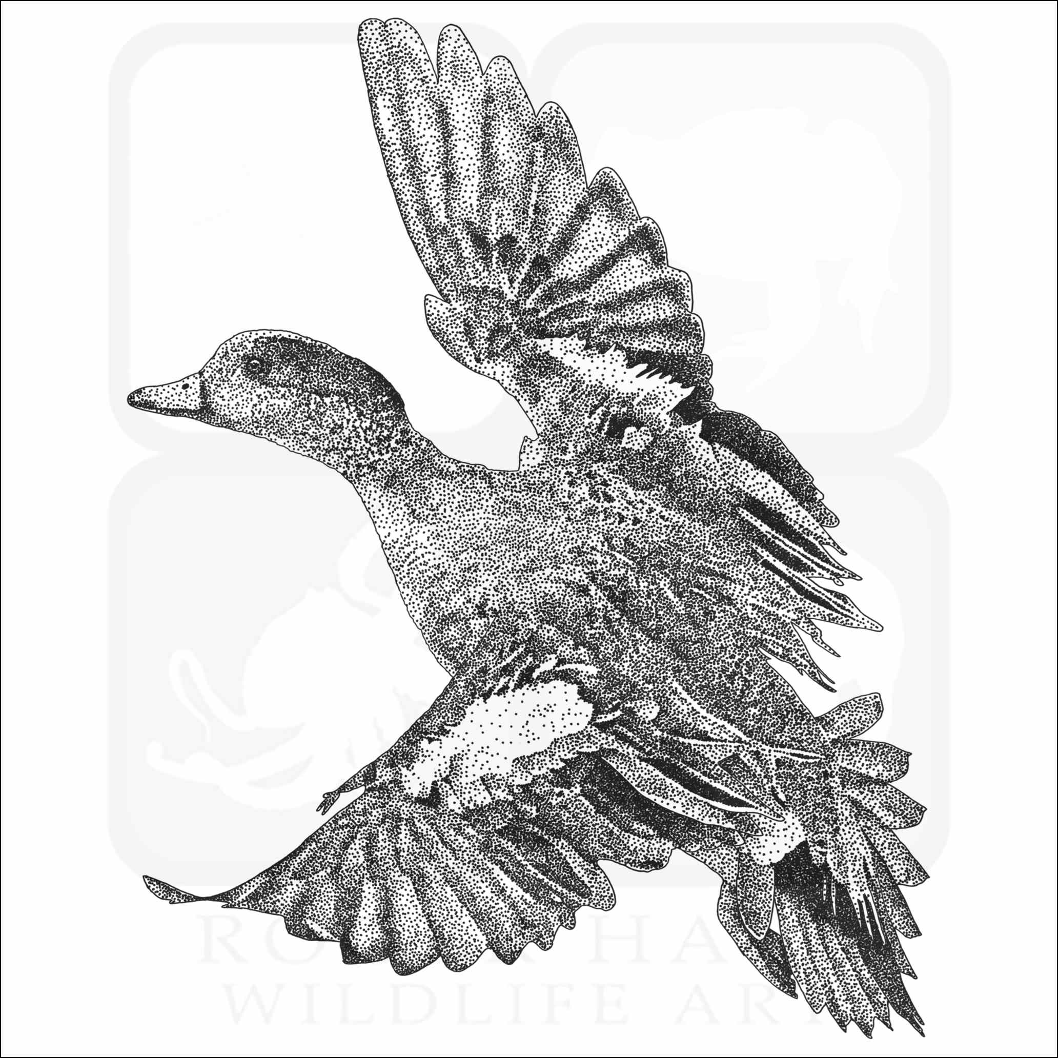 Fine art illustration of an American Wigeon (Mareca americana.) The illustration is available in black and white or color.