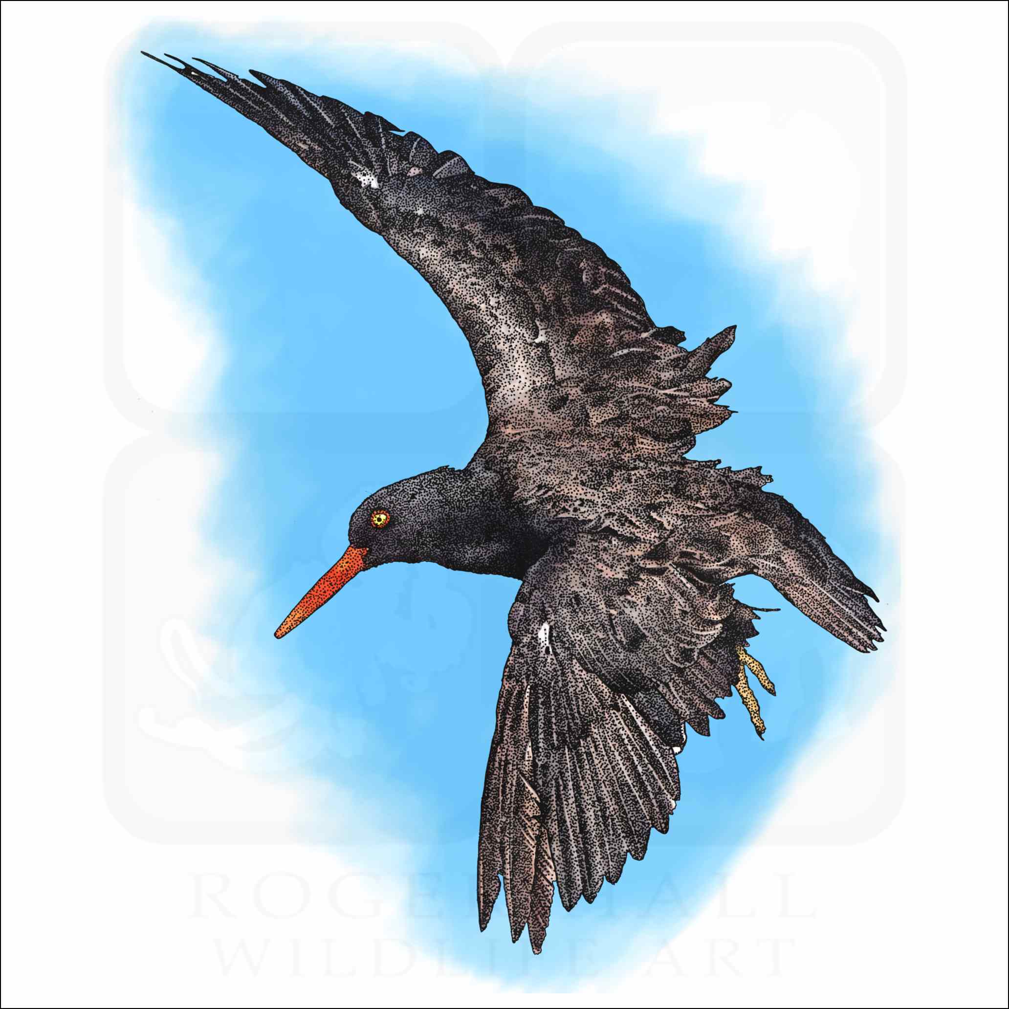 Fine art illustration of a Black Oystercatcher (Haematopus bachmani.) The illustration is available in black and white or color.