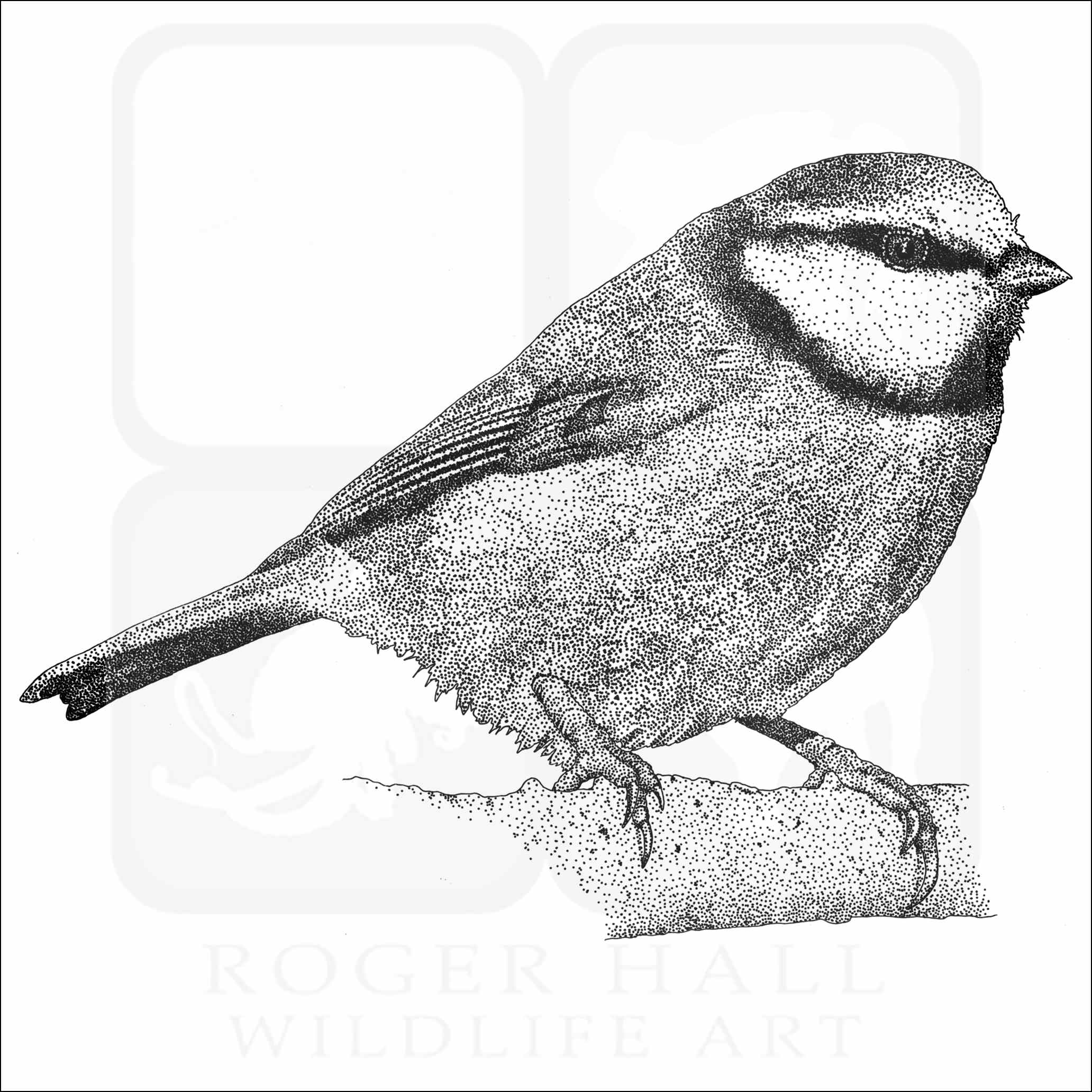 Fine art illustration of a Blue Tit (Parus caeruleus.) The illustration is available in black and white or color.