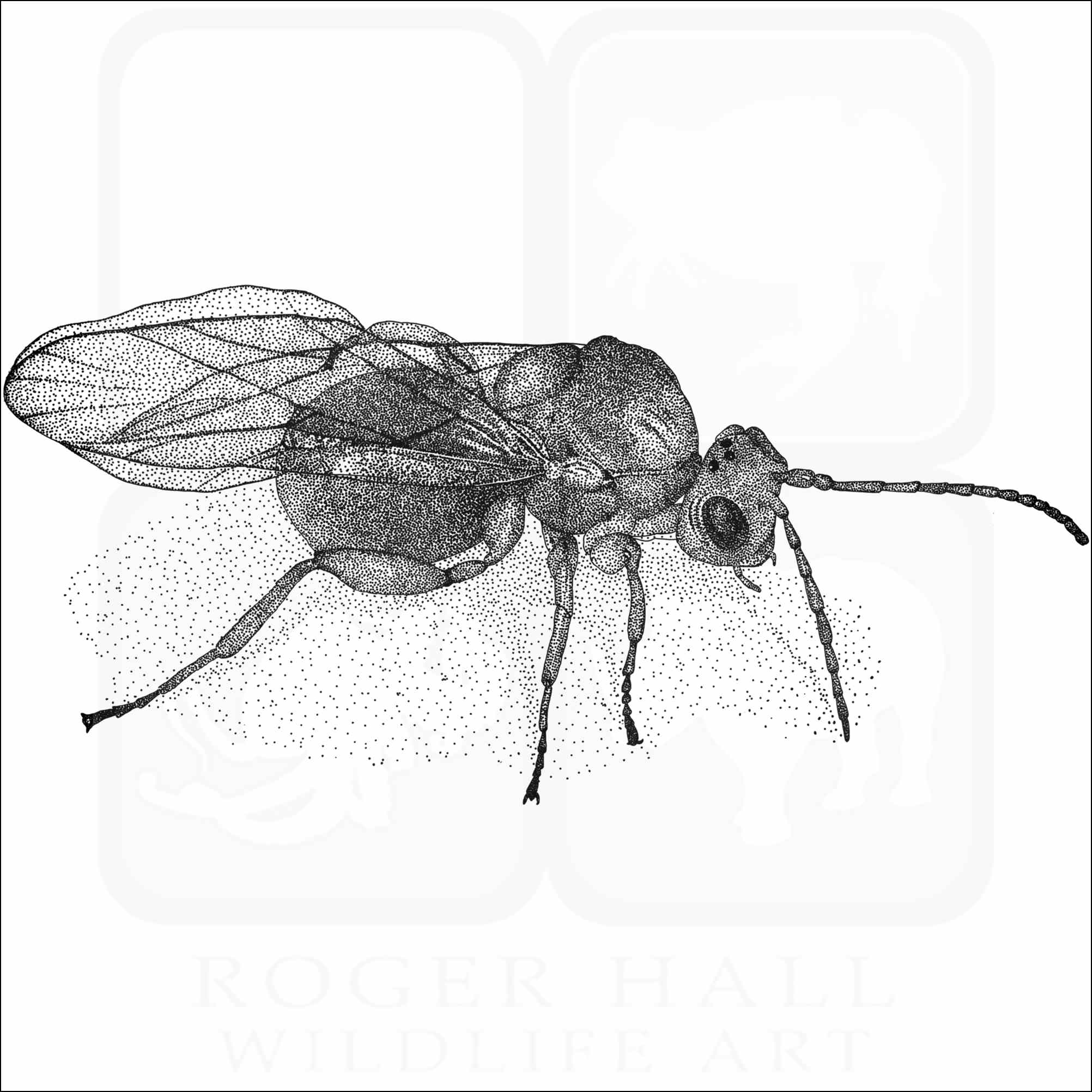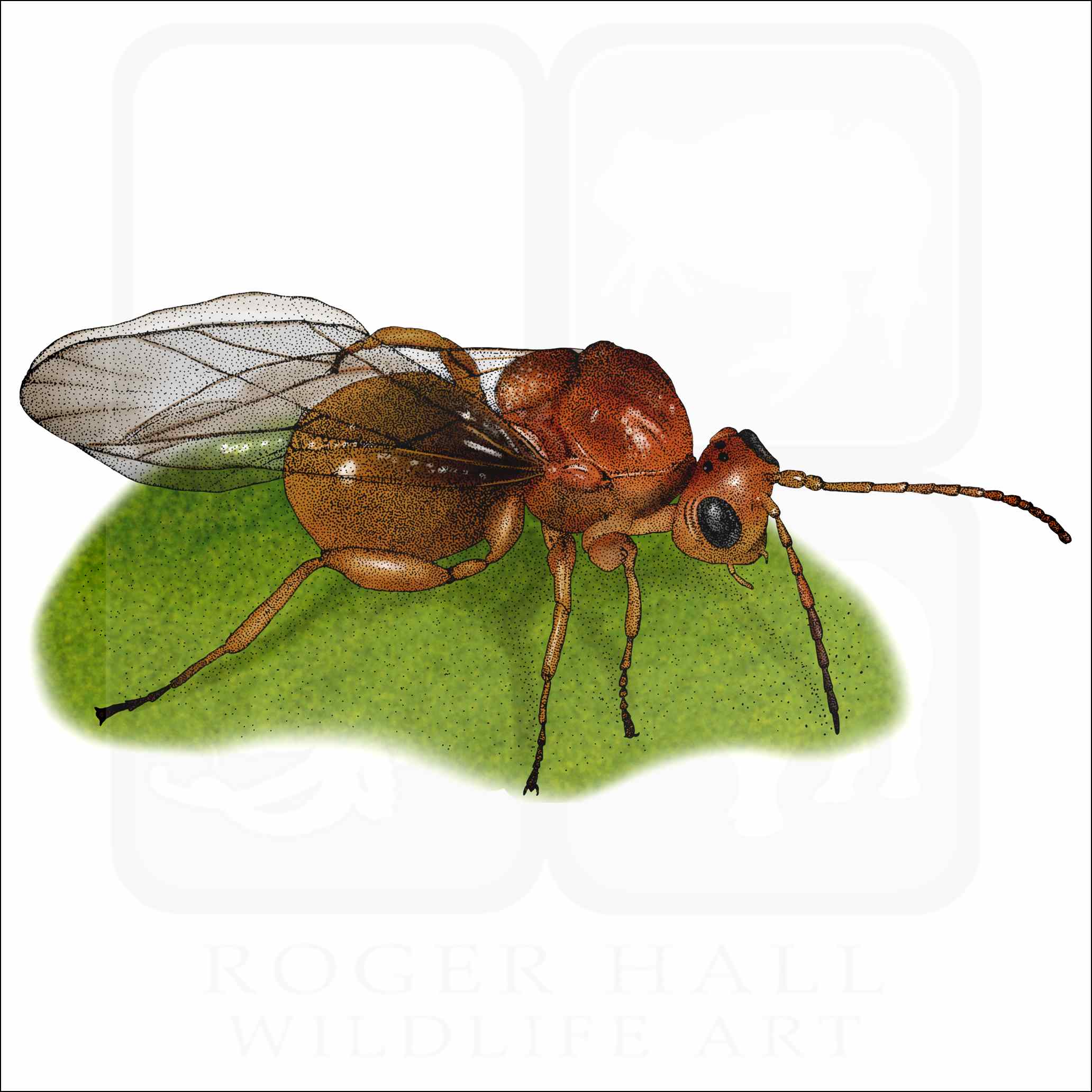 Fine art illustration of a Gall Wasp (Andricus quercuscalifornicus.) The illustration is available in black and white or color.
