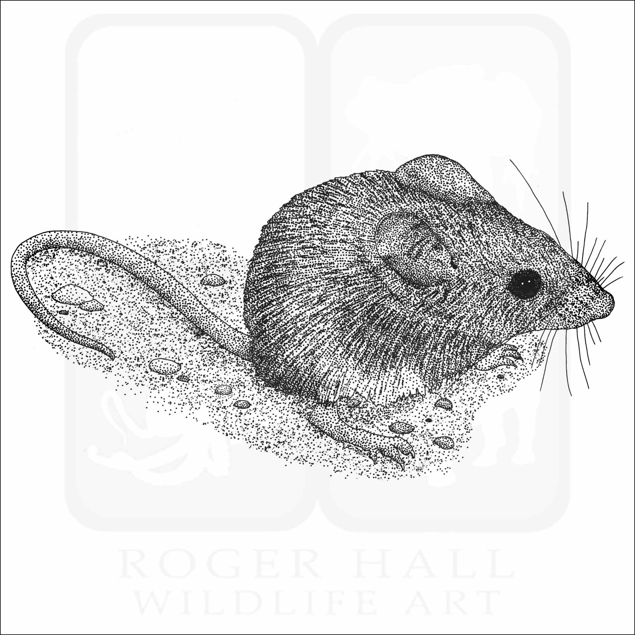 Fine art illustration of a California Mouse (Peromyscus californicus.) The illustration is available in black and white or color.