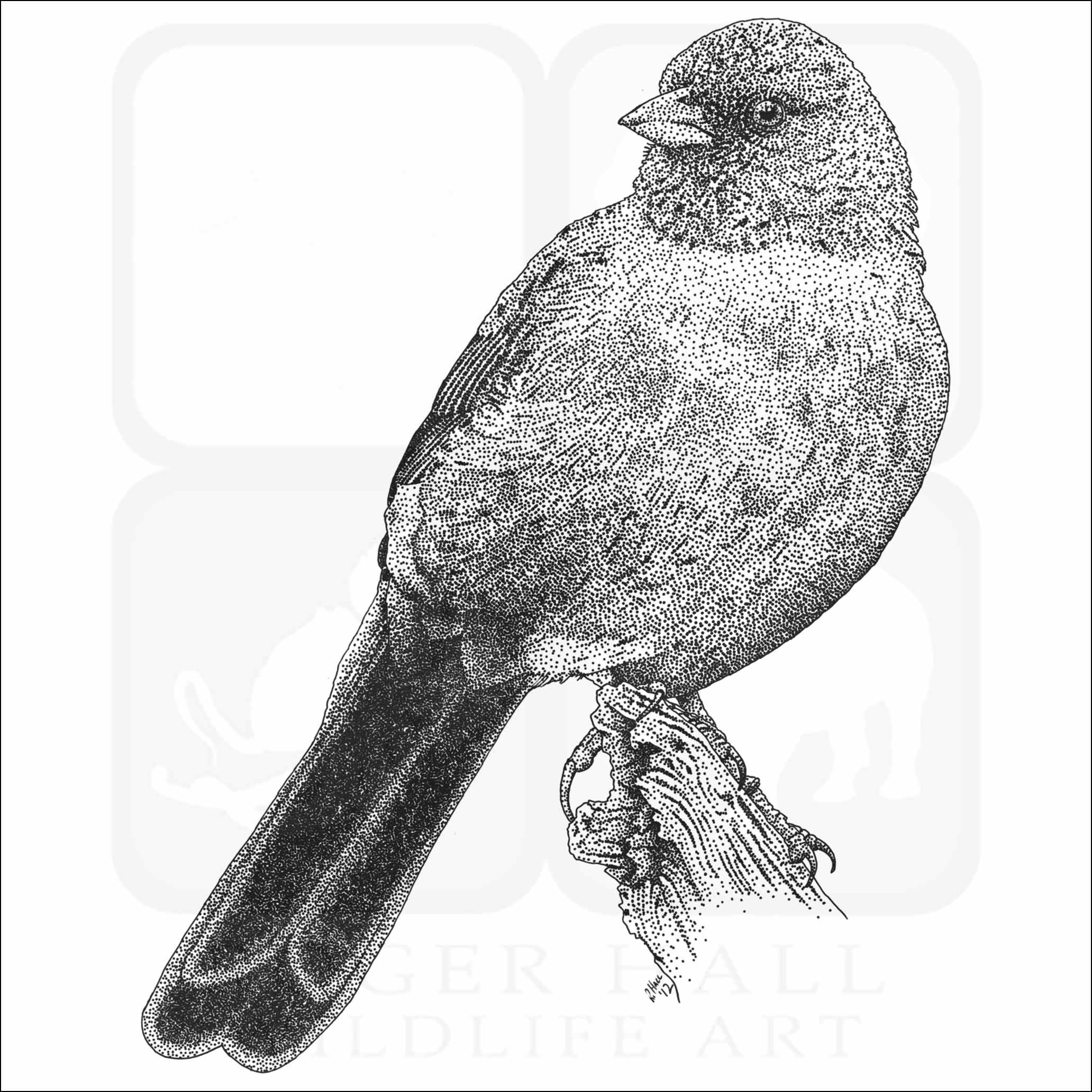 Fine art illustration of a California Towhee (Pipilo crissalis.) The illustration is available in black and white or color.
