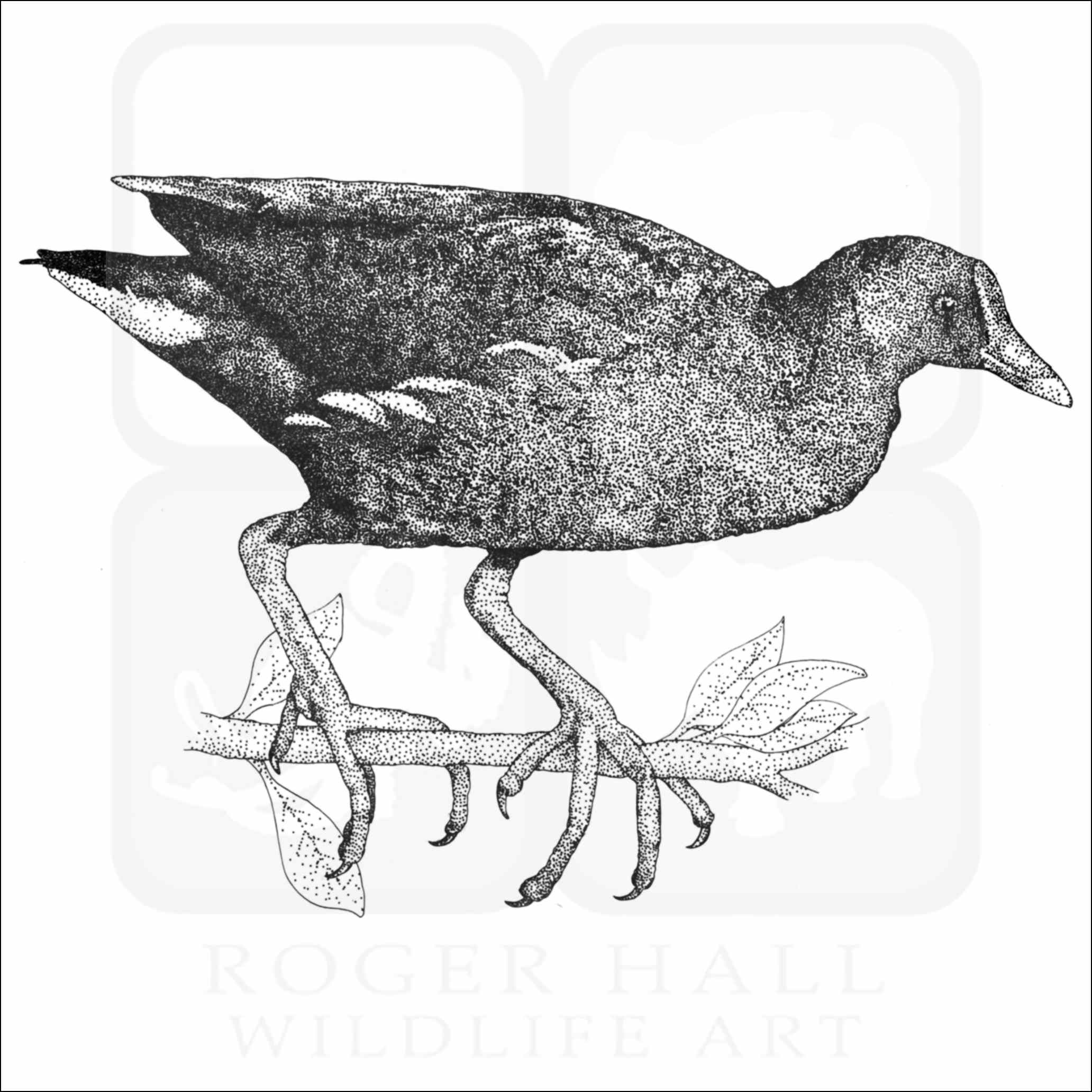 Fine art illustration of a Common Moorhen (Gallinula chloropus.) The illustration is available in black and white or color.