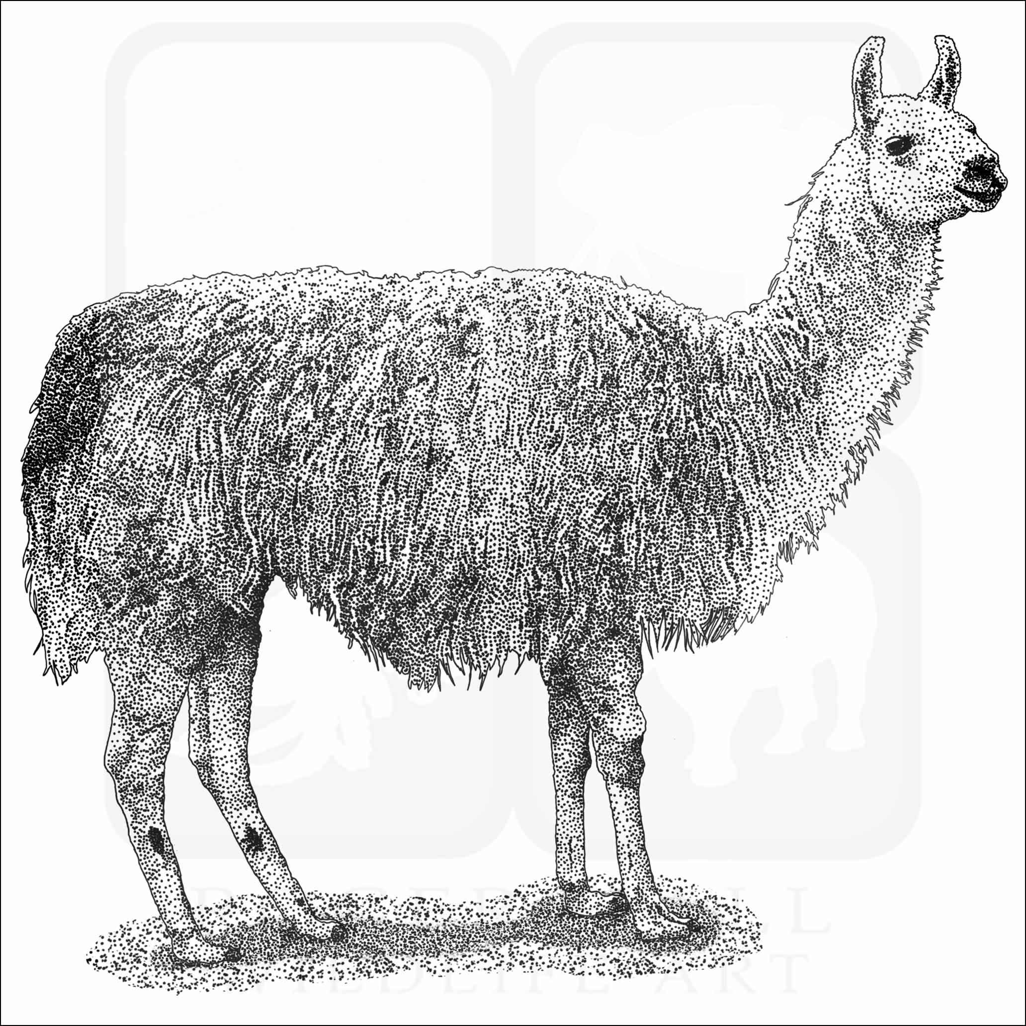Fine art illustration of a Domestic Llama (Lama guanicoe glama.) The illustration is available in black and white or color.