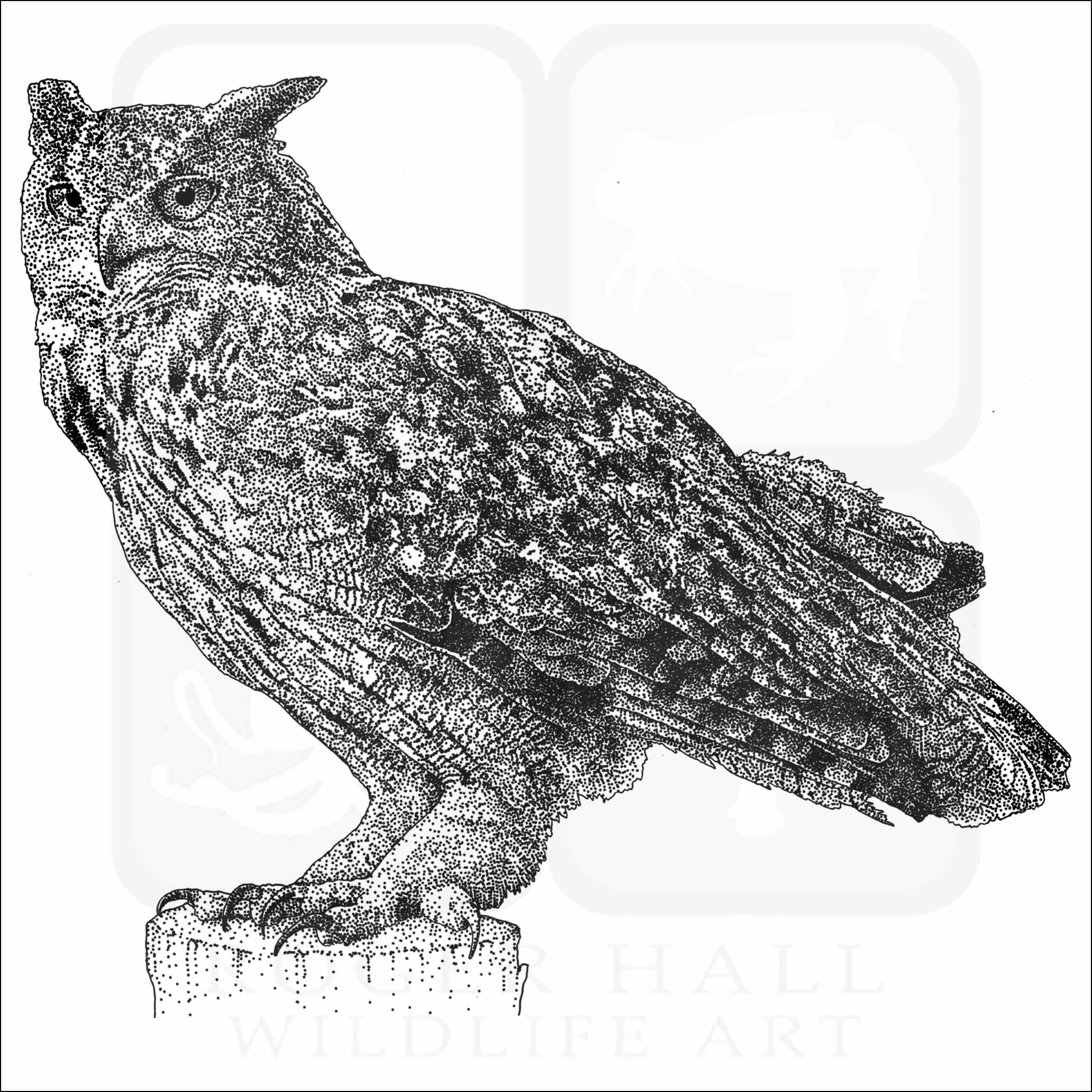 Fine art illustration of a Eurasian Eagle Owl (Bubo bubo.) The illustration is available in black and white or color.