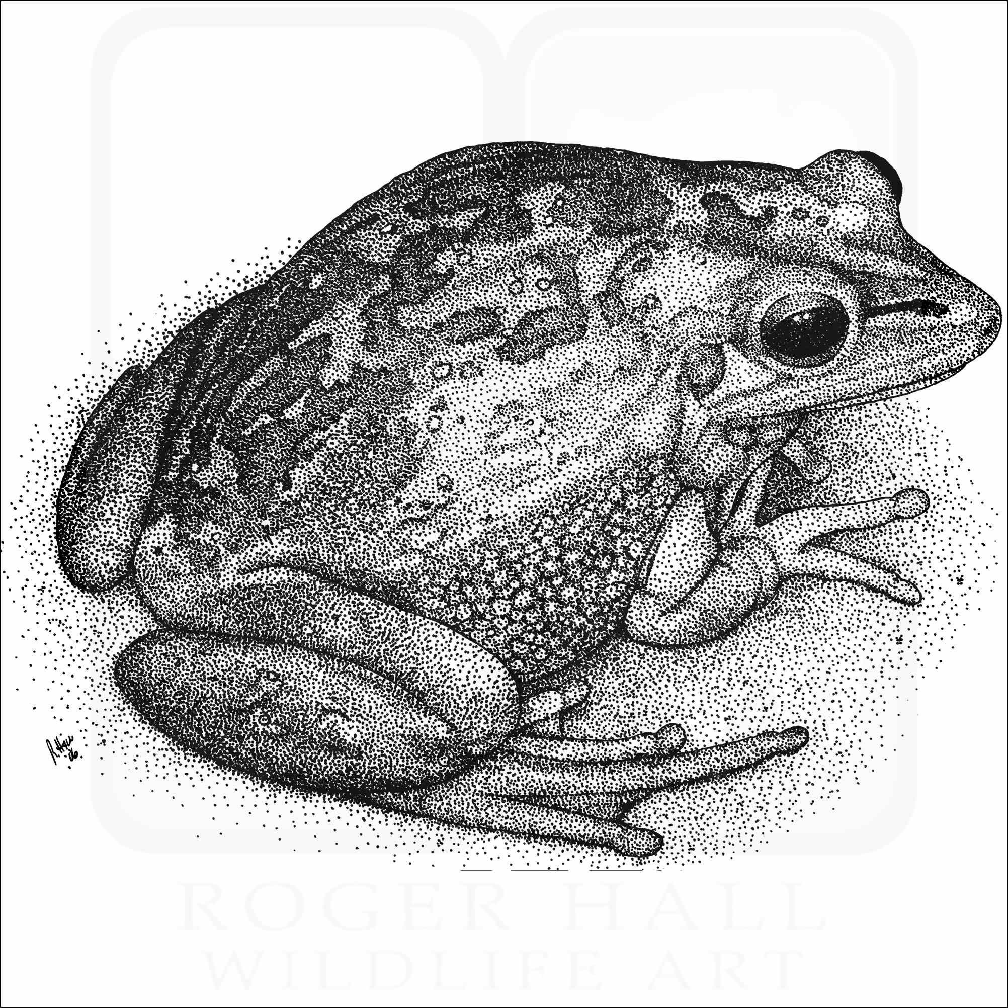 Fine art illustration of a Green and Golden Bell Frog (Litoria aurea.) The illustration is available in black and white or color.