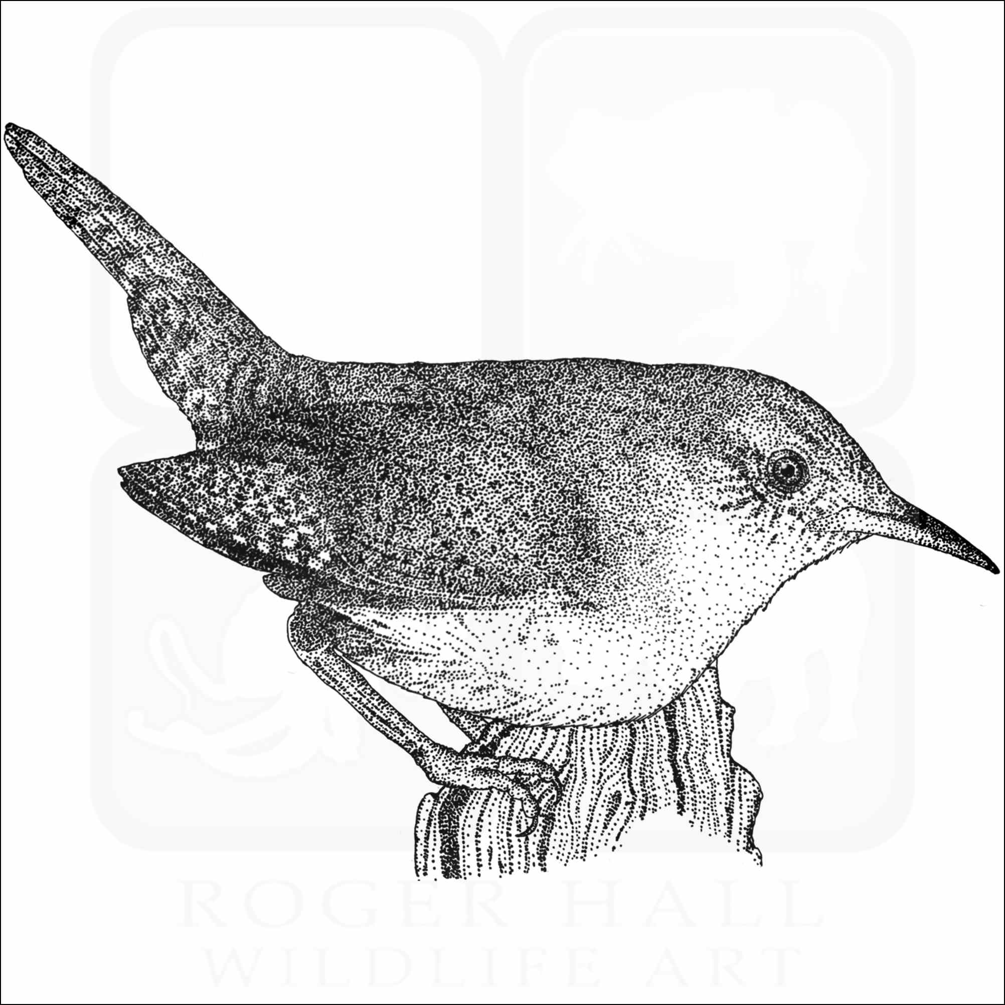 Fine art illustration of a House Wren (Troglodytes aedon.) The illustration is available in black and white or color.