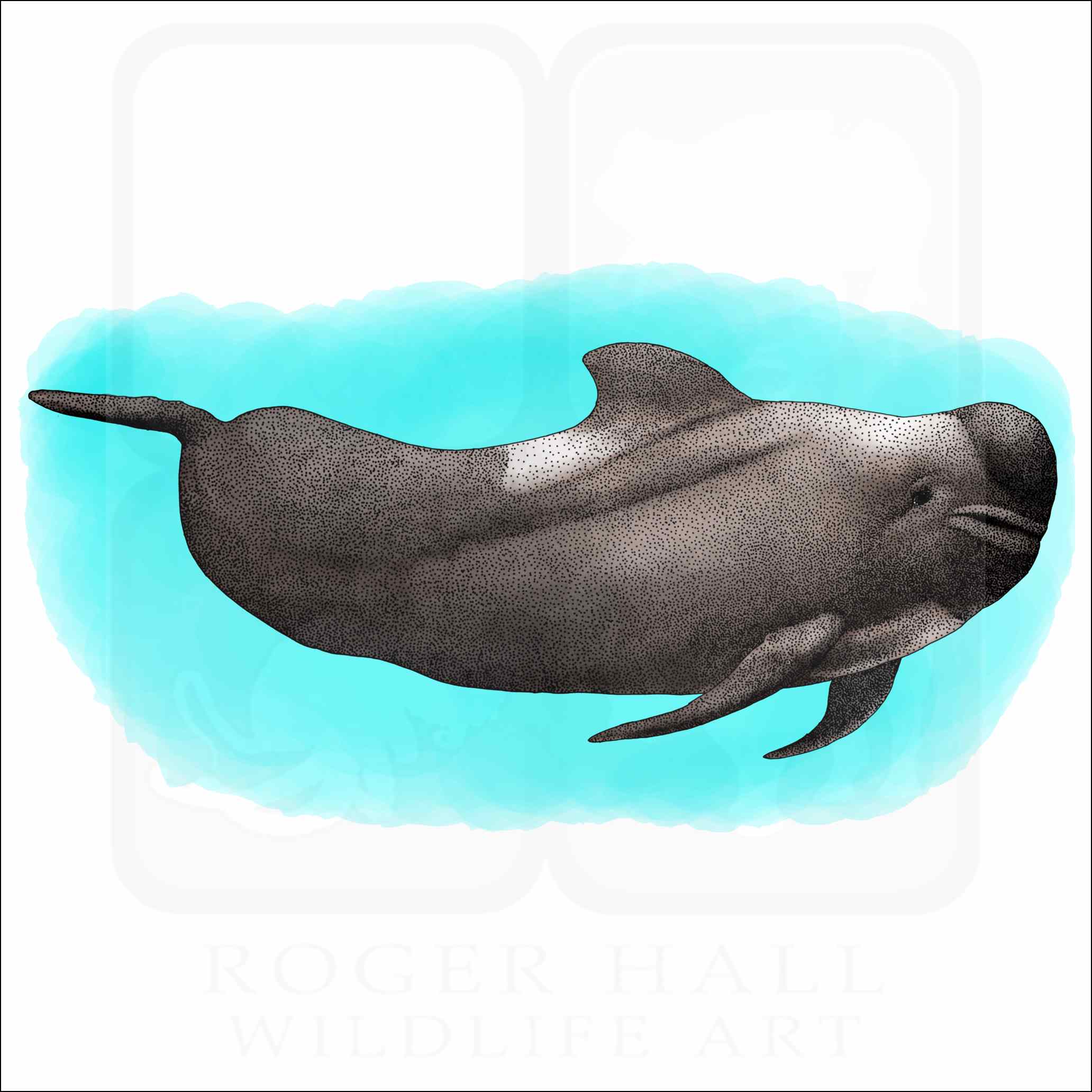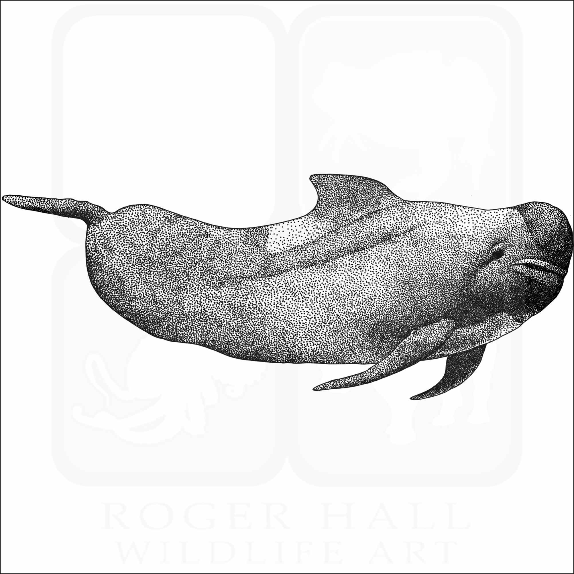 Fine art illustration of a Long-Finned Pilot Whale (Globicephala melas.) The illustration is available in black and white or color.