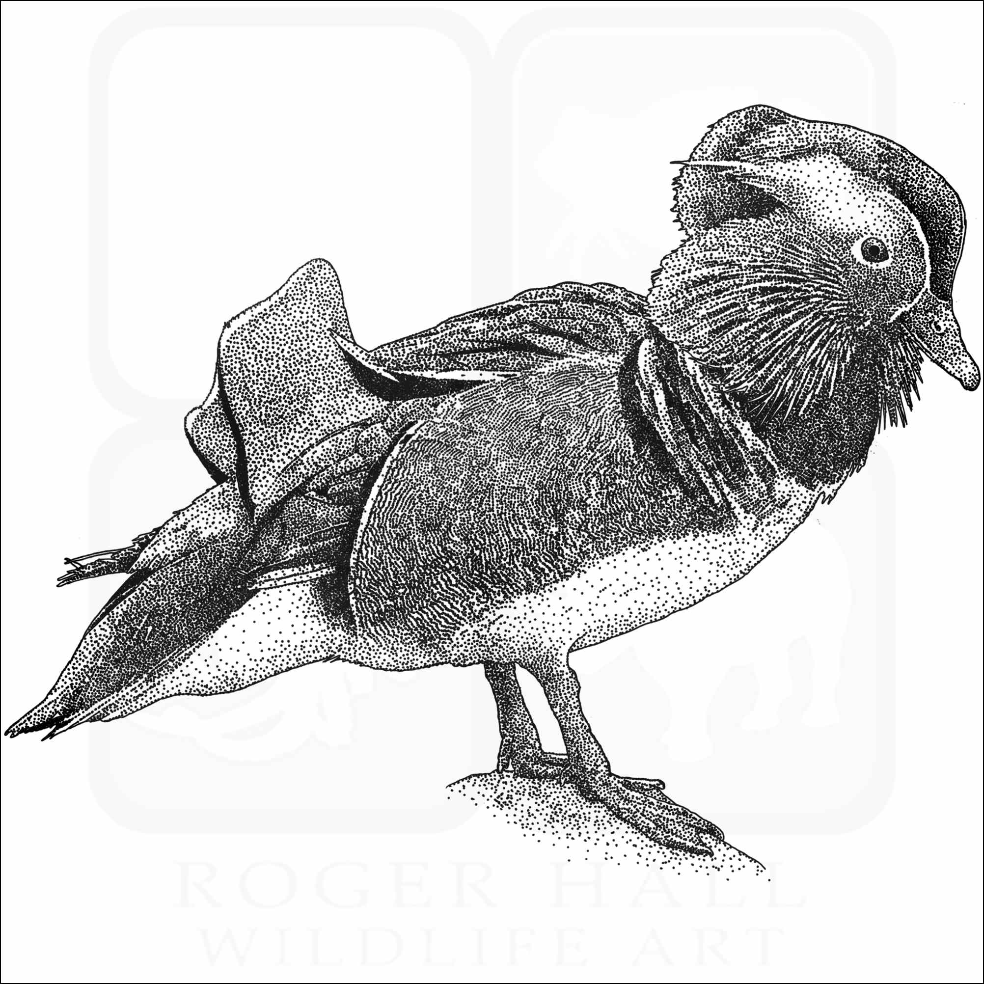 Fine art illustration of a Mandarin Duck (Aix galericulata.) The illustration is available in black and white or color.