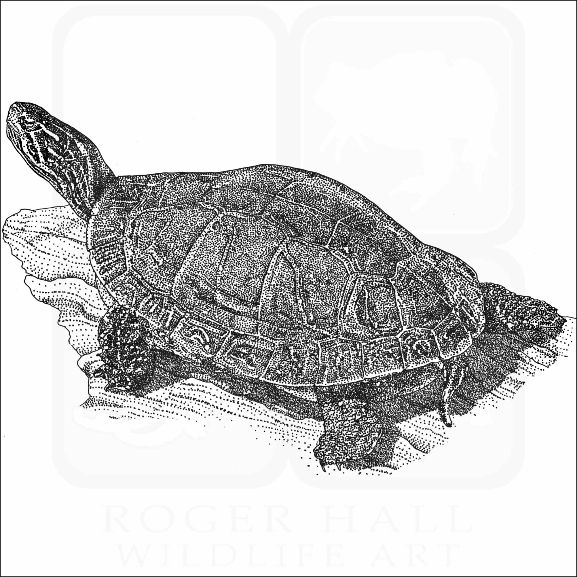 Fine art illustration of a Midlands Painted Turtle (Chrysemys picta marginata.) The illustration is available in black and white or color.