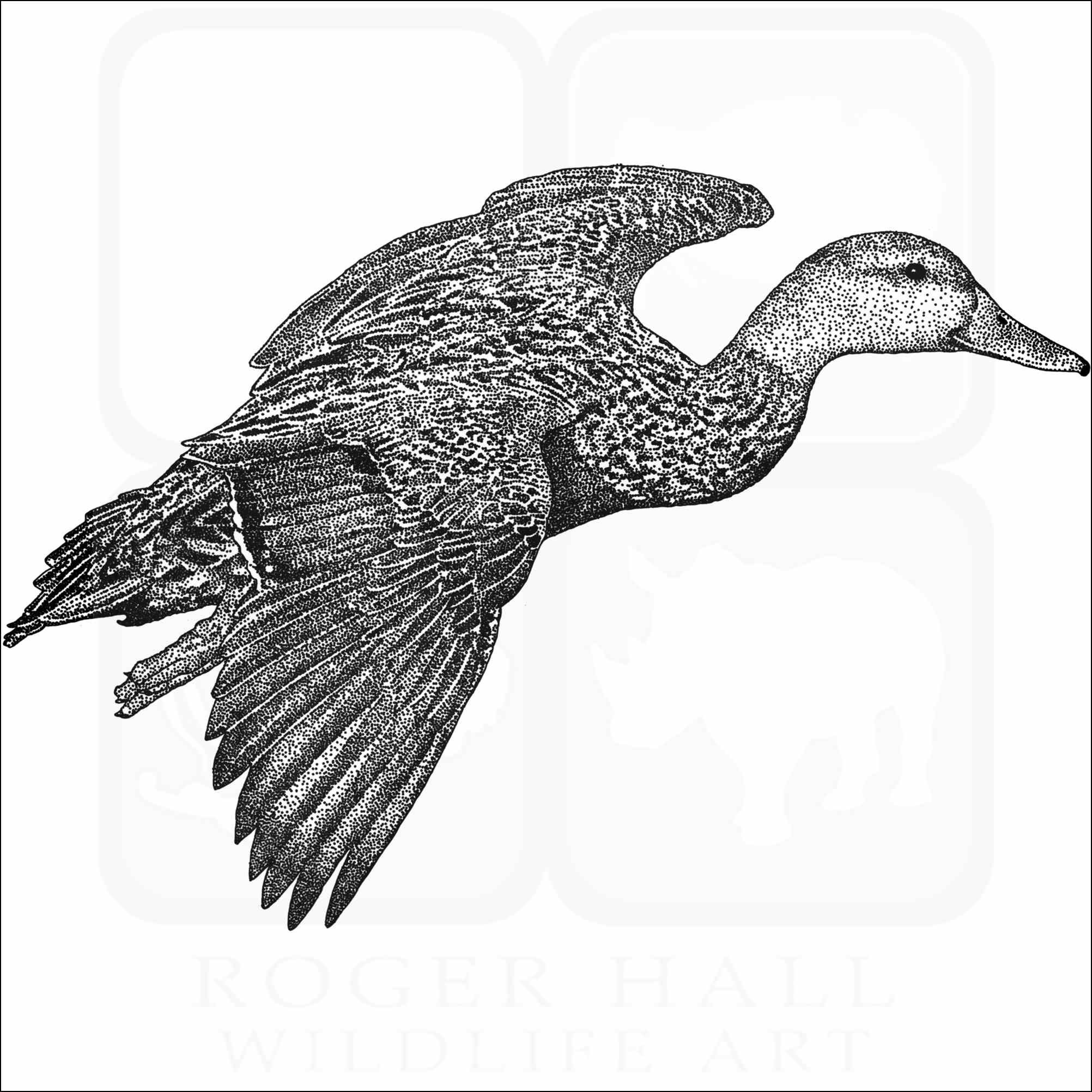 Fine art illustration of a Mottled Duck (Anas fulvigula.) The illustration is available in black and white or color.
