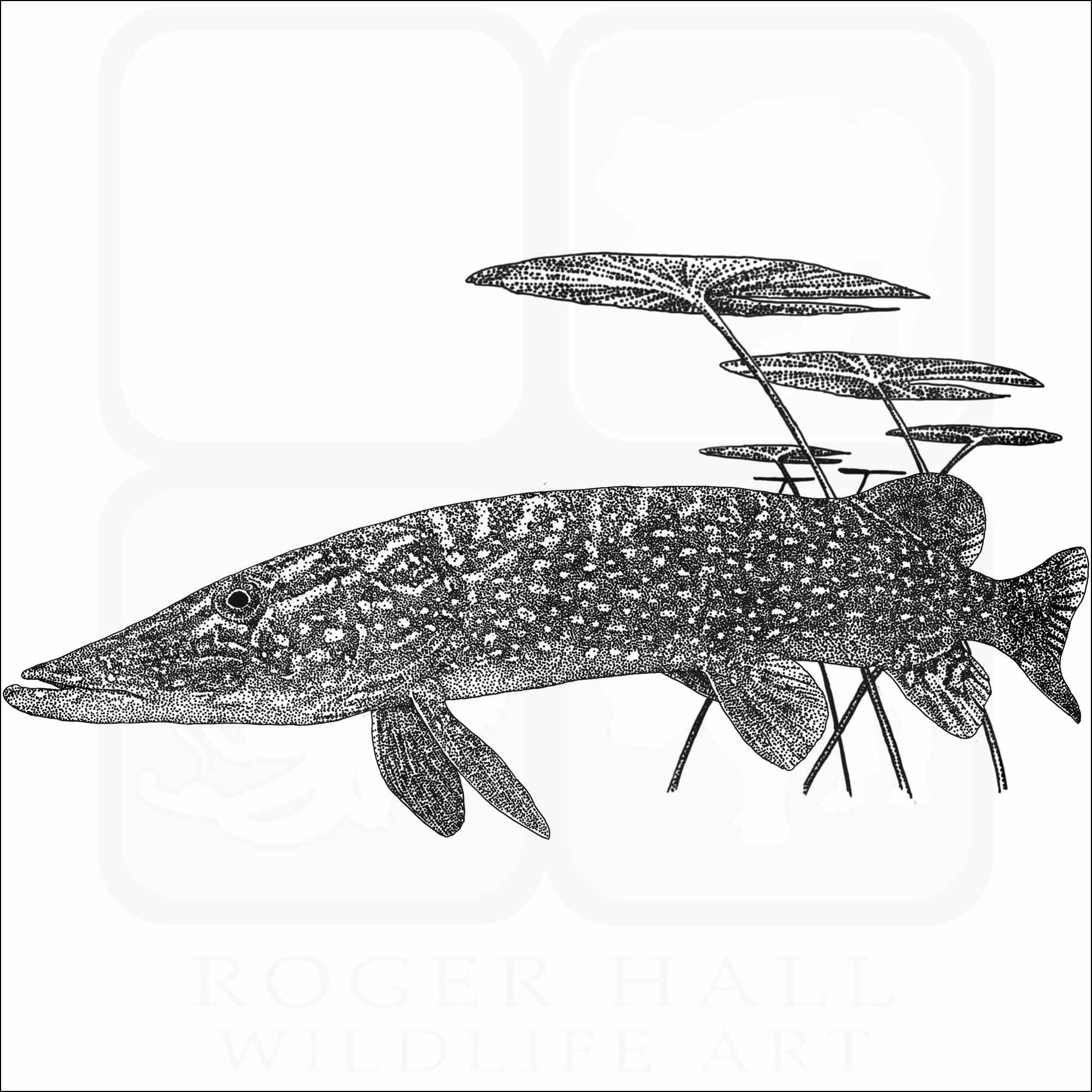 Fine art illustration of a Northern Pike (Esox lucius.) The illustration is available in black and white or color.
