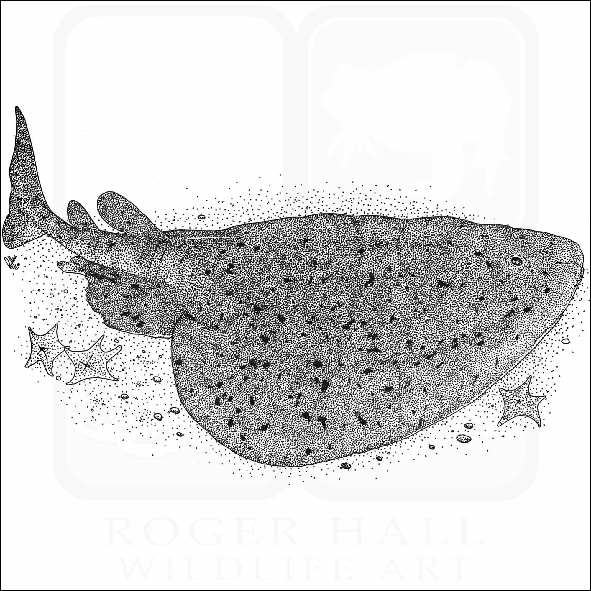 Fine art illustration of a Torpedo or Pacific Electric Ray (Torpedo californica.) The illustration is available in black and white or color.