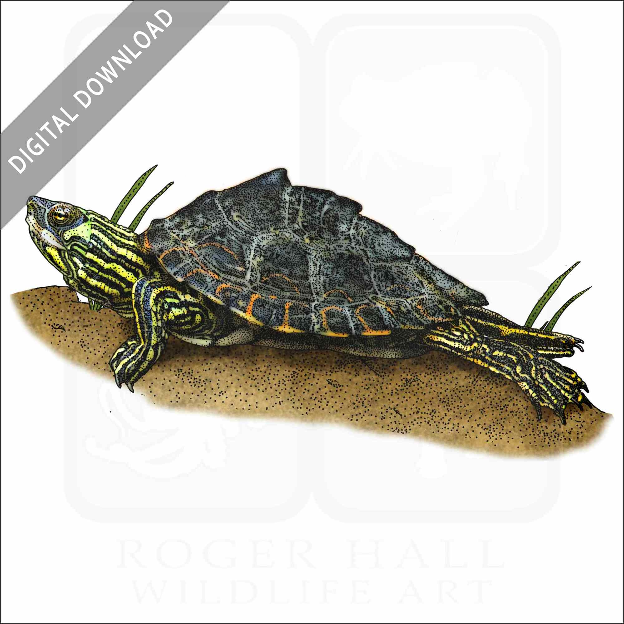 Stock art illustration of a Pearl River Map Turtle (Graptemys pearlensis.) The illustration is available in black and white or color for immediate download.