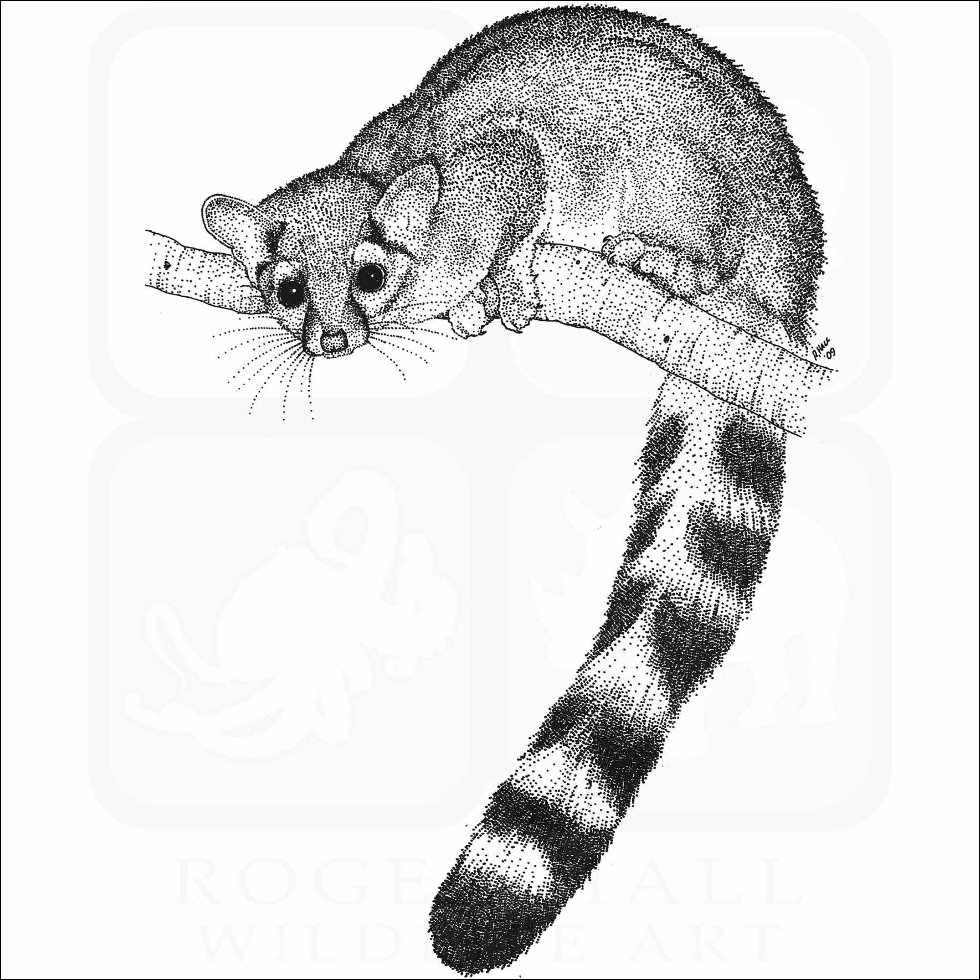 Fine art illustration of a Ring-Tailed Cat (Bassariscus astutus.) The illustration is available in black and white or color.