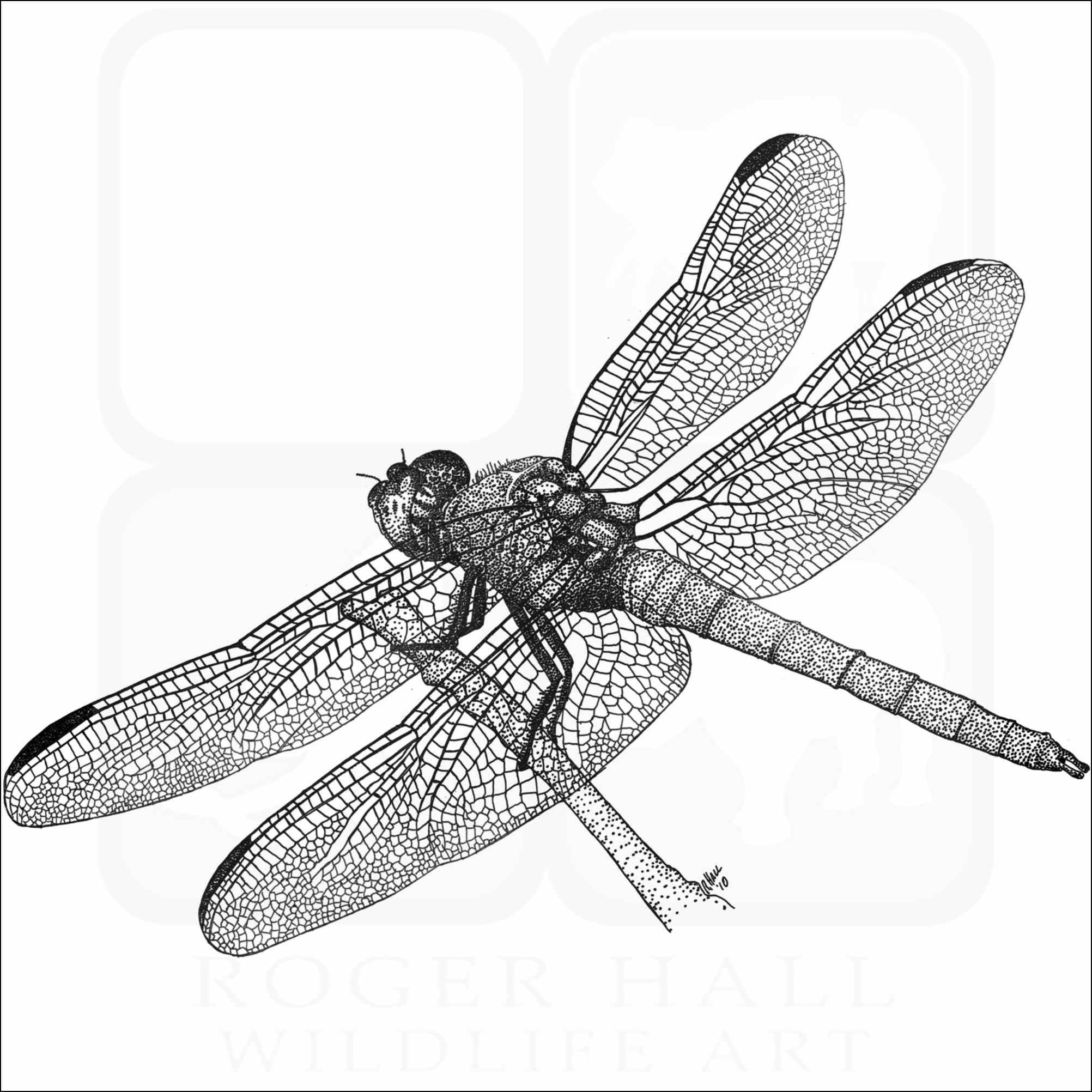 Fine art illustration of a Roseate Skimmer Dragonfly (Orthemis ferruginea.) The illustration is available in black and white or color.