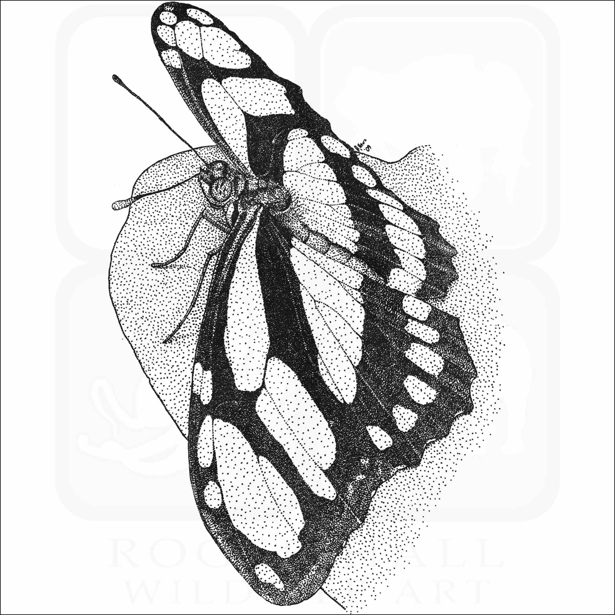 Fine art illustration of a Scarce Bamboo Page Butterfly (Philaethria dido.) The illustration is available in black and white or color.