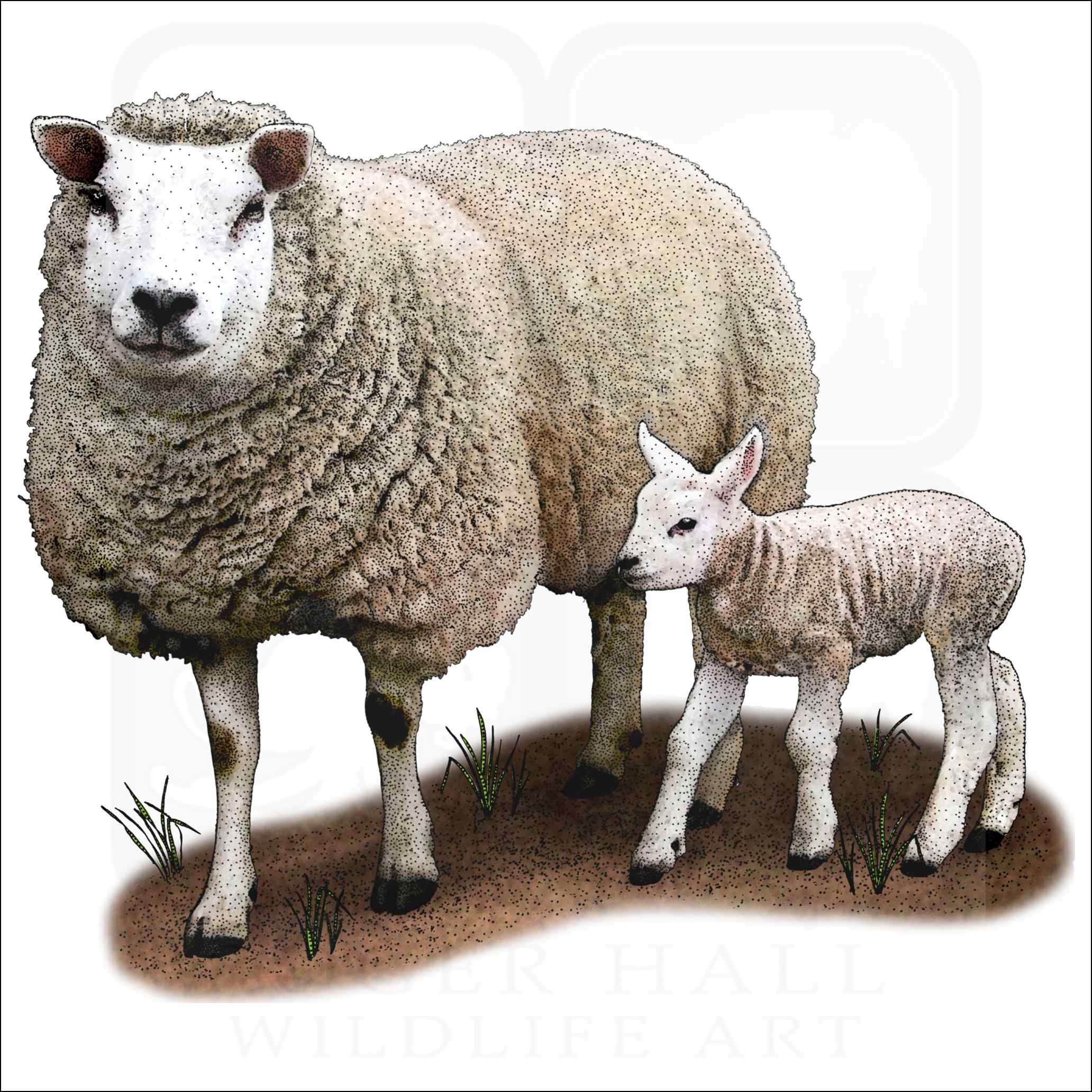 Fine art illustration of a Texel Sheep (Ovis aries.) The illustration is available in black and white or color.