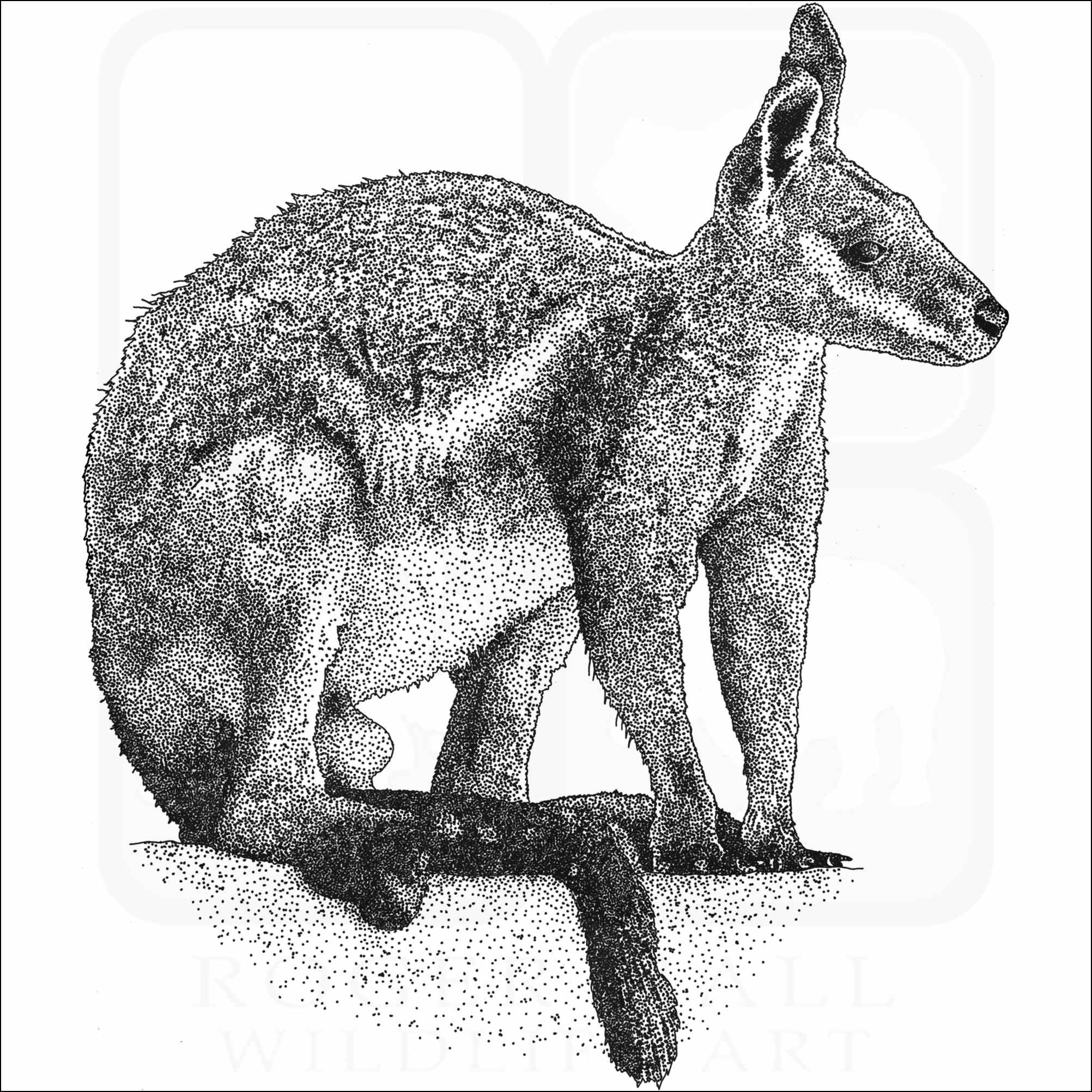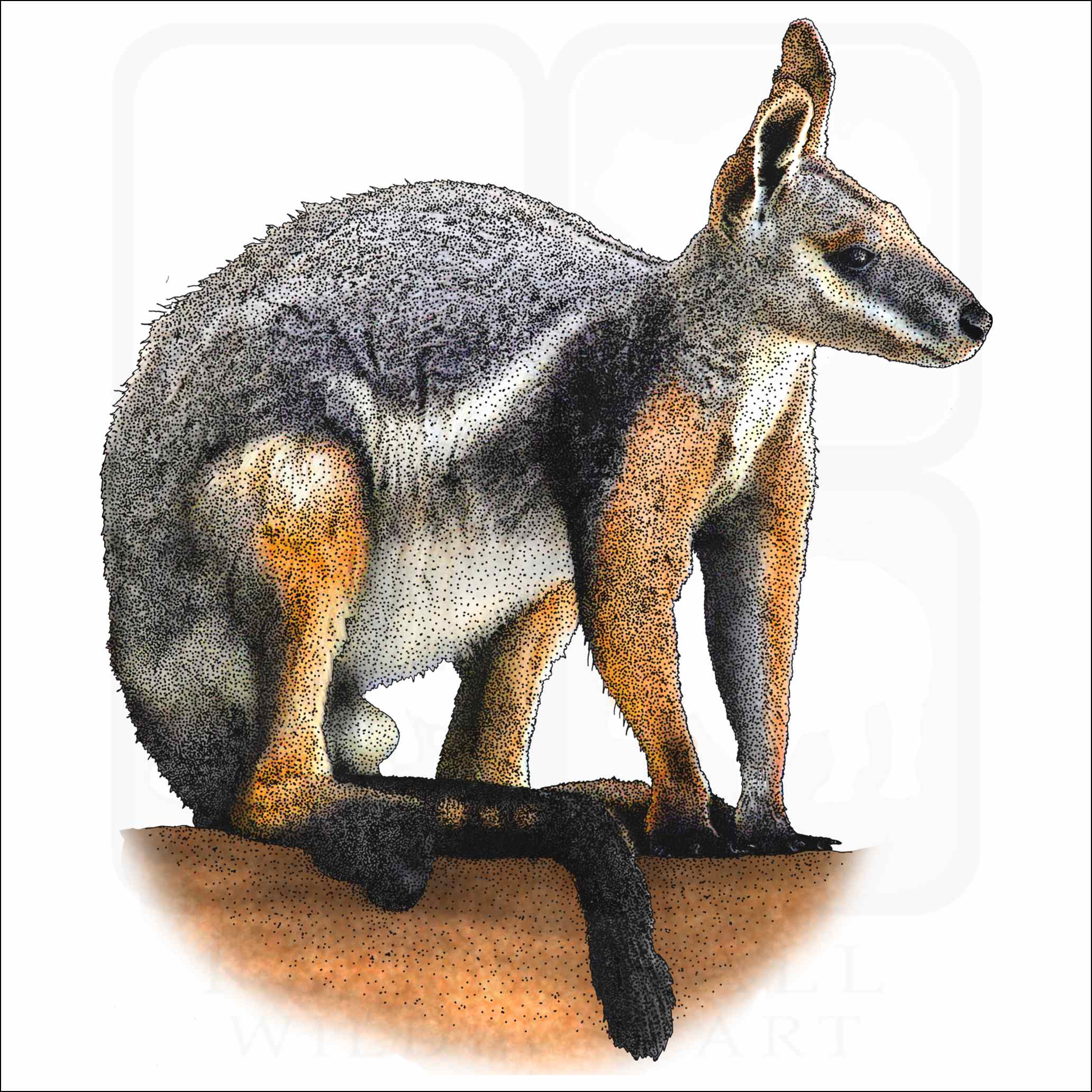 Fine art illustration of a Yellow-Footed Rock-Wallaby (Petrogale xanthopus.) The illustration is available in black and white or color.