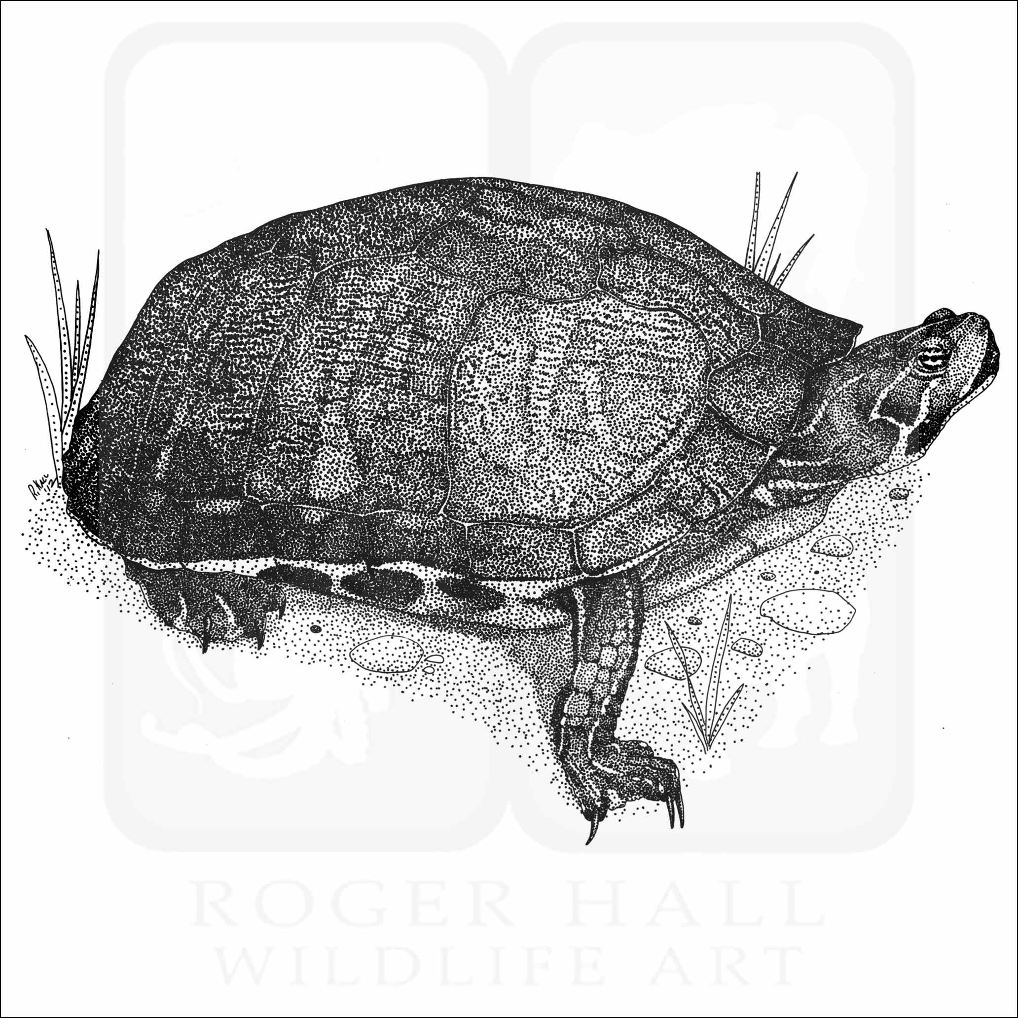 Fine art illustration of a Florida Red-Bellied Turtle or Cooter (Pseudemys nelsoni.) The illustration is available in black and white or color.