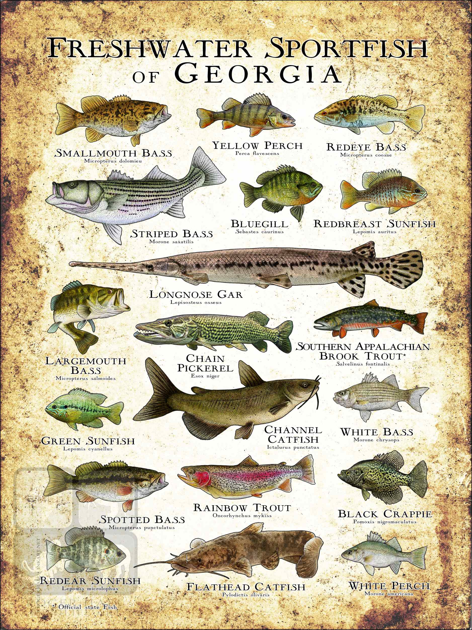 The US state of Georgia has several different native species of sportfish, including such popular species as Chain Pickerel, Striped Bass, Flathead Catfish and the official state freshwater fish of Georgia: The Southern Appalachian Brook Trout. Here are some selected species printed on a colorful, high quality poster. All images are drawn beautifully and with amazing scientific accuracy.