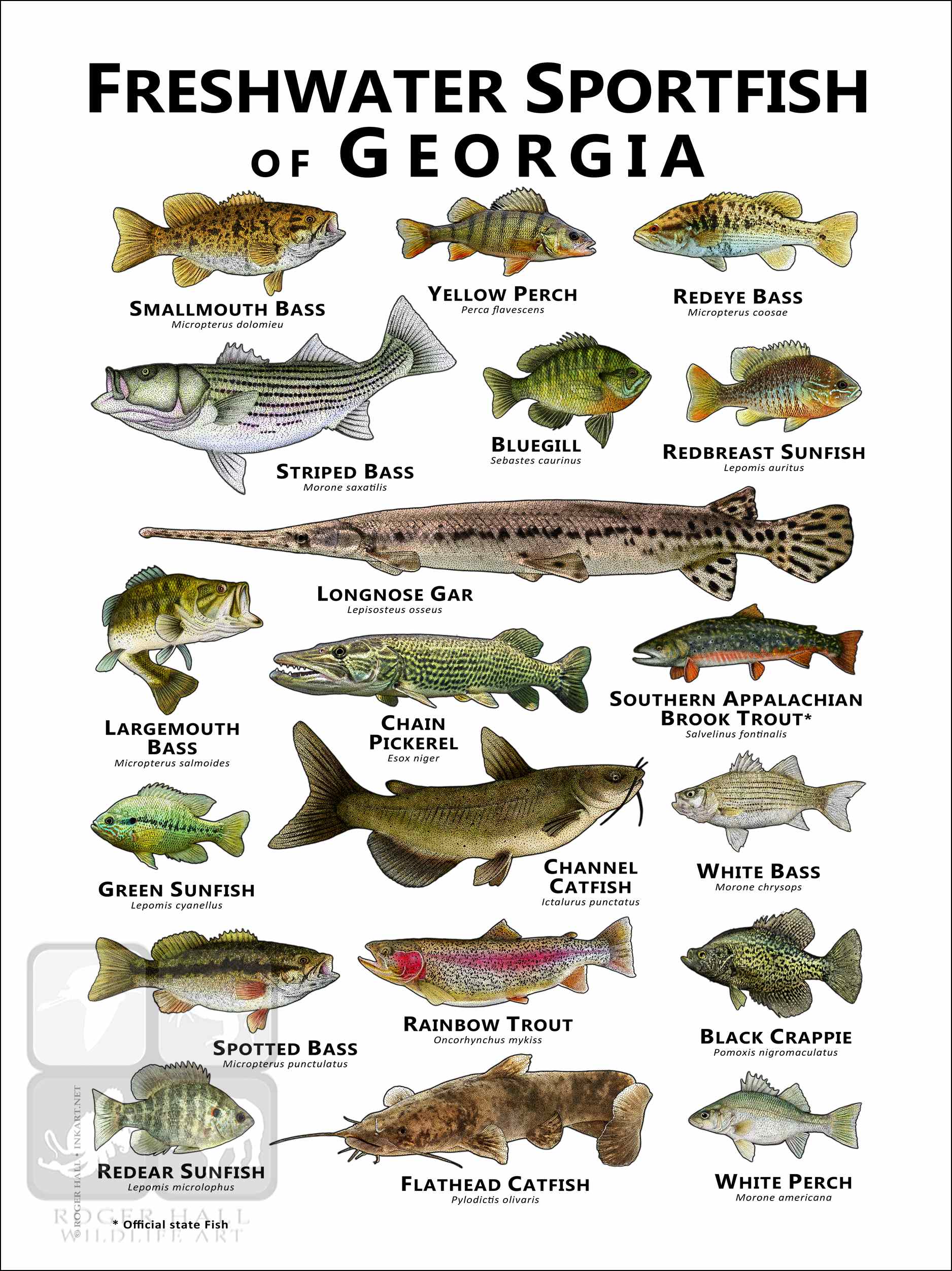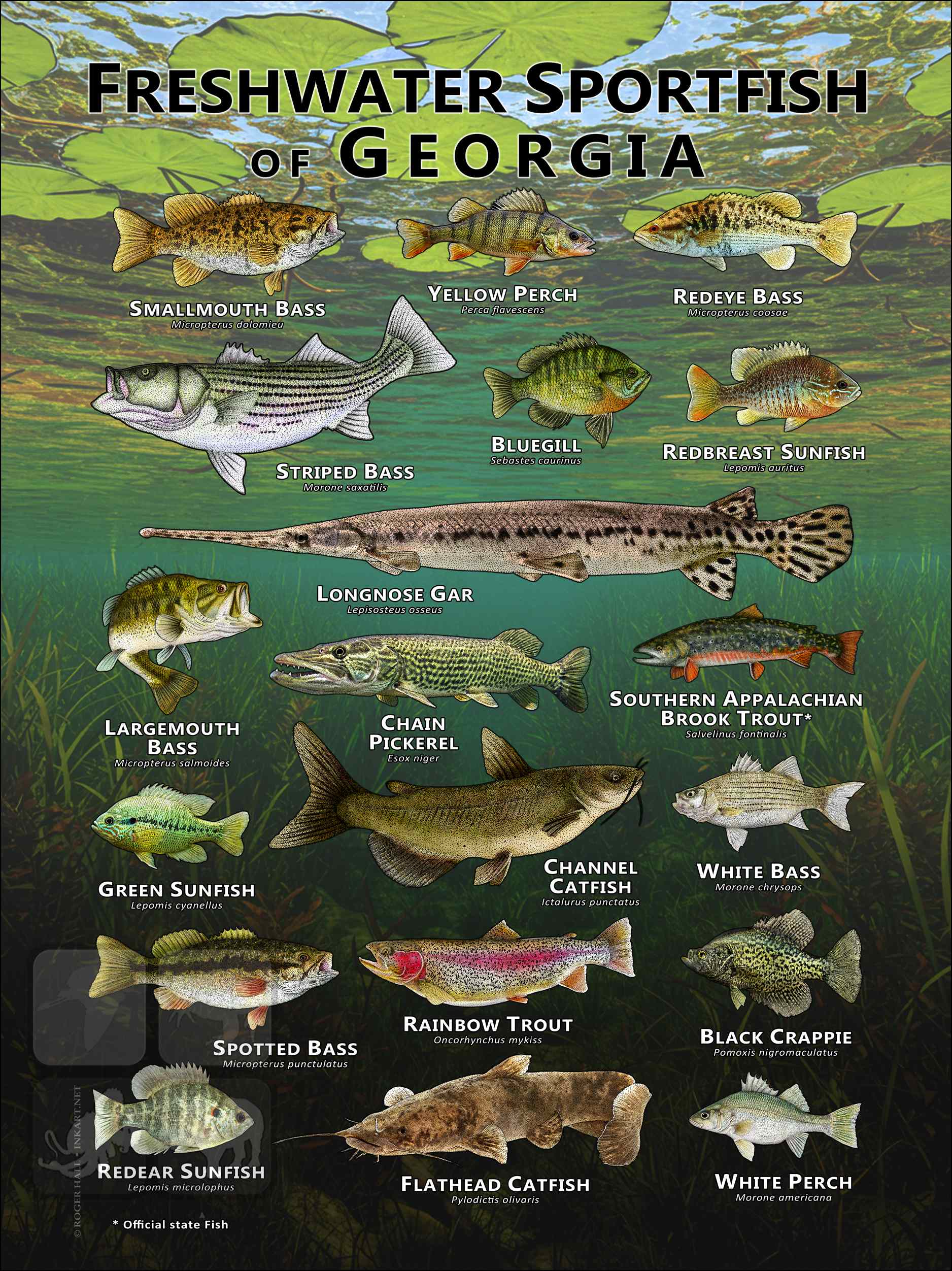 BLACK CRAPPIE (Pomoxis nigromaculatus) • BLUEGILL (Sebastes caurinus) • CHAIN PICKEREL (Esox niger) • CHANNEL CATFISH (Ictalurus punctatus) • FLATHEAD CATFISH (Pylodictis olivaris) • GREEN SUNFISH (Lepomis cyanellus) • LARGEMOUTH BASS (Micropterus salmoides) • LONGNOSE GAR (Lepisosteus osseus) •  REDBREAST SUNFISH (Lepomis auritus) • REDEAR SUNFISH (Lepomis microlophus) • REDEYE BASS (Micropterus coosae) • SMALLMOUTH BASS (Micropterus dolomieu) • SPOTTED BASS (Micropterus punctulatus) • SOUTHERN APPALACHIAN BROOK TROUT (Salvelinus fontinalis) • STRIPED BASS (Morone saxatilis) • WHITE BASS (Morone chrysops) • WHITE PERCH (Morone americana) • YELLOW PERCH (Perca flavescens)