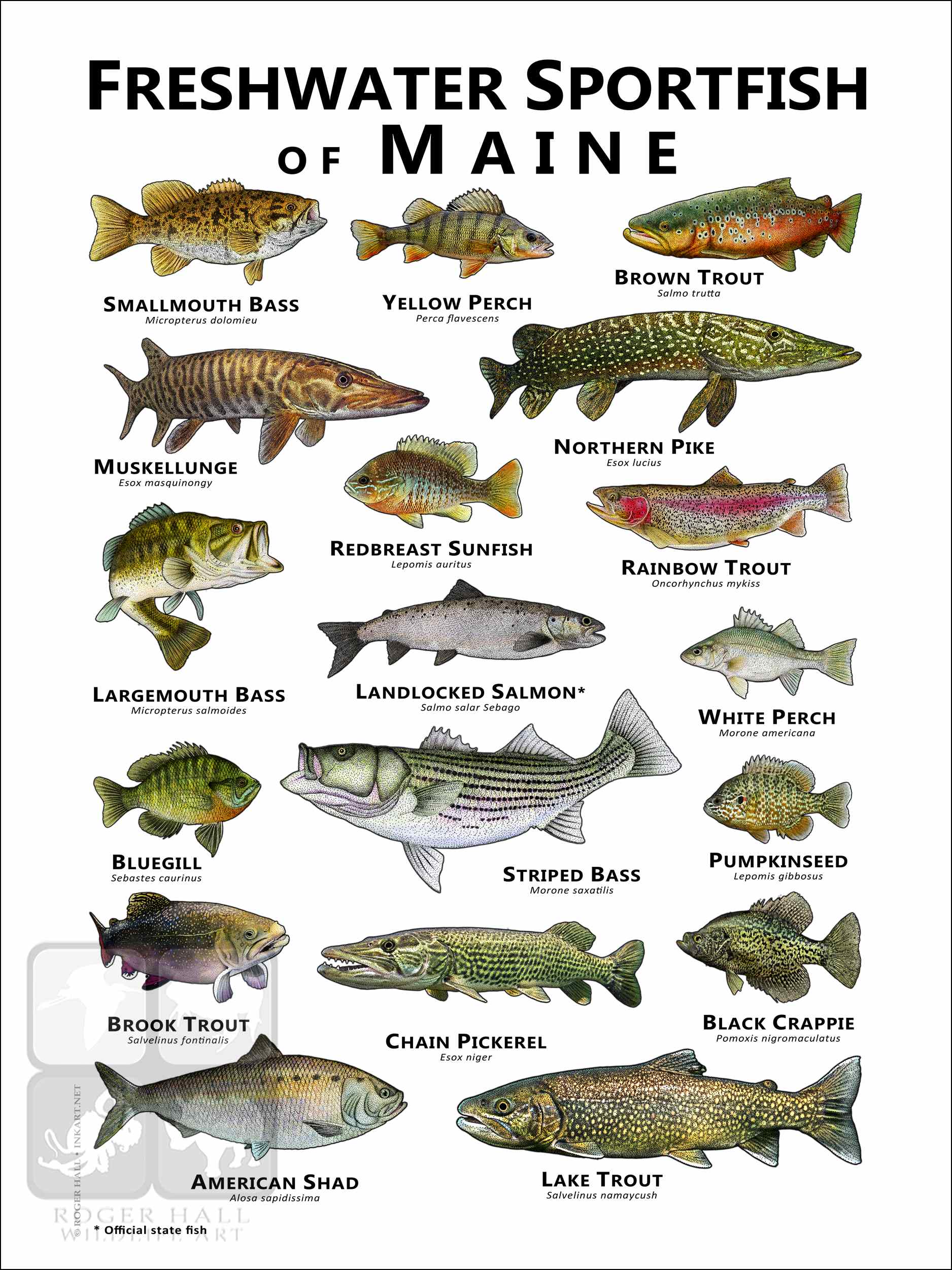 AMERICAN SHAD (Alosa sapidissima) • BLACK CRAPPIE (Pomoxis nigromaculatus) • BLUEGILL (Sebastes caurinus) • BROOK TROUT (Salvelinus fontinalis) • BROWN TROUT  (Salmo trutta) • CHAIN PICKEREL (Esox niger) • LAKE TROUT (Salvelinus namaycush) • LANDLOCKED SALMON (Salmo salar Sebago) • LARGEMOUTH BASS (Micropterus salmoides) • MUSKELLUNGE (Esox masquinongy) • NORTHERN PIKE (Esox lucius) • PUMPKINSEED (Lepomis gibbosus) • RAINBOW TROUT (Oncorhynchus mykiss) • REDBREAST SUNFISH (Lepomis auritus) • SMALLMOUTH BASS (Micropterus dolomieu) • STRIPED BASS (Morone saxatilis) • WHITE PERCH (Morone americana) • YELLOW PERCH (Perca flavescens)