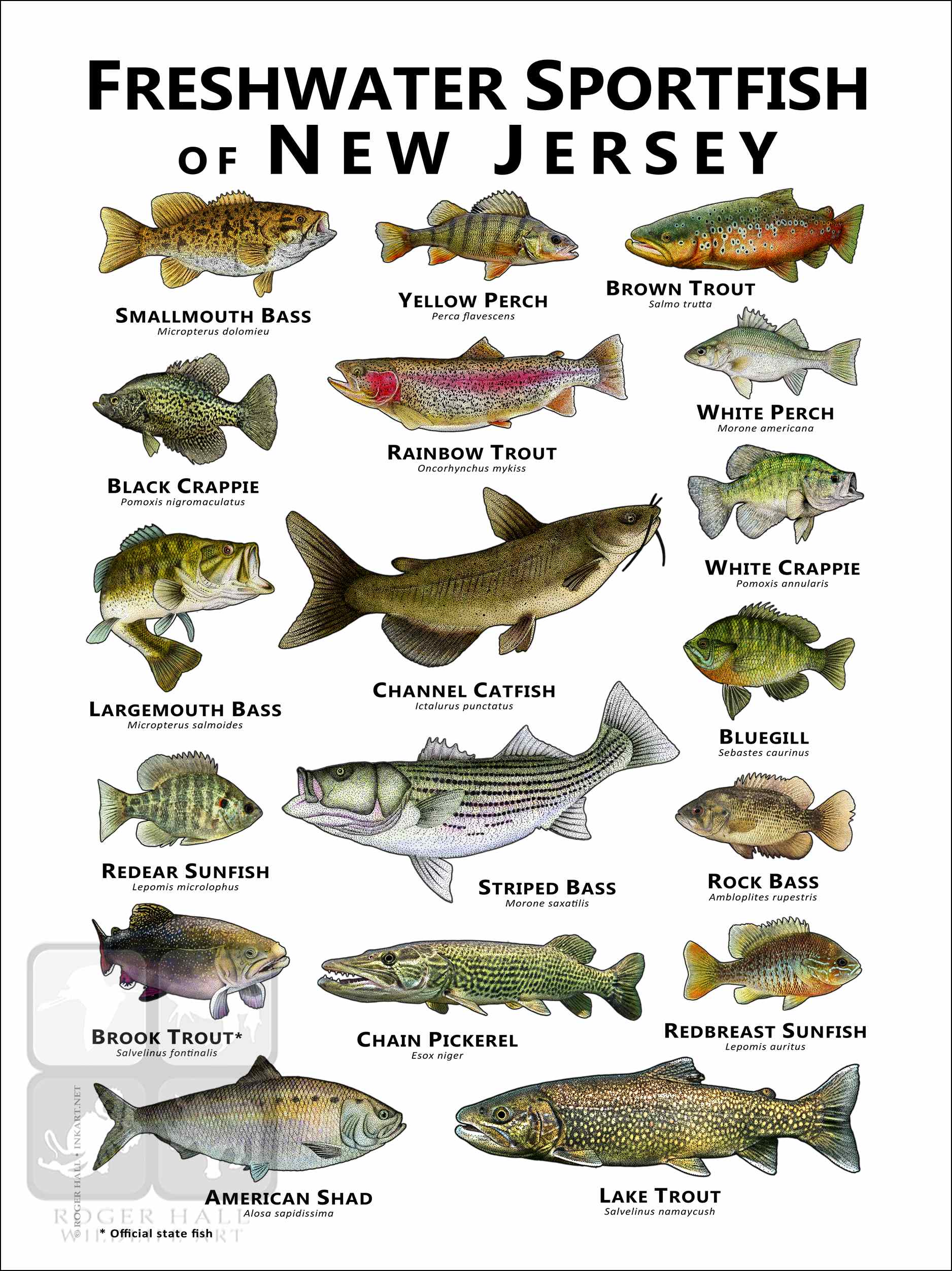 The US state of New Jersey has several different native species of sportfish, including such popular species as Chain Pickerel, Brook Trout, Striped Bass and Lake Trout. Here are some selected species printed on a colorful, high quality poster. All images are drawn beautifully and with amazing scientific accuracy.