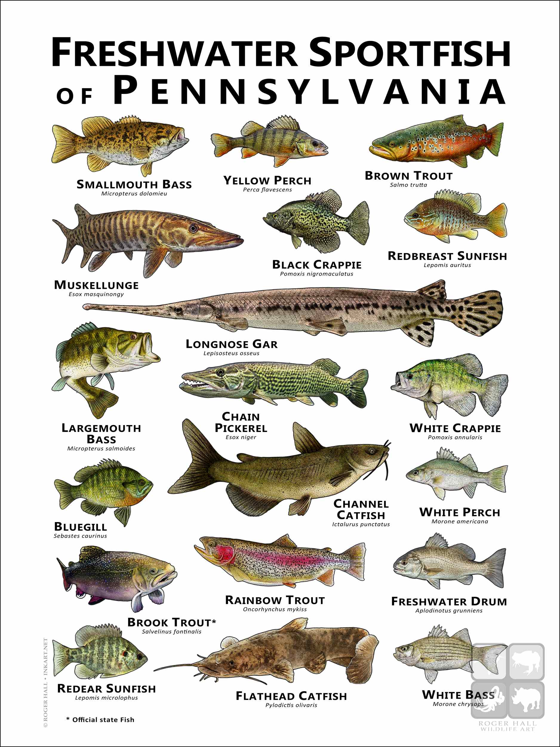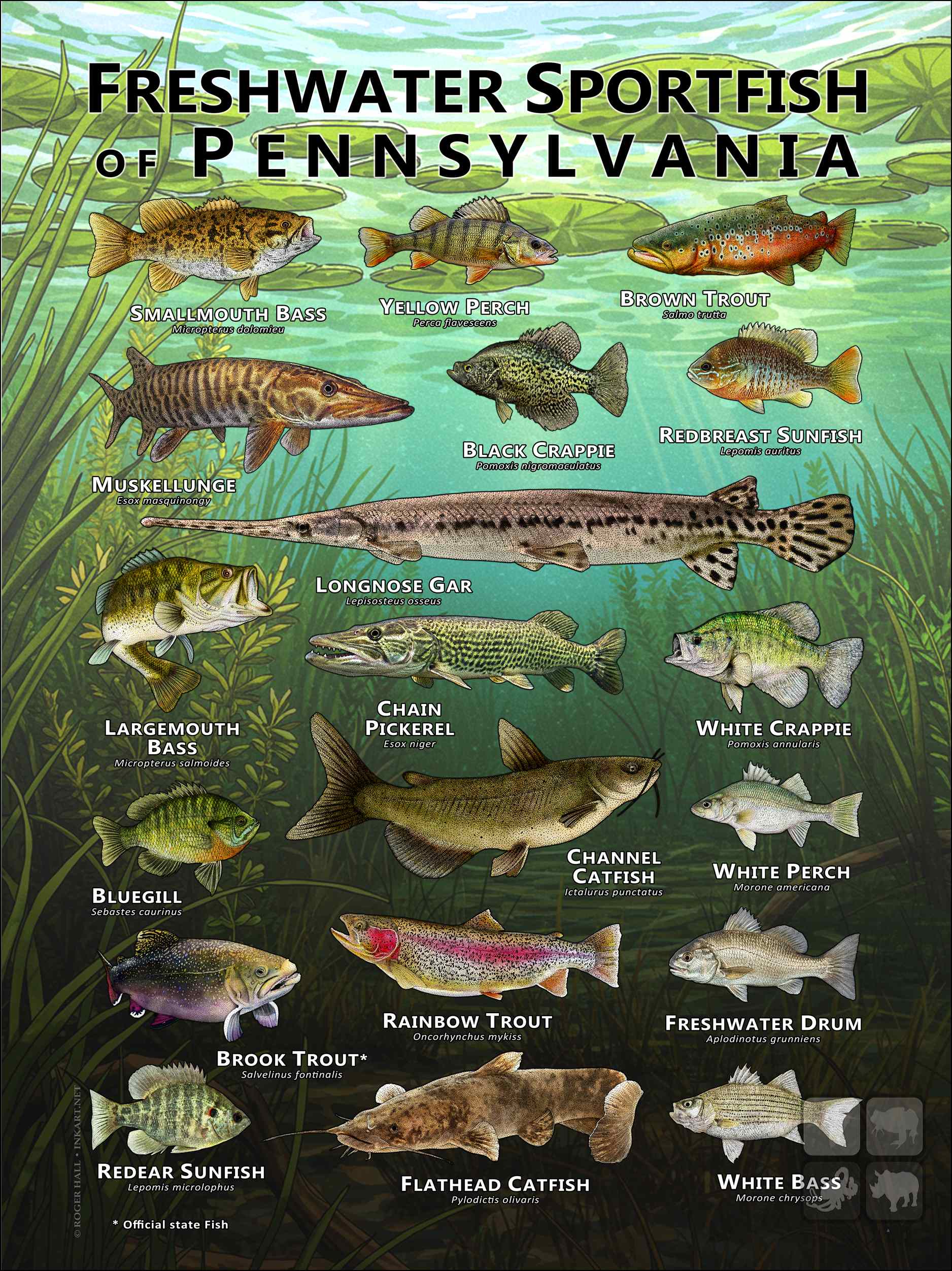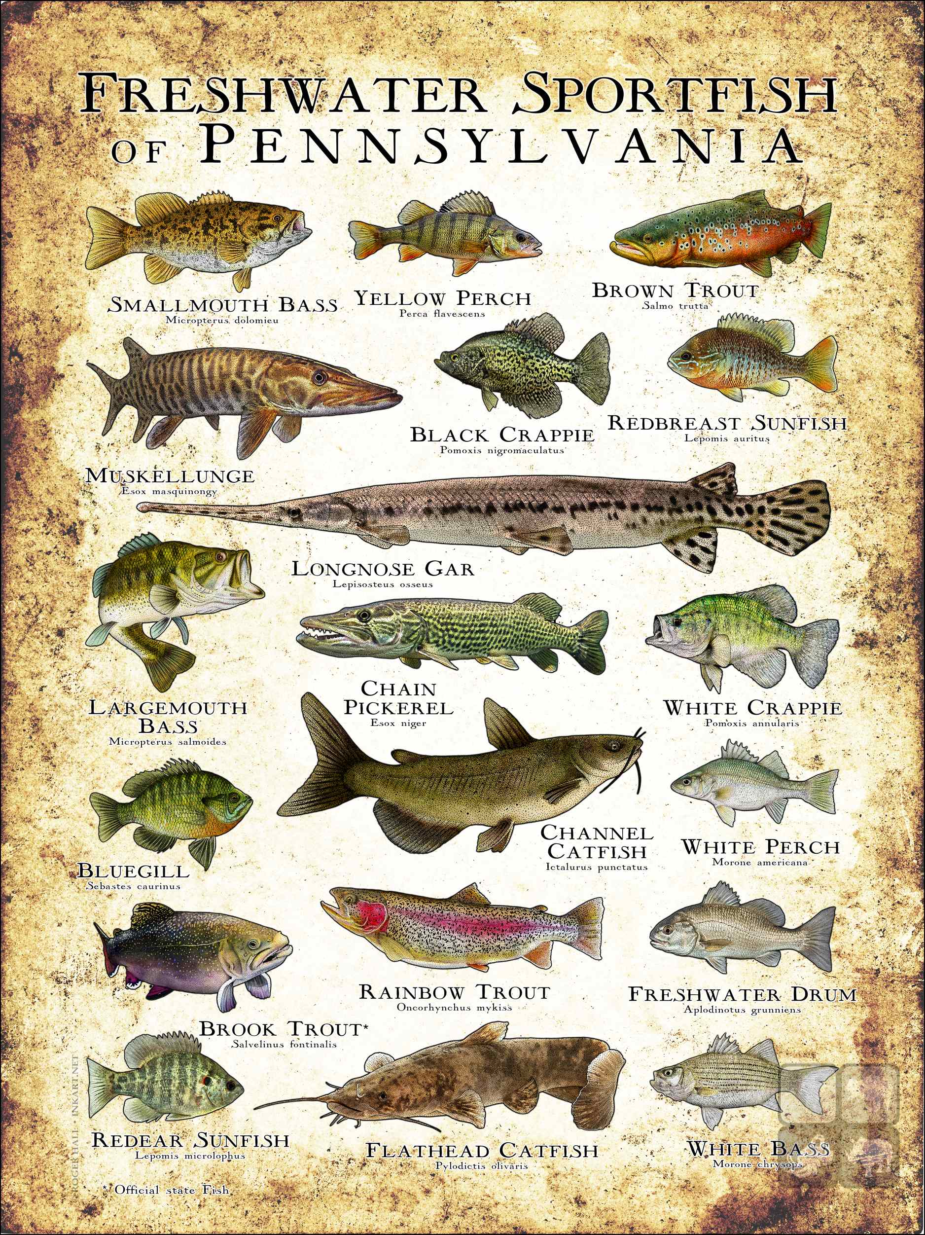 The US state of Pennsylvania has several different native species of sportfish, including such popular species as Chain Pickerel, Brook Trout, Muskellunge and Flathead Catfish. Here are some selected species printed on a colorful, high quality poster. All images are drawn beautifully and with amazing scientific accuracy.