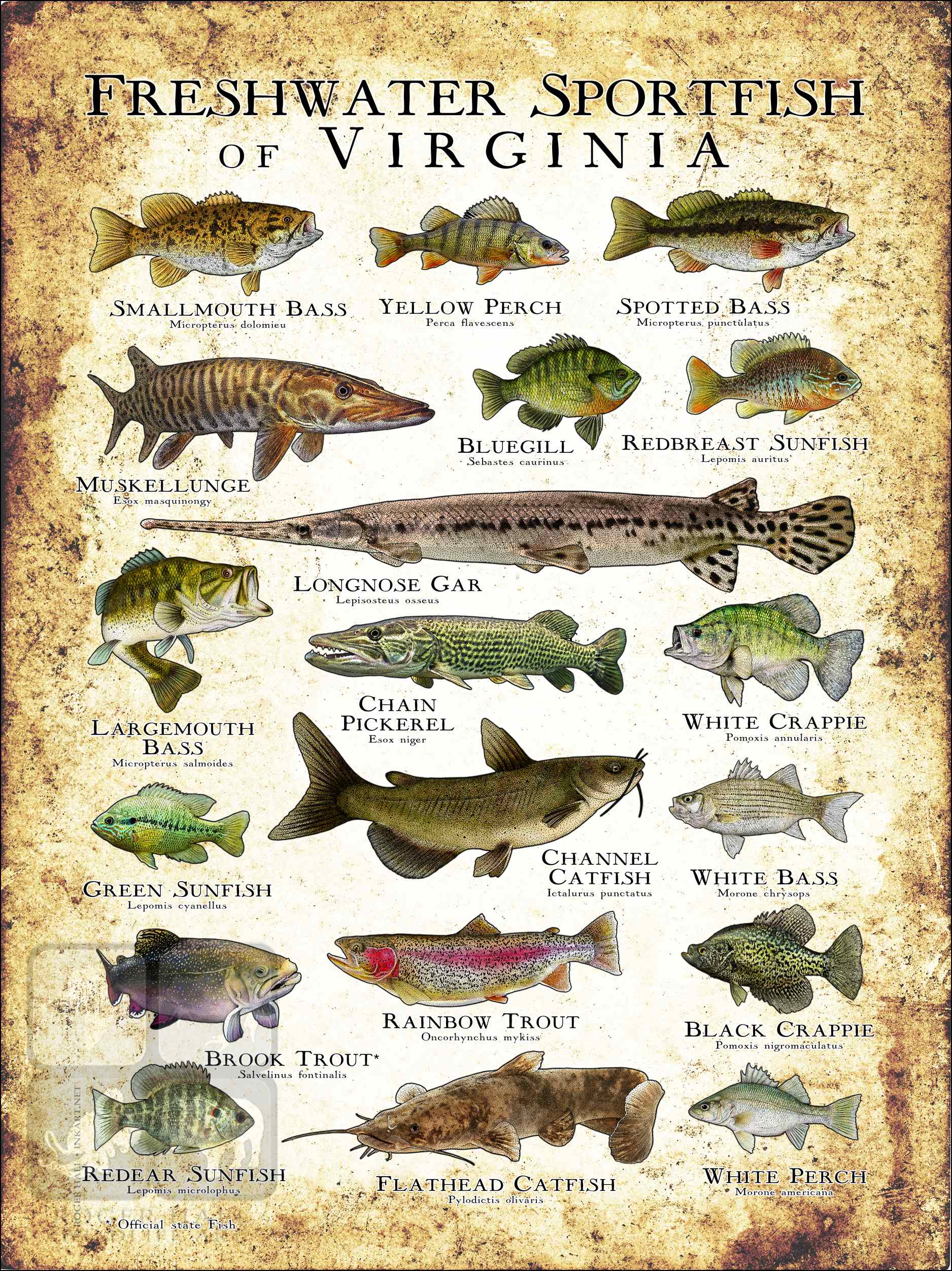The US state of Virginia has several different native species of sportfish, including such popular species as Chain Pickerel, Brook Trout, Muskellunge and Flathead Catfish. Here are some selected species printed on a colorful, high quality poster. All images are drawn beautifully and with amazing scientific accuracy.