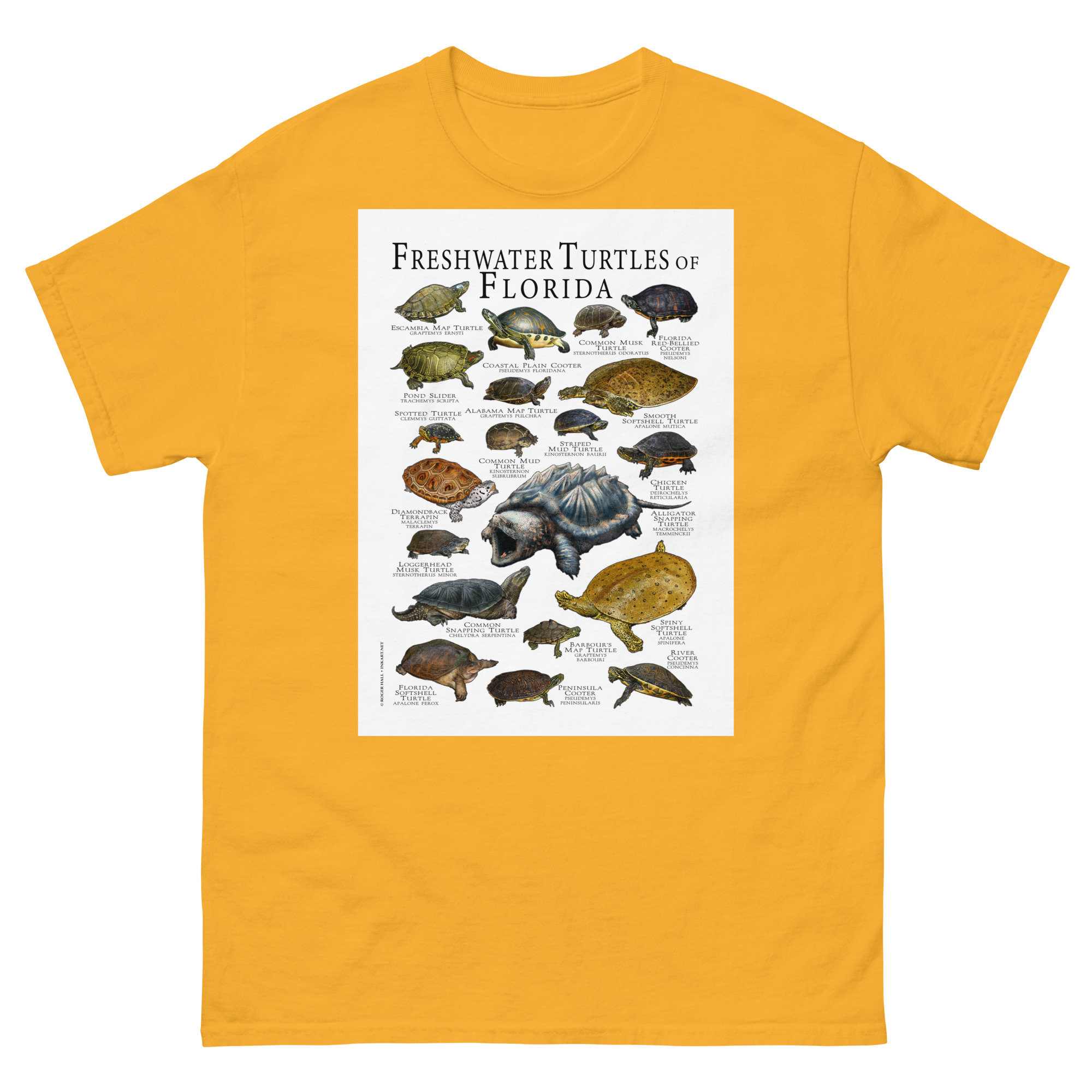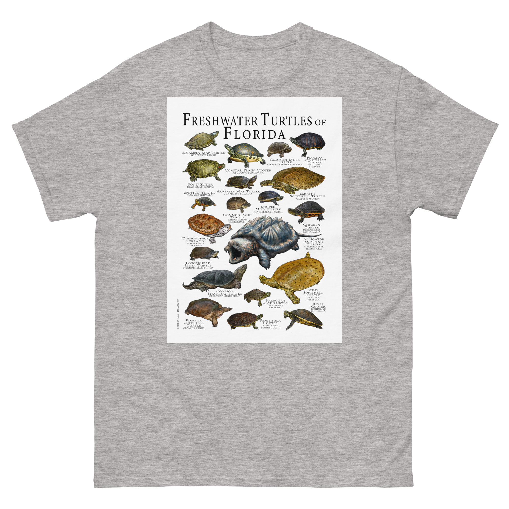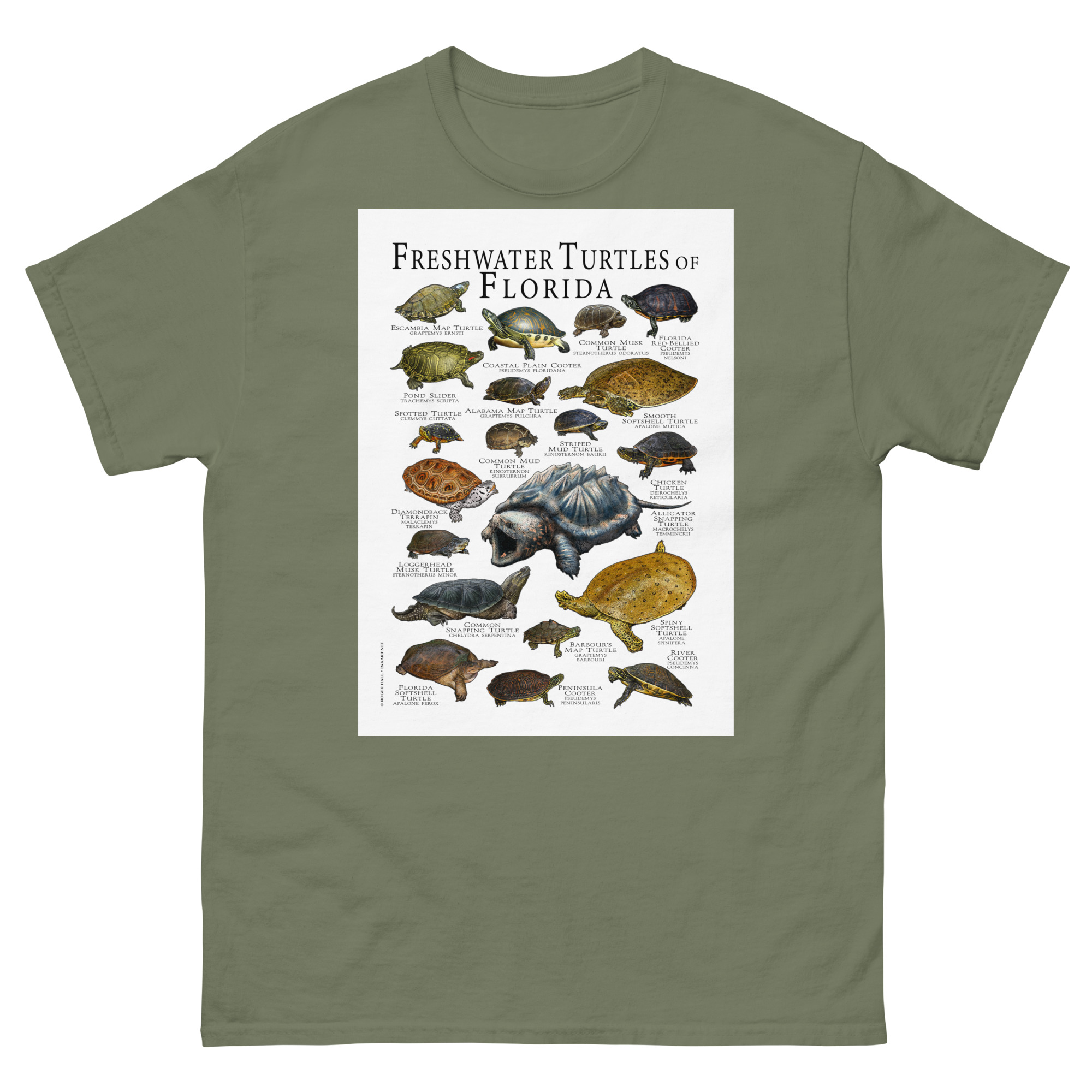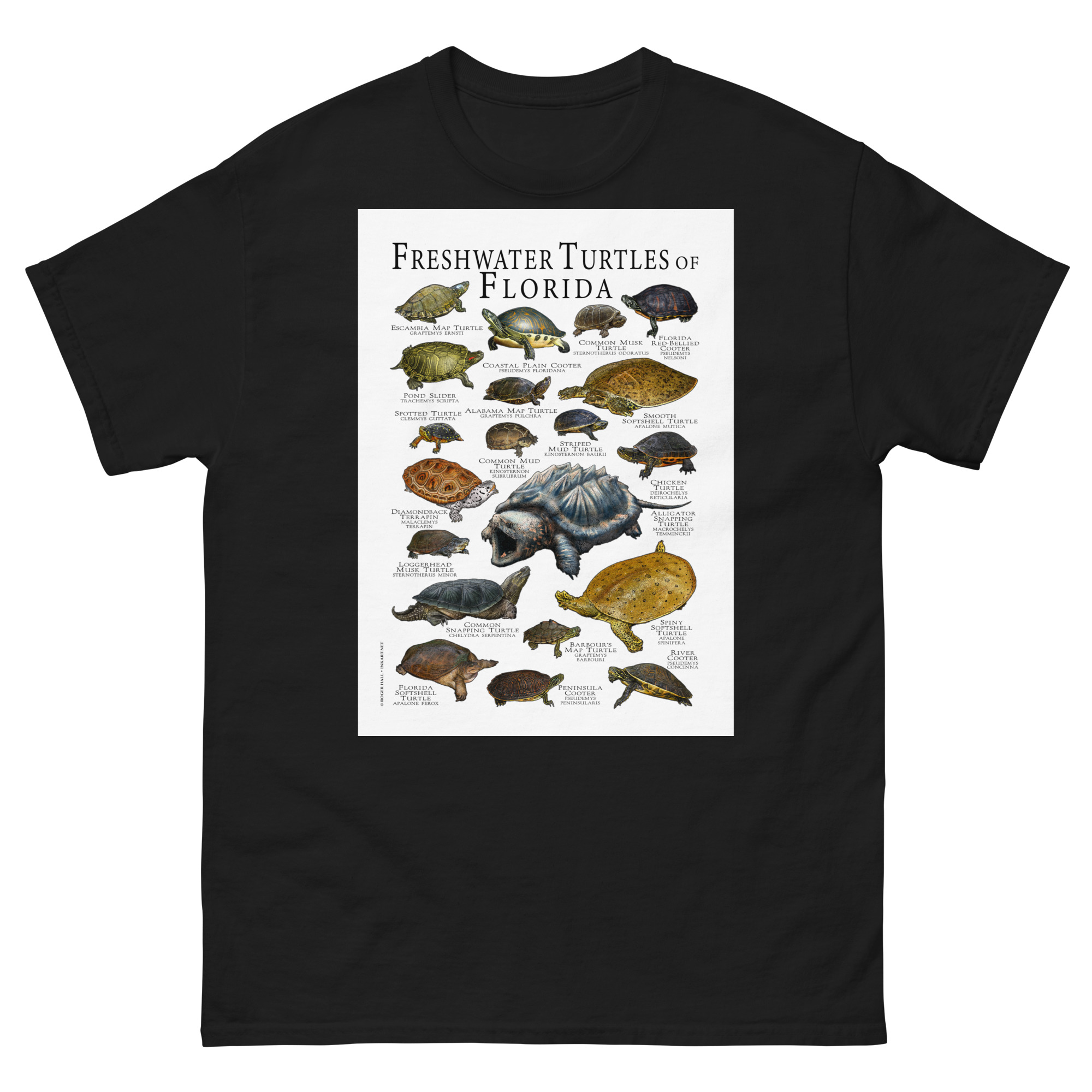 There are forty-nine species of turtles live in the United States and Canada, with the highest diversity in the Southeastern United States. This artwork features high-quality illustrations of the all freshwater turtles species native to the state of Florida, printed in a high-quality men’s cotton t-shirt.