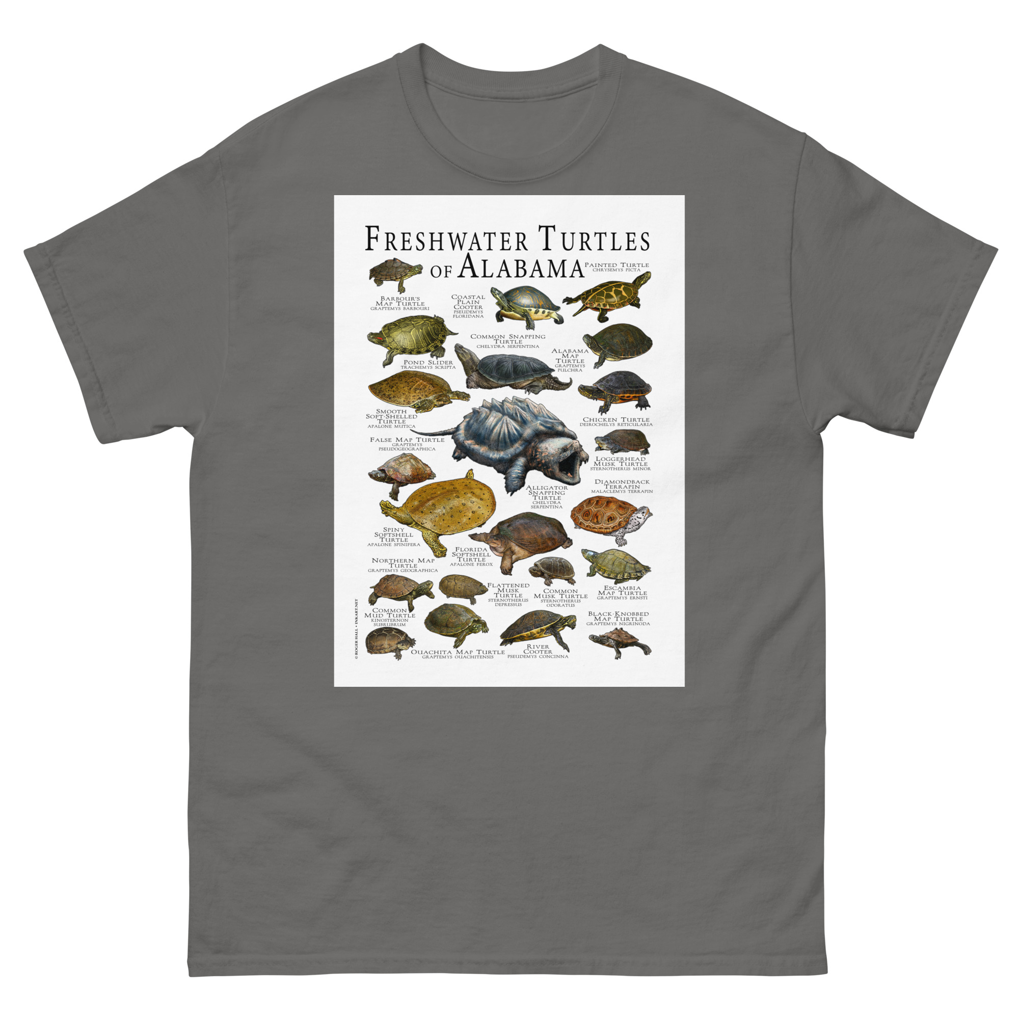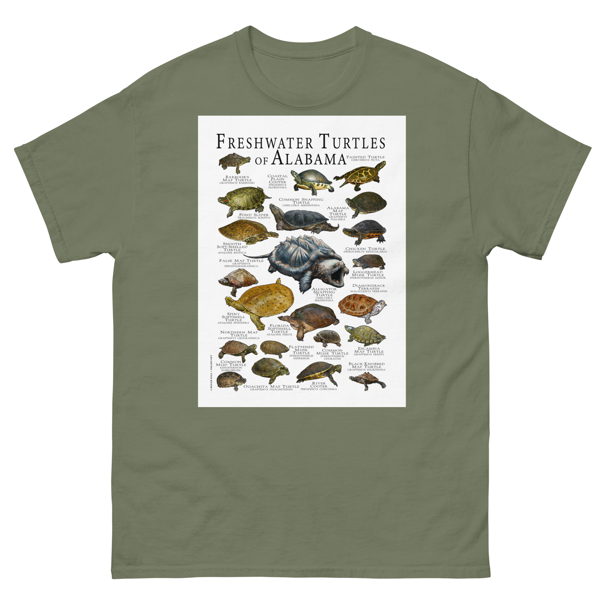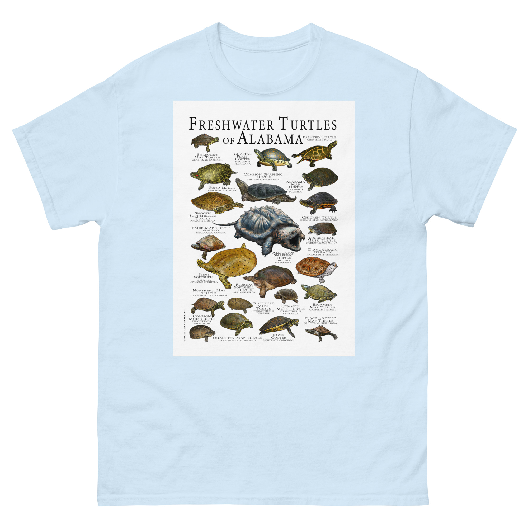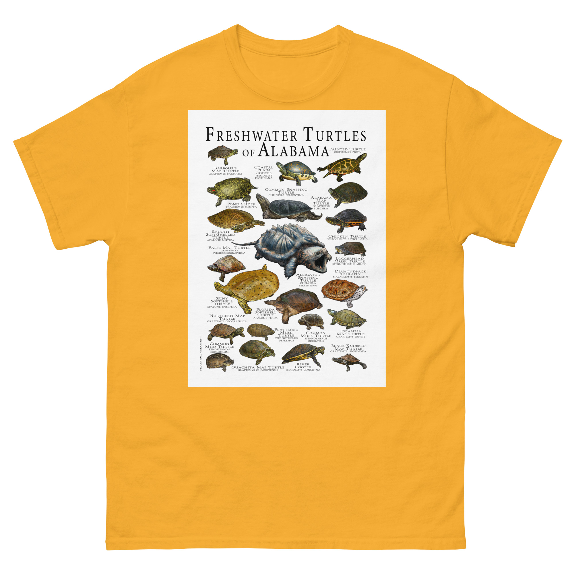 There are forty-nine species of turtles live in the United States and Canada, with the highest diversity in the Southeastern United States. This artwork features high-quality illustrations of the all freshwater turtles species native to the state of Alabama, printed in a high-quality men’s cotton t-shirt.