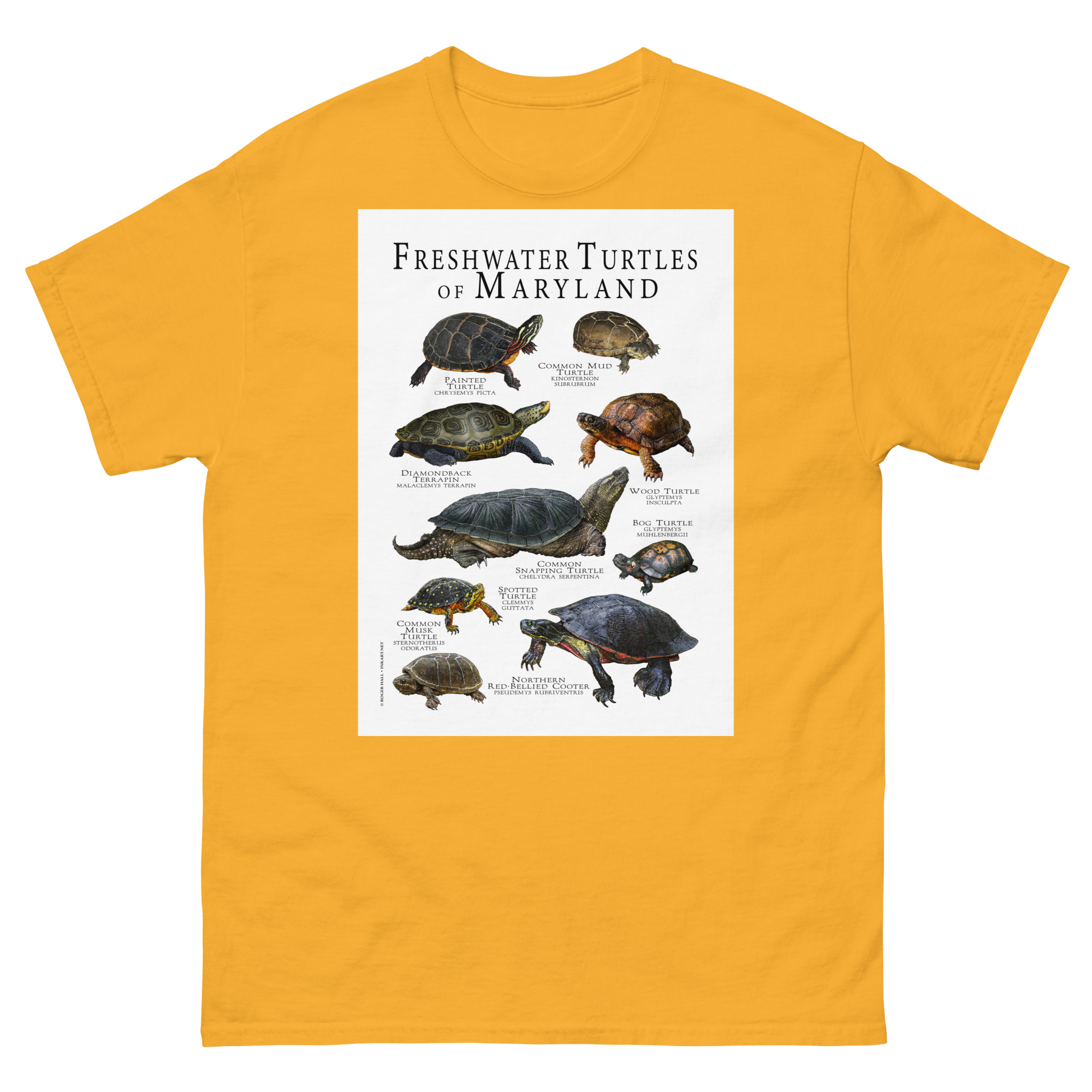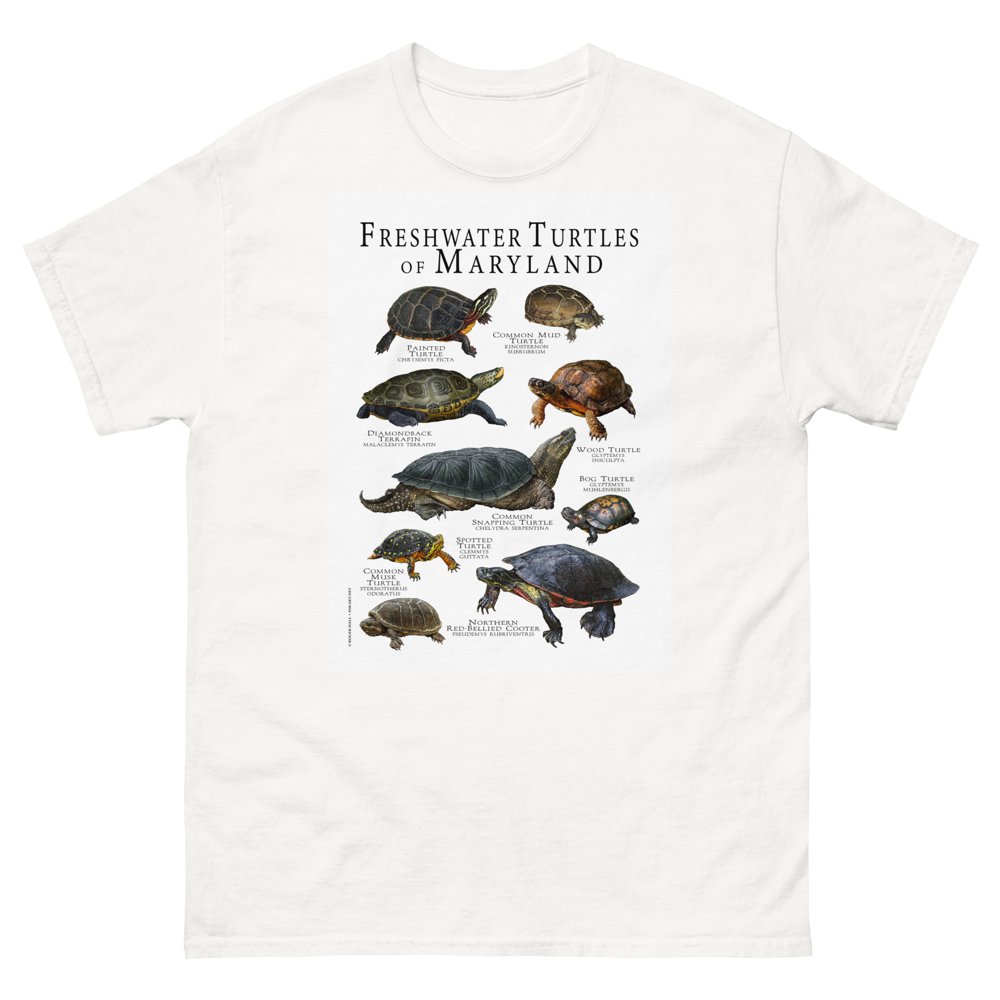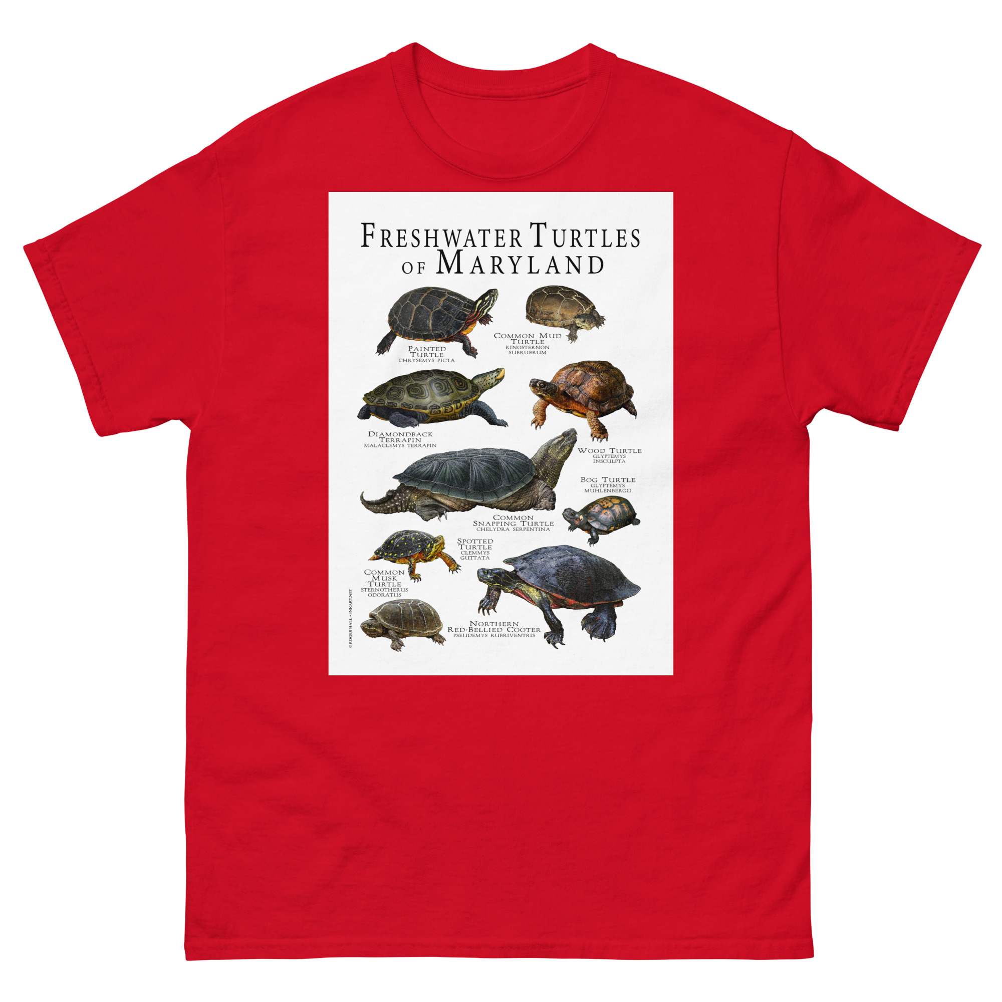 There are forty-nine species of turtles live in the United States and Canada, with the highest diversity in the Southeastern United States. This artwork features high-quality illustrations of the all freshwater turtles species native to the state of Maryland, printed in a high-quality men’s cotton t-shirt.
