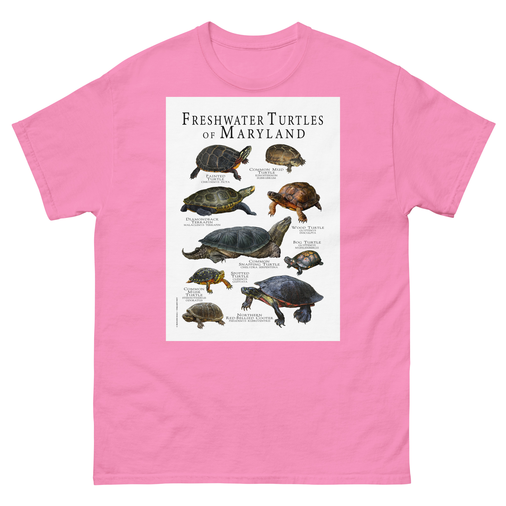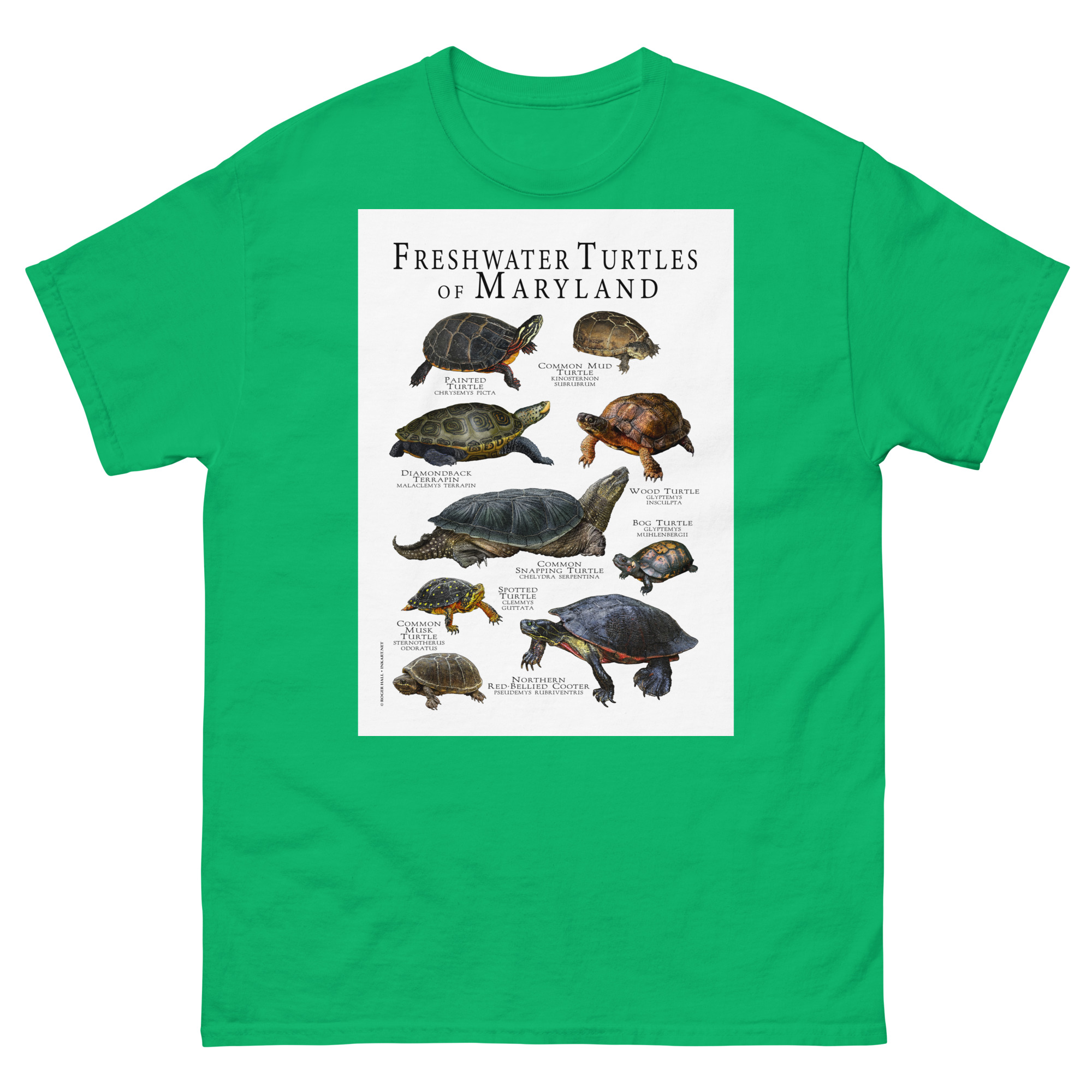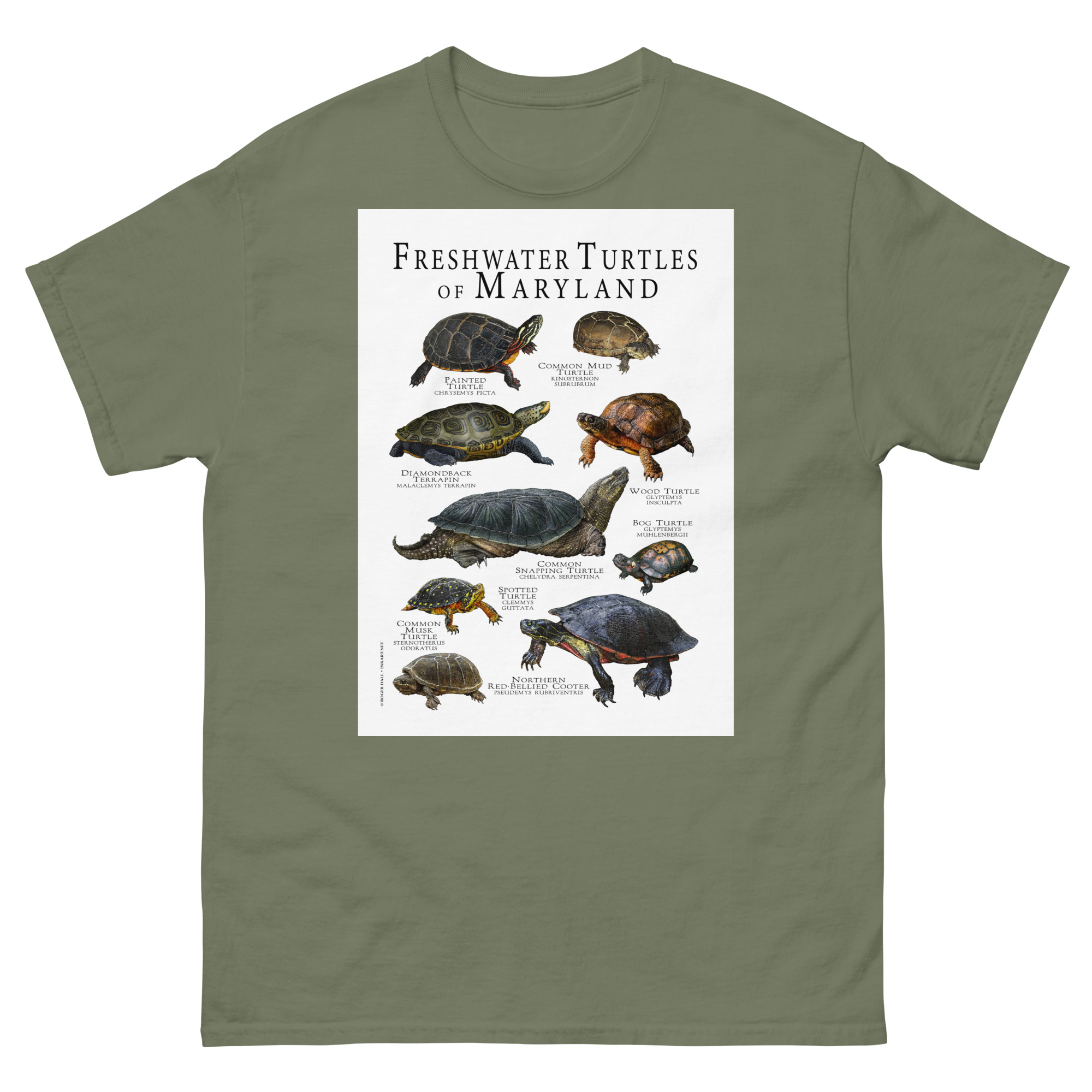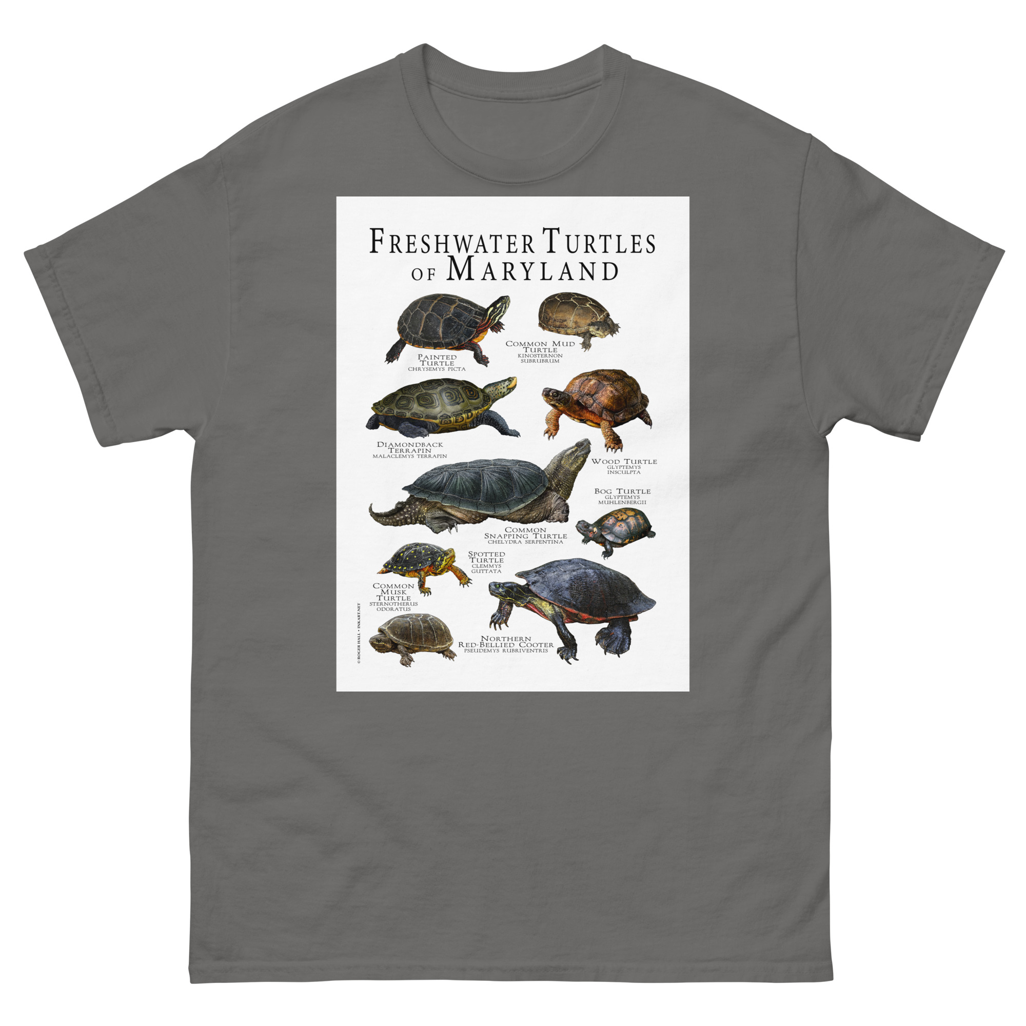 There are forty-nine species of turtles live in the United States and Canada, with the highest diversity in the Southeastern United States. This artwork features high-quality illustrations of the all freshwater turtles species native to the state of Maryland, printed in a high-quality men’s cotton t-shirt.