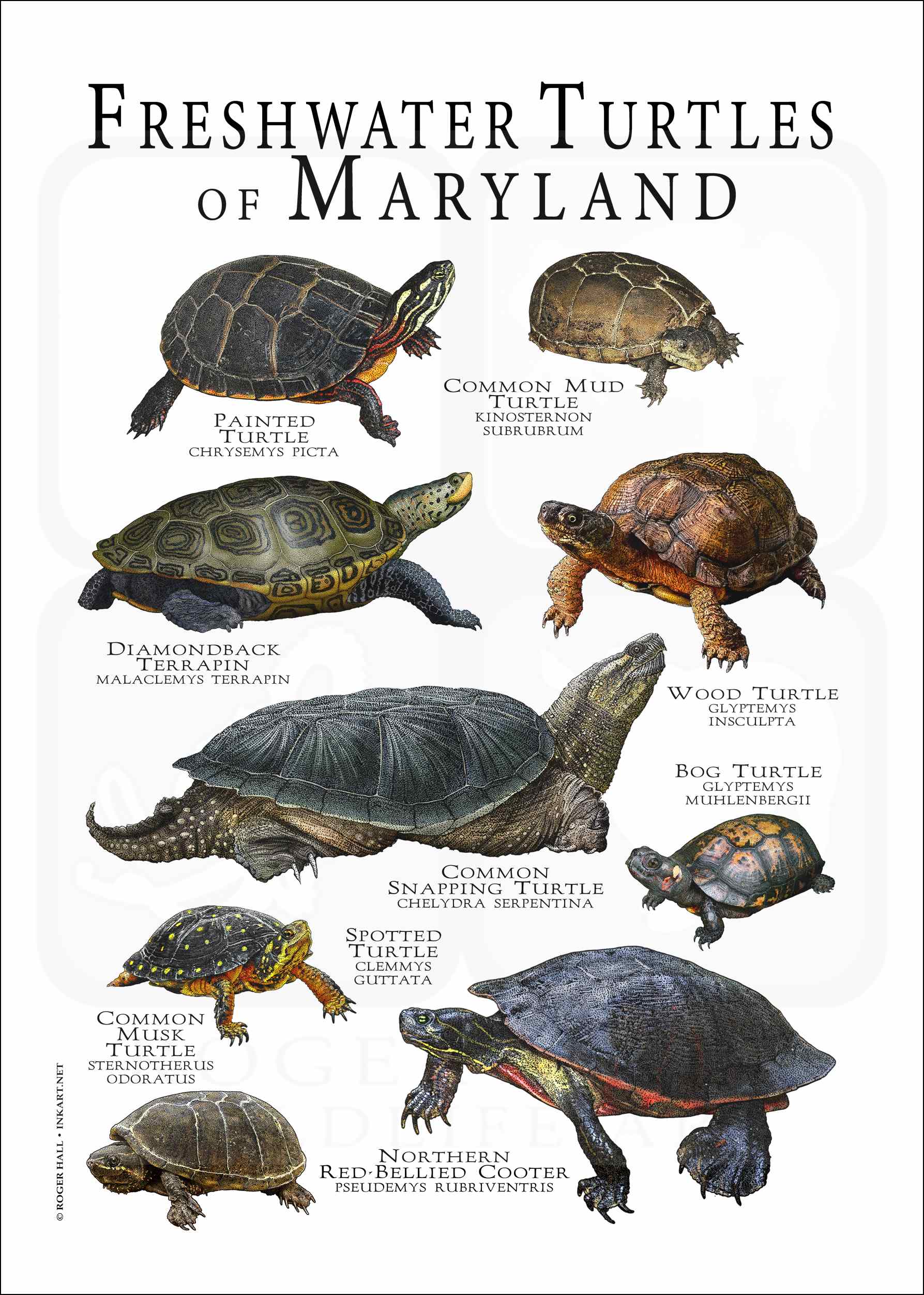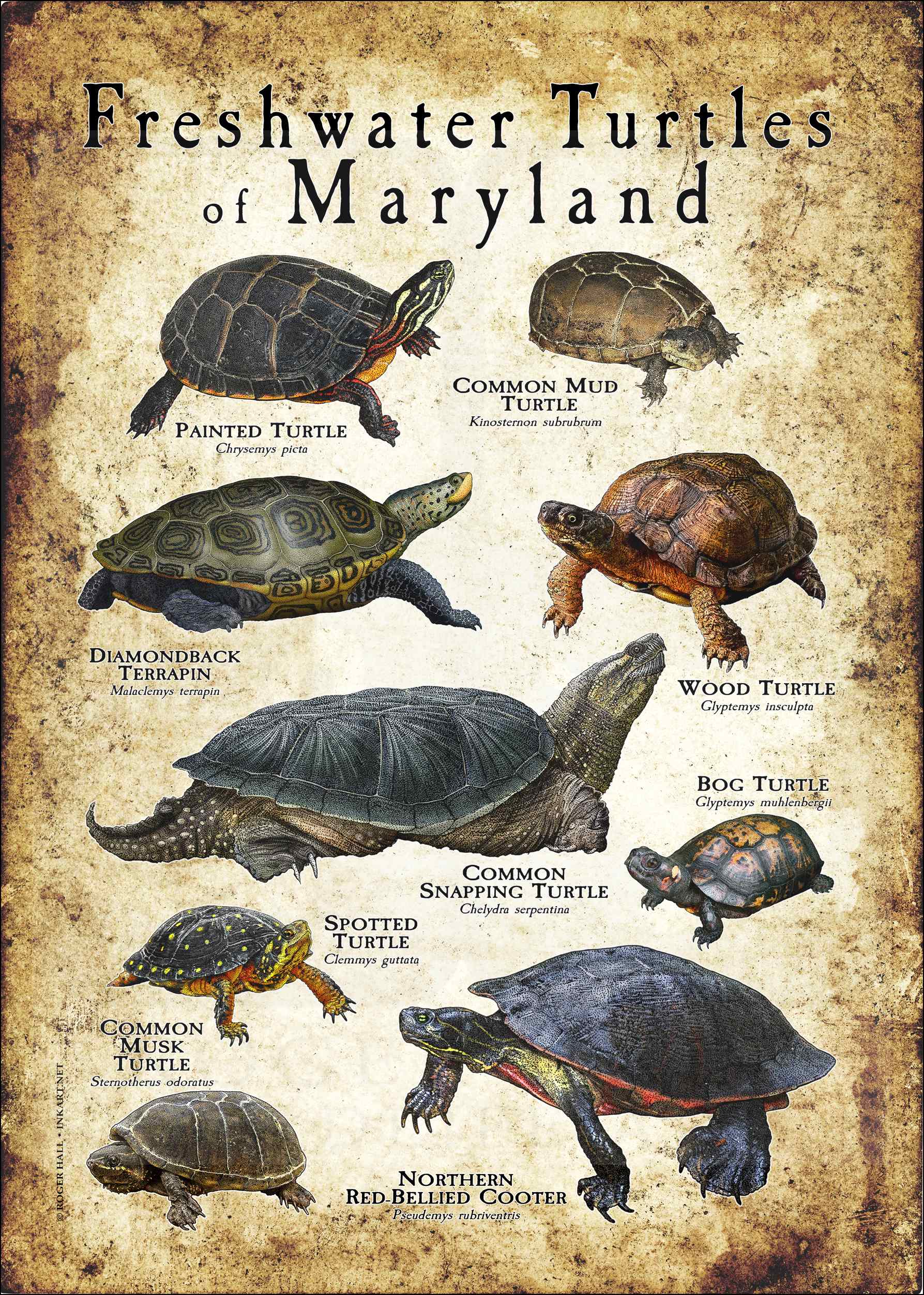 Fine art illustration of the all the freshwater turtles species native to Maryland in the USA.